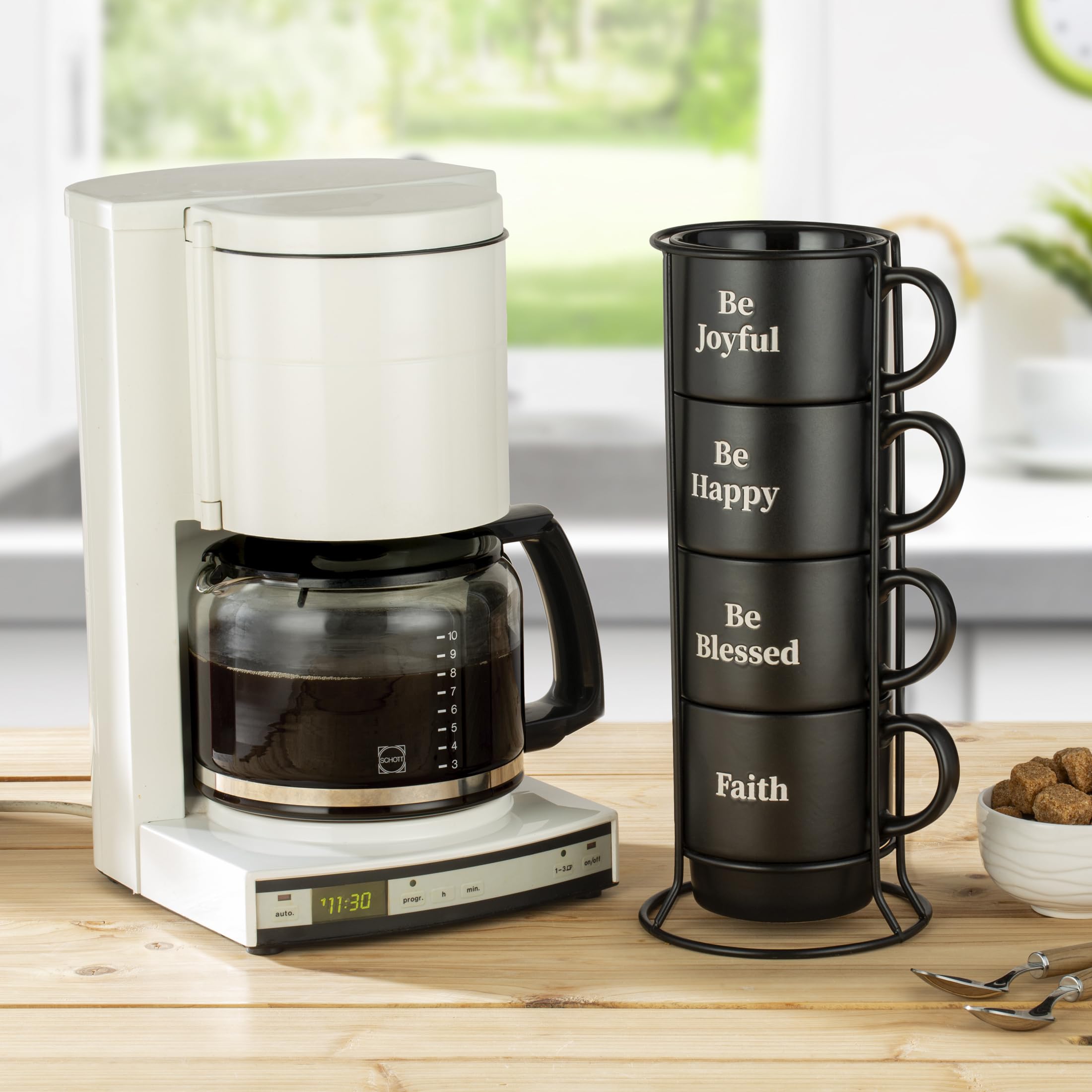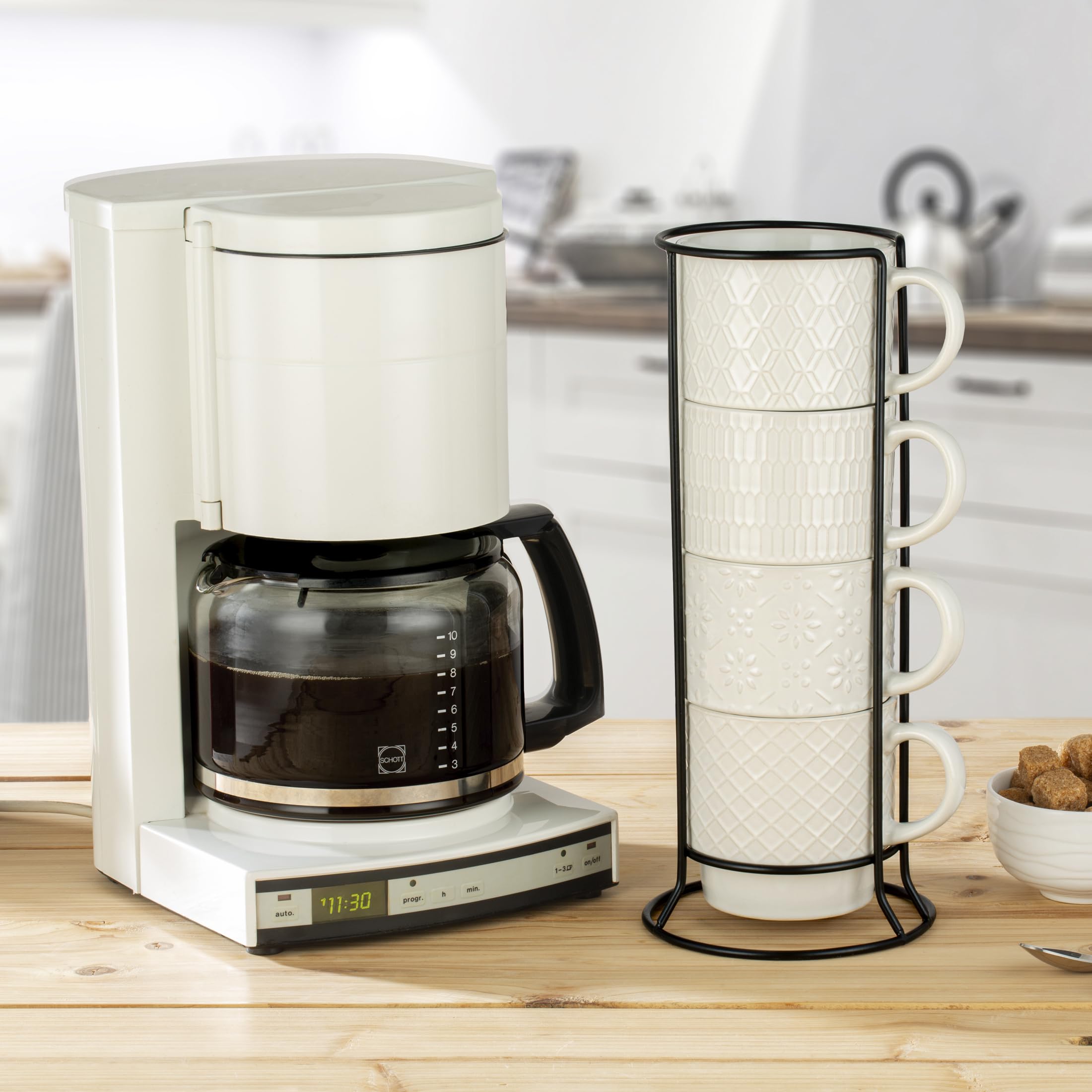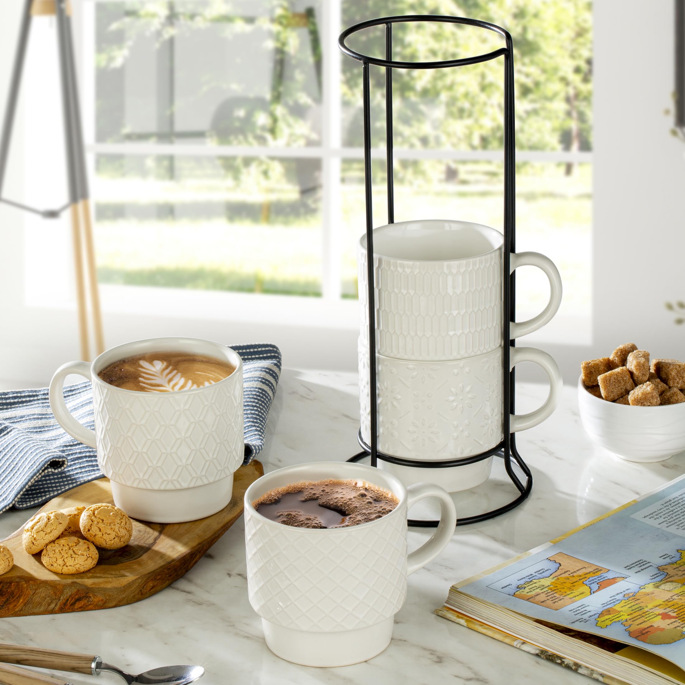 L'ensemble de tasses à café empilables en grès blanc gaufré dans un support en métal est parfait si l'espace est restreint sur votre comptoir de cuisine ou îlot de cuisine. Signature Housewares Ensemble de 4 tasses à café empilables Coffret 4 tasses à café 260 ml avec support de rangement en Dolomite Blanc Métal Blanc Motif indien Velorn marque Item International. Design empilable : quatre tasses s'empilent proprement et sont livrées avec un support en métal robuste. Pour nettoyer le support métallique, il suffit de l'essuyer avec une éponge humide. Avec la poignée, la tasse mesure 13,3 cm de large. Parfait pour une pendaison de crémaillère ou un cadeau d'hôtesse, chaque tasse est facile à nettoyer et passe au lave-vaisselle et au micro-ondes. Il peut aller avec n'importe quel décor de cuisine. Finition dans un beau vernis blanc brillant. Quatre tasses de grande capacité de 445 ml : parfaites pour les boissons chaudes telles que le café, le thé, le cappuccino, le chocolat chaud, l'eau et plus encore. Nos ensembles de tasses en céramique disposent de tasses empilables avec un support peu encombrant. Disponibles dans de nombreuses couleurs et motifs, ces tasses passent au four, au congélateur, au micro-ondes et au lave-vaisselle, parfaites pour le café, le thé ou le cacao de tous les jours Signature Housewares Lot De 4 Tasses à Café Empilables Blanches Entretien facile : passe au lave-vaisselle et au micro-ondes, le vernis brillant le rend facile à nettoyer et a un aspect riche.