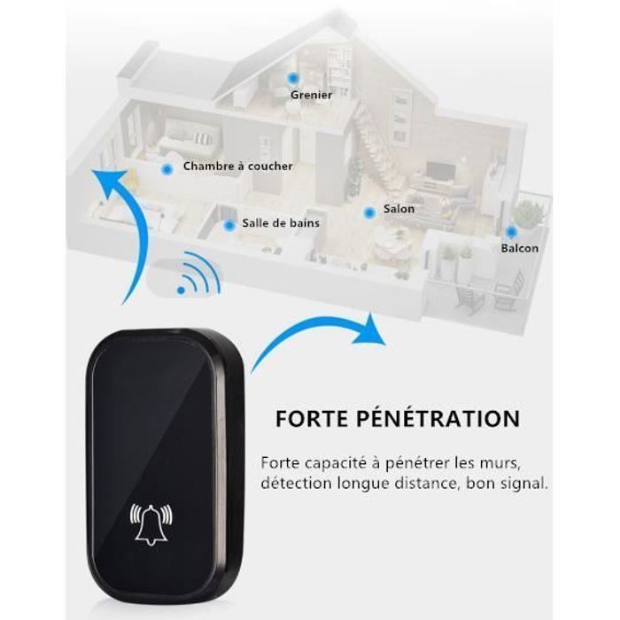 ☑️Tension d'alimentation du récepteur : 230 V ~, 50 Hz. Sonnette Wifi Sans Fil Exterieur Etanche KIT Sonnette Sans Fil Et Sans Pile Écologique Extérieur Étanche IP 65 Sonnette Extérieure Sans Fil Informations générales : ☑️ Type de transmission : sans fil. Orno Sonnette de porte sans fil WAYO AC Bouton connecté au réseau Sans... Le récepteur dispose d'un contrôle du volume à 6 niveaux avec jusqu'à 80 dB et 36 sonneries polyphoniques. Caractéristiques principales : sonnette sans fil étanche. La fonction du système d'apprentissage permet l'enregistrement des touches supplémentaires (max., 4). Aucune installation de sonnette n'est nécessaire. Batterie incluse (émetteur) : oui. ✅【 Utile dans de nombreux endroits 】 La cloche fonctionnera dans les maisons unifamiliales et multifamiliales, les villas, les bureaux ou les espaces commerciaux. ☑️Portée en zone ouverte : 300 m., Couleur : blanc. Utile dans de nombreux endroits La cloche fonctionnera dans les maisons unifamiliales et multifamiliales, les villas, les bureaux ou les espaces commerciaux. En outre, il convient galement aux personnes g es ou aux patients comme le bouton d'appel du personnel ✅ 【 Étanche et résistant aux intempéries 】Classe d'étanchéité IP44, cette sonnette de porte sans fil peut résister aux conditions météorologiques difficiles. ✅ 【 L'appareil avec le label de qualité 】 Le carillon a un certificat CE, qui prouve sa sécurité et sa fiabilité. L'appareil avec le label de qualit Le carillon a un certificat CE, qui prouve sa s curit et sa fiabilit . ☑️Tension d'alimentation de l'émetteur : 3 V (1 x CR2032). ☑️Classe de protection IP : IP44., Dimensions de l'émetteur (largeur x hauteur x profondeur) : 29/78/17,5., ☑️Fréquence : 433,92 MHz ± 20 kHz Autres caractéristiques : système d'apprentissage ✅【 Ne nécessite pas d'installation spéciale 】 Le récepteur, c'est-à-dire l'élément interne, est connecté directement à la prise de courant, vous n'avez donc pas à vous soucier de changer la batterie. SONNETTE SANS FIL Avec Pile Mini Sonnette de Porte 300M Étanche Kit de