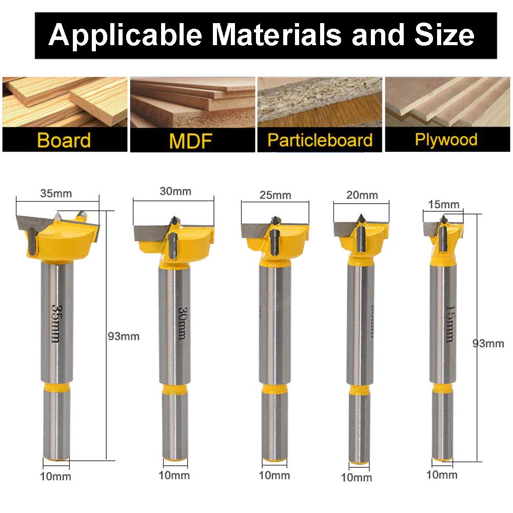 1., Comprend un foret de positionnement de 15 mm, 20 mm, 25 mm, 30 mm, 35 mm. Conseils : Les mesures étant prises à la main, les tailles indiquées peuvent varier légèrement., 2., La couleur peut varier légèrement en raison des différents écrans d'affichage. Caractéristiques du produit : ● Couleur : argenté. En acier au carbone avec pointe de centrage, ils percent sans effort et sans éclats. Parfaits pour les charnières de meuble, les étagères ou les projets créatifs Caractéristiques : 1. Coffret de 5 forets : Ce coffret comprend 5 forets Forstner de diamètres de perçage respectifs de 15 mm, 20 mm, 25 mm, 30 mm et 35 mm, pour une longueur totale de 90 mm. 2. Perçage rapide : La denture crantée réduit la friction et la chaleur, facilitant l'évacuation des copeaux et prolongeant la durée de vie du... Lot De 5 Forets Forstner 15-35mm - Pour Trous Plats Précis Convient pour une variété d'occasions, perforation sur bois, contreplaqué, produits en bois et produits en plastique., 2., Chaque foret est emballé séparément dans un sac en plastique avec de l'huile pour éviter la rouille. FESTOOL - Mèches forstner fb-Set-d 15-35 ce Contenu de la livraison : 1 boîte en bois. ● Matériau : acier allié ● Poids du colis : 440 g / 15,5 oz ● Taille du produit : 15/20/25/30/35 mm - Poignée ronde Dimensions de l'emballage : 16,5 × 11,9 × 4,1 cm. Le design en forme de dents de ce foret Forstner en acier rapide assure moins de friction et de chaleur.