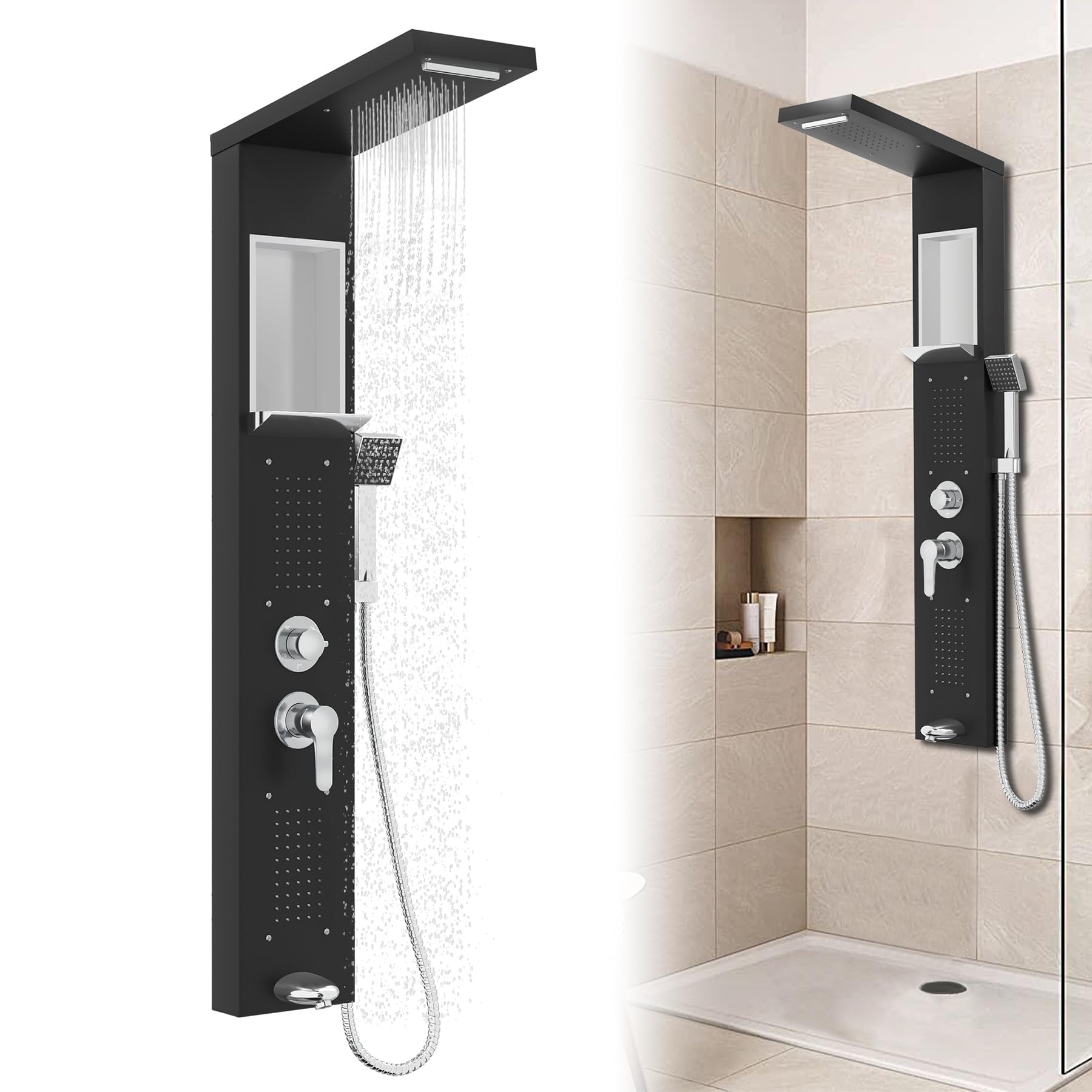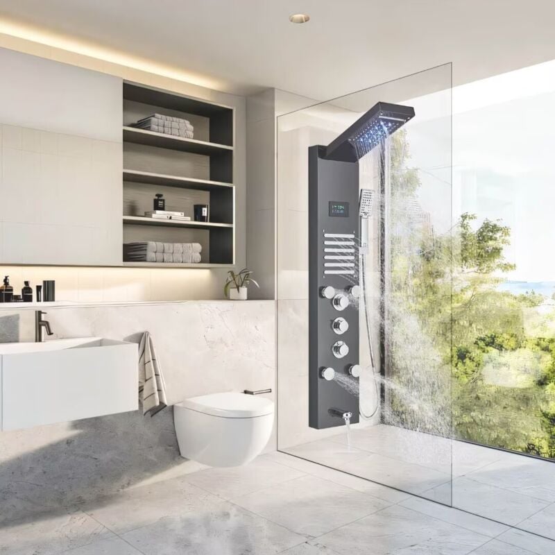 Système De Douche En Acier Inoxydable Douche à Effet Pluie Kit De Douche Avec Douchette A Main Or 85656216 Découvrez BA 13, votre nouvelle référence en matière de bricolage ! Dimensions après installation (HxLxP) : 115x15x47cm, longueur du tuyau : 150cm, connexions : 1/2 pouce. Convient pour une installation dans différents types de salles de bains. Froadp Panneau de douche en acier inoxydable - Système de douche 5 fonctions - Montage mural - Avec douchette à main, douche à effet pluie, douche de massage... Caractéristiques Longueur: 30 cm Largeur: 30 cm Hauteur: 15 cm Poids: 6.2 kg Matières: Laiton Couleur: Gris Finition: Brossé Forme: Carrée Longueur... Cette paroi de douche a une conception à double tuyau pour l'eau chaude et froide, ce qui permet de régler facilement la température de l'eau en fonction des besoins personnels. Plongez dans un univers où chaque article est conçu pour simplifier vos travaux tout en libérant votre créativité. 【Anti-calcaire】Toutes les buses de douche sont auto-détartrantes. Spécifications techniques:Matériau : acier inoxydable 304 avec surface brosséeCouleur: Blanc Mat/Noir Mat/Argent2 modèles : avec LED / sans LEDMéthode d'installation: montage muralFonction : douche pluie, douche cascade, douche massante, douchette à main. Kit Douche Panneau De Douche En Acier Inoxydable Brossé, Avec Effet Pluie Ensemble Douche 【Ensemble de panneaux de douche en acier inoxydable】peut choisir la couleur: argent/noir mat, blanc mat. 【Facile à utiliser】Le montage mural, y compris tous les accessoires d'installation, est très pratique. Les robinetteries sont chromées et toutes les sorties d'eau sont équipées de buses anti-calcaire. Antirouille et résistant aux températures élevées pour une durabilité. Il convient à une installation dans différents types de salles de bains, vous permettant de vous détendre physiquement et mentalement après avoir voyagé ou travaillé.