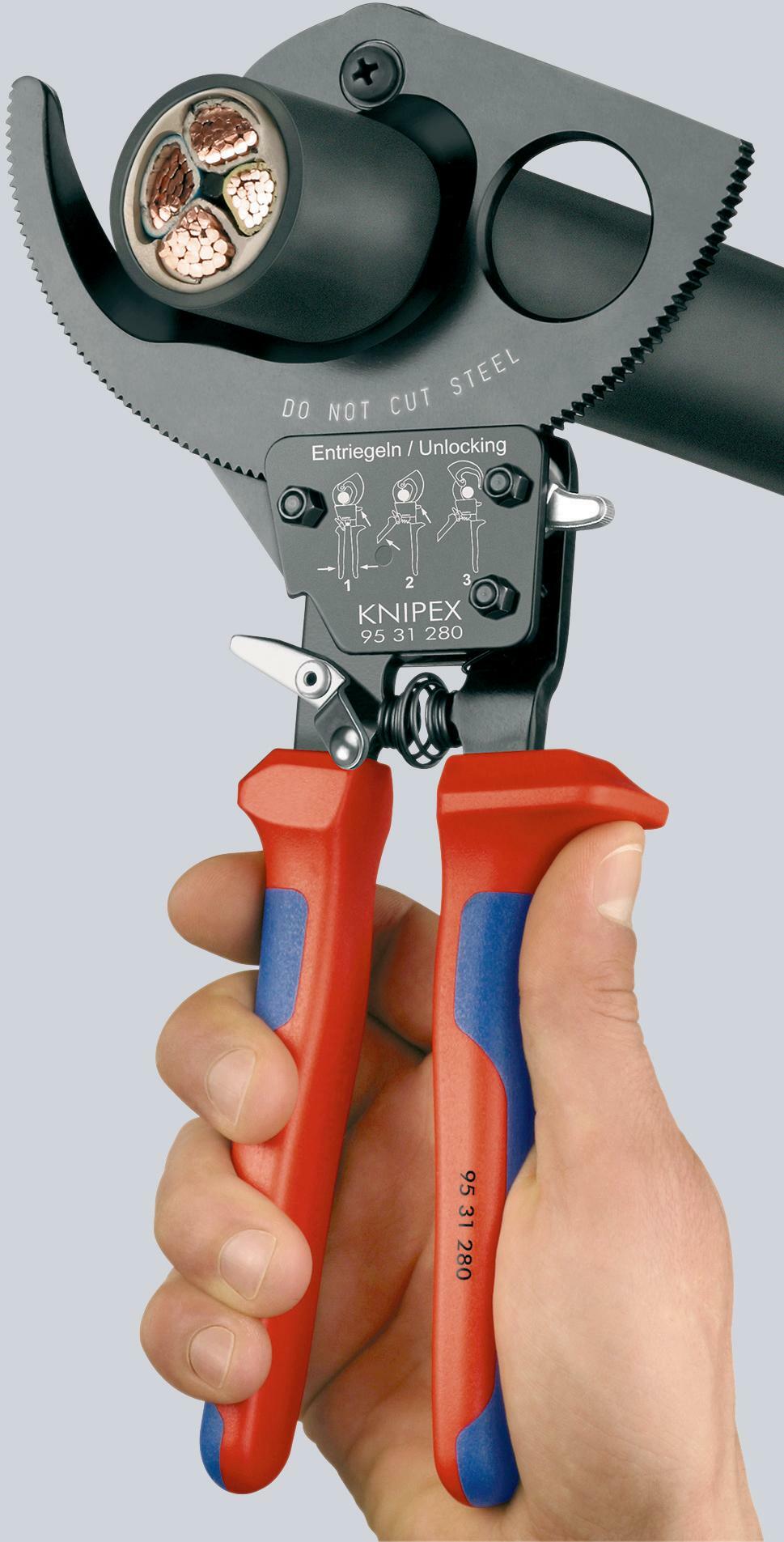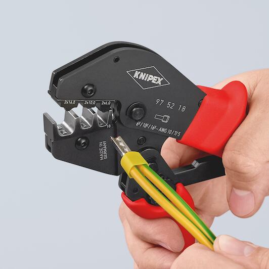97 52 10 Pince à sertirPour connexions électriques sans soudage. Prise à deux mains pour faciliter le sertissage des conducteurs de câbles de grand diamètre 97 52 06 EAN 4003773025474 Pince brunie Tête brunie Poignées avec gaines en plastique antidérapantes Poids 565 g Dimensions 250 x 70 x 25 mm conforme REACH contient SVHC conforme RoHS non applicable application cosses isolées, connecteurs manchons Capacité Millimètre carré 0,5 - 6 mm² nombre de positions de sertissage 3 AWG 20 - 10 Facilité d'utilisation absolue : précision... Pour connexions électriques sans soudage Douilles (diamètre): Ø 6,4 / 7,6 / 2,1 mm Jusqu'à 30 % d'effort économisé par rapport aux pinces à sertir standard grâce à une démultiplication par levier. nombre de positions de sertissage: 3, : 5,4 mm / 6,48 mm / 1,72 mm Qualité de sertissage toujours élevée grâce aux matrices de précision et au mécanisme de blocage forcé (déverrouillable) Bonne prise en main grâce à un centre de gravité bien placé, à sa tête coudée et à ses poignées ergonomiques. Type de câble: RG 58 / 59 / 62 / 71 / 223 Pince à sertir Knipex 97 52 06 - 250 mm Knipex Pince à Sertir également Pour Prise à Deux Mains Brunie, Avec Gaines En Plastique Antidérapantes 250 Mm 97 52 06 Pression de sertissage réglée avec précision en usine (étalonnée)