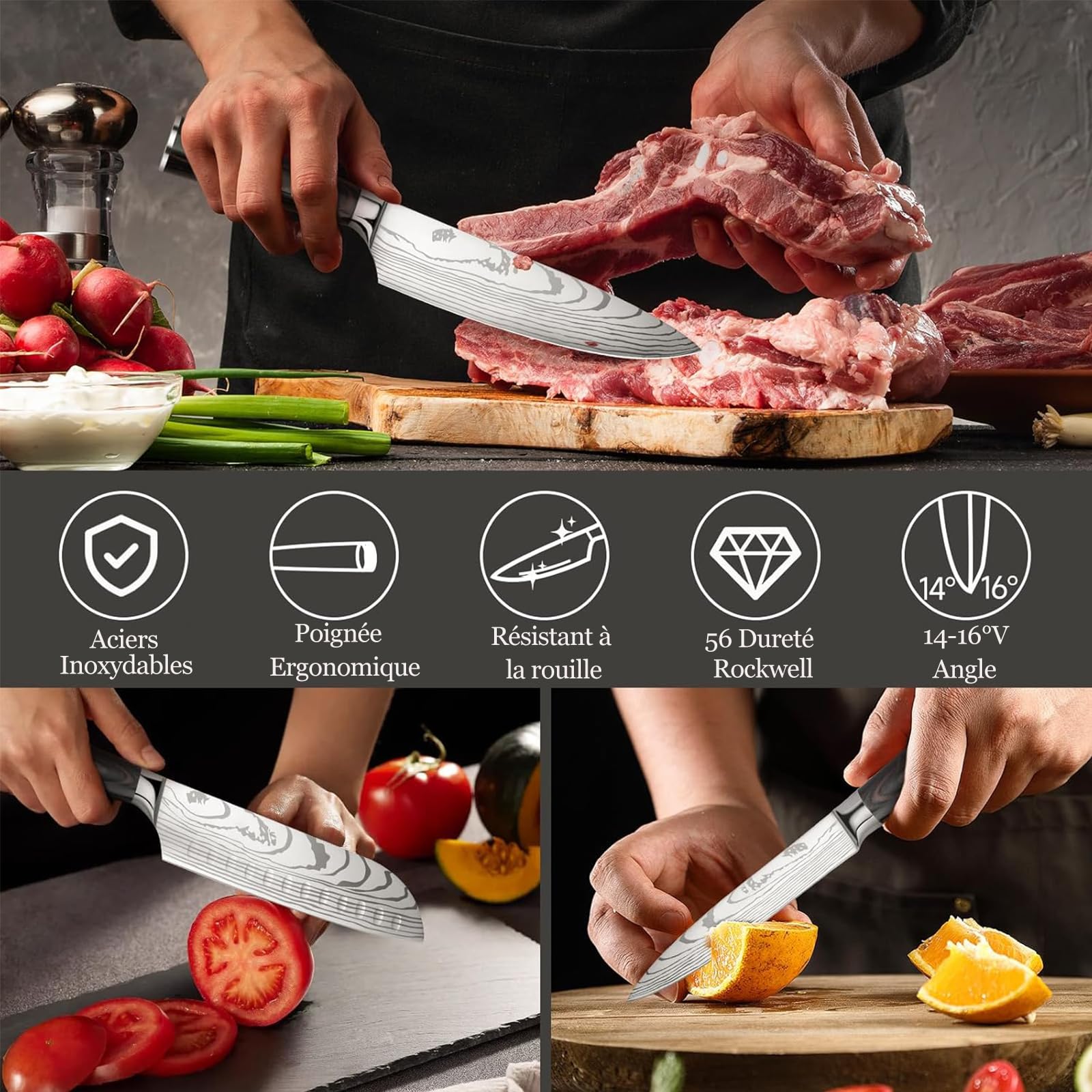 Poignée de Forme Ergonomique : la poignée est en bois de pakka. Le revêtement d'oxydation assure une surface antiadhésive, ce qui la rend facile à nettoyer. Très adapté aux professionnels et aux débutants.Bord tranchant : chaque lame de couteau est soigneusement affûtée, maintenant l'équilibre parfait entre une tranche ultra fine et une résilience maximale pour une coupe en douceur Vous pouvez trancher votre viande, vos légumes et vos fruits aussi finement que vous le souhaitez. Couteau Japonais Professionnel Couteau Cuisine Couteau Japonais Acier Inoxydable à Haute Teneur En Carbone Avec Poignee Ergonomique Couteaux De Cuisine Professionnel 8pcs Couteaux Japonais Ils possèdent une résistance exceptionnelle à la corrosion et à la rouille, et la lame reste tranchante même après une utilisation prolongée. Gustrug se concentre sur la qualité et les performances de coupe des couteaux. Acier Super Premium: Les Gustrug couteau de cuisine sont fabriqués en acier inoxydable à haute teneur en carbone, avec un indice de dureté de 58 Rockwell. Bon idéal pour tous vos besoins quotidiens en cuisine. Même après une utilisation prolongée, votre paume et votre poignet ne se fatigueront pas. Que vous achetiez pour vous-même ou comme cadeau attentionné pour vos proches, Gustrug set couteau cuisine est un excellent choix. Rendez votre travail de cuisine facile et efficace. iarku Enseble de 16 couteaux de cuisine avec bloc en acier inoxydable C'est un choix idéal pour les amateurs de cuisine. Si vous avez des questions ou rencontrez des préoccupations, veuillez nous contacter sans hésitation. Gustrug Couteau Cuisine 5 Pièces Set Couteau Cuisine avec Poignée... La lame intégrée est intégrée à la poignée douce et confortable, créant une prise parfaite pour minimiser la tension du poignet. Il vous offre une expérience d'utilisation sûre et confortable. Service Client 7/24h : chaque couteau bénéficie d'une assurance qualité supérieure. Notre équipe dédiée vous répondra rapidement dans les 24 heures.