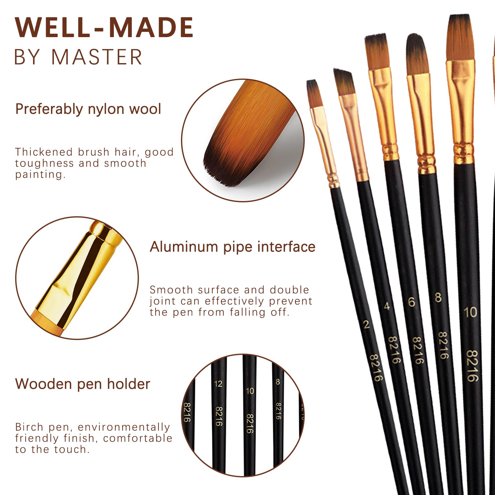 Poignées faciles à saisir 12 Brosses de tailles différentes] Par rapport à la plupart des brosses disponibles sur le marché, cet ensemble de brosses offre une grande variété de 12 formes et tailles de brosses pour vous aider à atteindre le résultat de peinture désiré. Il comprend un liner, plat, angulaire, filbert, poignard. [2... 【12 Brosses de tailles différentes】 Par rapport à la plupart des brosses disponibles sur le marché, cet ensemble de brosses offre une grande variété de 12 formes et tailles de brosses pour vous aider à atteindre le résultat de peinture désiré. Entretien facile : il est facile de nettoyer le pinceau artistique avec de l'eau chaude savonneuse et de remodeler la pointe après utilisation. Convient à tous les types de peinture : les pinceaux aquarelle conviennent à la peinture acrylique, à l'aquarelle, à l'huile et à la gouache. Fabrication de haute qualité : les poils en nylon sont résistants à la chaleur, à l'usure, flexibles, forte adsorption, coloration complète et uniforme, la tête du pinceau et la poignée sont reliés par un tube en aluminium à double fixation, surface lisse, pas facile à tomber et à rouiller. Ils sont linéaires, plats, carrés, noisettes, ronds, éventails et peigne. Un superbe cadeau pour les amateurs de peinture Formes de pointes polyvalentes : 12 formes et tailles de pinceaux différentes dans le lot de pinceaux. Ils sont également parfaits pour le nail art, la peinture du visage, les miniatures, les modèles, les statues, les échelles, les figurines d'action, les maisons de jouets, les pétroglyphes Lot De 12 Pinceaux Peinture Acrylique, Pinceau De Peinture à Formes de pointes polyvalentes : 12 formes et tailles de pinceaux différentes dans le lot de pinceaux. Ils sont linéaires, plats, carrés, noisettes, ronds... Ensemble de pinceaux de peinture à l'huile acrylique de qualité supérieure, pinceaux à pointe ronde et pointue, pour peinture à l'huile et à l'aquarelle, pour artiste, 5 pièces