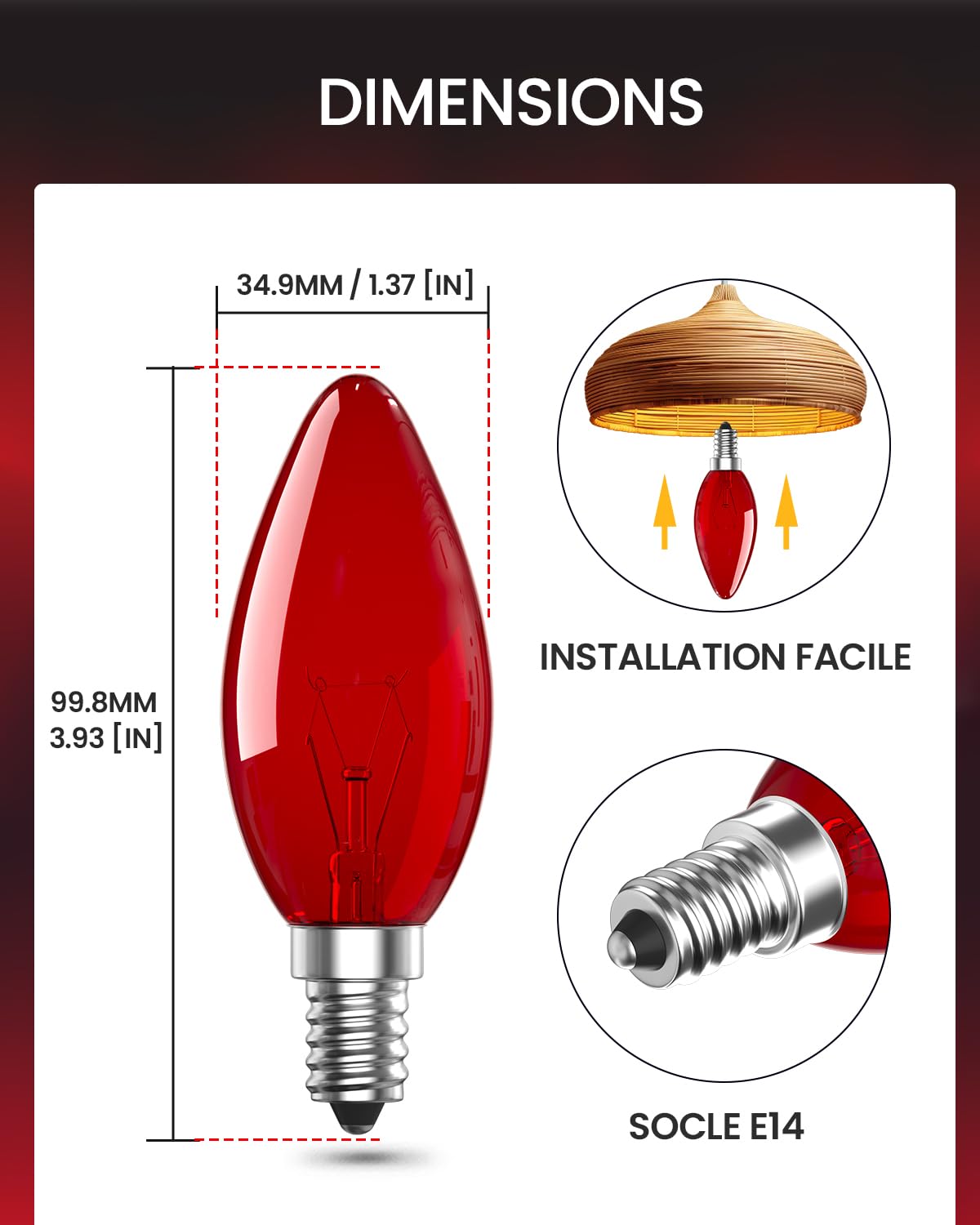Superbe éclairage Rouge Nos ampoules rouges E14 sont un excellent créateur d'atmosphère, qui émet une lumière rouge pure de qualité supérieure, créant une atmosphère relaxante et agréable. Description du produit Ampoule de Four SES E14 26W Spécification : Tension d'entrée : AC220-240V Puissance : 26,00W Taille : 18,2 * 53,3mm Poids : 6,6g Lumen : 169,38lm Couleur de la Lumière : 2700K CRI : Ra99,7 Base de Lampe : E14 Dimmable : OUI Paquet : Lot de 4 LumiGo Ampoules pour Four 26W SES E14 Applications multiples Livré chez vous au meilleur prix : LumiGo Ampoule Rouge E14 26W, Ampoule Colorée Rouge E14 C35 Dimmable Ampoule Bougie Rouge Lampe Décorative en Verre Rouge AC Installation facile - Avec une petite base à vis E14 standard, cette ampoule à bougie rouge est facile à installer, instantanée, sans scintillement. Large Application LumiGo ampoules à bougie rouge E14 dégagent une véritable lumière rouge vif, parfaite pour la veilleuse, l'ampoule de cheminée, l'ampoule à lueur, en particulier pour la décoration de fête de Noël d'Halloween, le mariage, le bar, l'éclairage de vacances et la Saint-Valentin. Remplace la lumière blanche douce ennuyeuse et apporte de la vitalité à la décoration intérieure. Vous pouvez ajuster la luminosité selon vos besoins. Achetez en Toute Confiance - Nous fournissons une garantie de 2 ans pour ces ampoules rouges. Dimmable Notre ampoule rouge E14 est compatible avec le gradateur. Dimmable - Notre ampoule rouge E14 est compatible avec le gradateur. Lumière Rouge Lot De 2 Ampoule Rouge E14 26W,Ampoule Colorée Rouge E14 C35 Ampoule Petit Culot à Vis Ampoule Rouge E14 26W,Ampoule Colorée Rouge E14 C35 Dimmable Ampoule Bougie Rouge Lampe Décorative En Verre Rouge Ac 220-240V Pour Lustre Halloween Noël... Ampoule Coloré À Incandescence E14 25W Leuci Sphère Rouge
