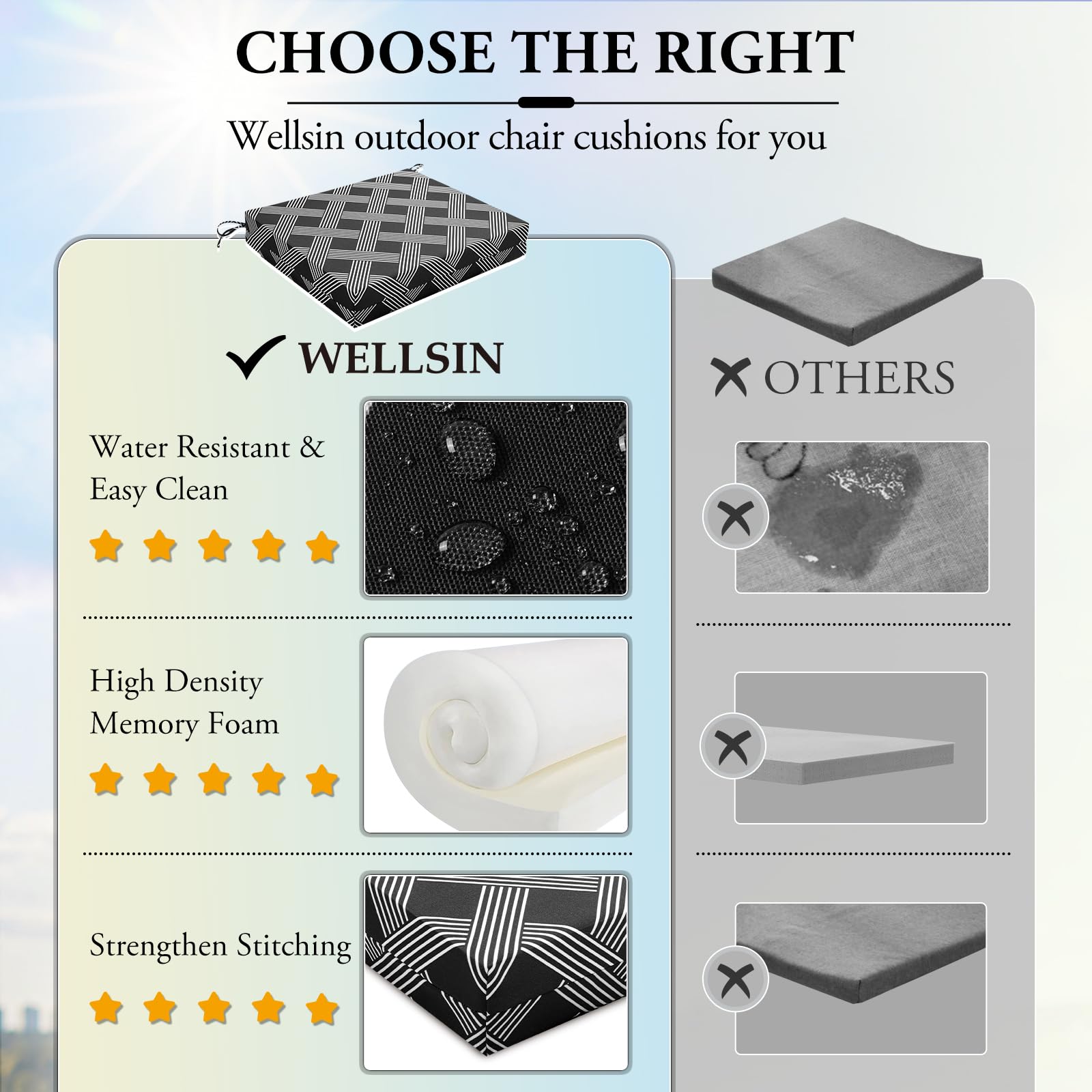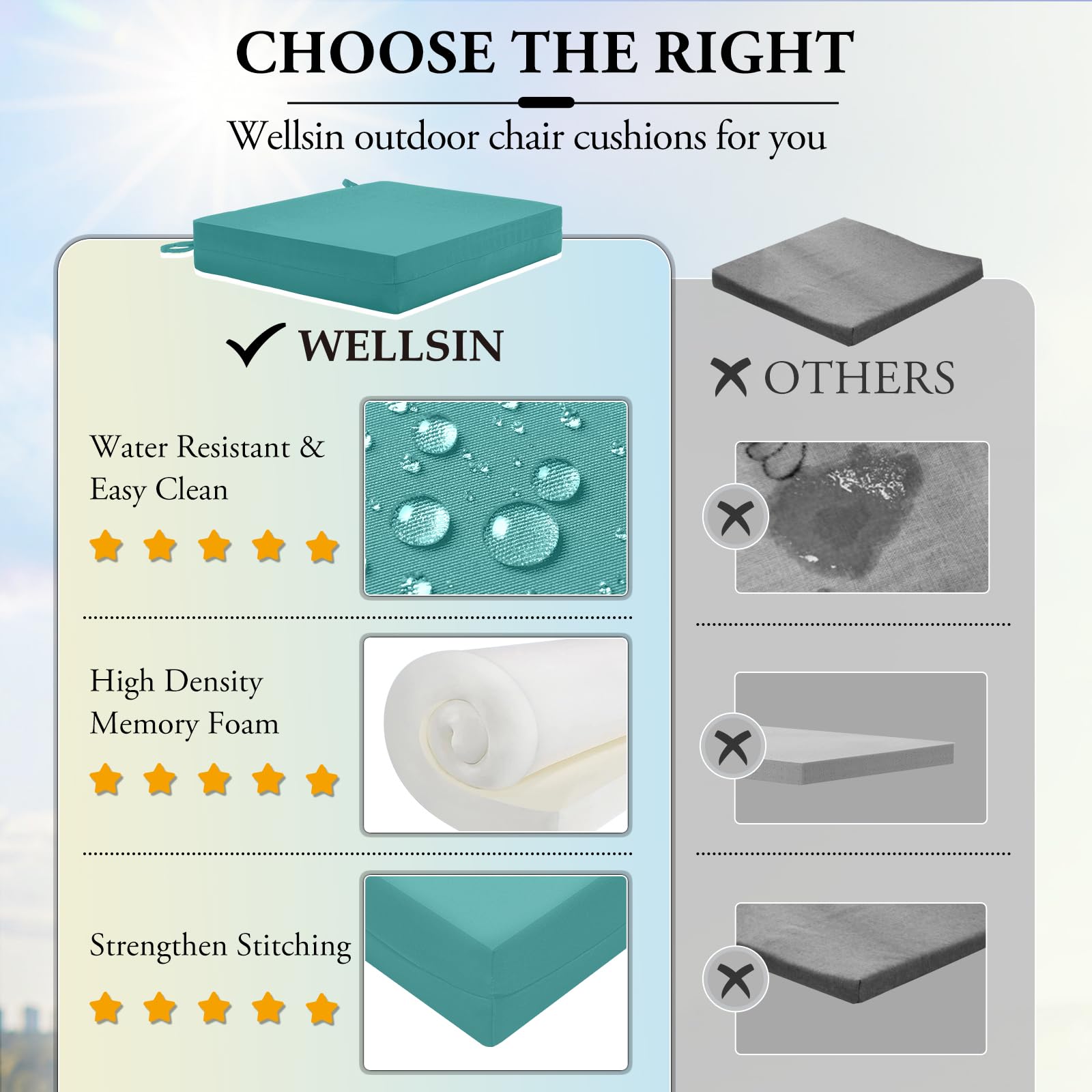 Largement utilisé en extérieur/intérieur : les coussins de chaise Wellsin sont conçus en différentes couleurs pour s'adapter à tous les décors ou styles, peuvent également transformer vos chaises dures en un meuble élégant et confortable, parfait pour la terrasse, le balcon, le jardin et l'intérieur. Lot De 4 Coussins De Chaise D'extérieur U2013 Le Coussin Wellsin D'angle Rond Mesure 43,2 X 40,6 X 5,1 Cm (l X P X H), Convient à La Plupart Des Chaises De... Coussins de chaises de patio de remplacement pour siège profond De plus, ces coussins de terrasse d'extérieur sont super faciles à entretenir et à nettoyer, il suffit de les essuyer doucement avec un chiffon humide et d'attendre qu'ils sèchent. Lot De 4 Coussins D'extérieur - Coussins De Chaise De Jardin A Dossier Haut Coussins De Siege Pour Interieur Et Exterieur Bleu Tissu 67331963fb29cba50f30e3c4 Rehaussez le style de vos chaises extérieurs et rendez-les plus confortables avec nos coussins d'extérieur . Nous vous offrons un vaste choix de tailles et de styles de coussins d'extérieur pour votre chaises de patio. Magasinez chez dès aujourd'hui Conseil : nous utilisons un emballage compressé pour économiser des ressources, vous recevrez une boîte avec 2 sacs sous vide à l'intérieur, et chaque sac contient 2 coussins de siège d'extérieur. Mousse à mémoire de forme de qualité supérieure : les coussins de meubles d'extérieur sont remplis d'une éponge de qualité de 7,6 cm d'épaisseur qui offre un soutien et un confort supplémentaires à votre corps pour enlever la pression sur vos fesses, réduisant la douleur dans le bas du dos, les hanches et le nerf sciatique.