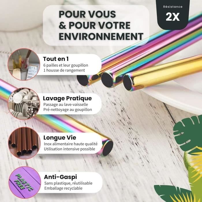 Contenu de la livraison : vous recevrez 4 pailles droites, 4 pailles courbées, 2 manchons de paille et 2 brosses à paille, la taille des pailles en acier inoxydable est de 31,5 x 0,8 cm, la taille de la brosse à paille est de 30 x 0,8 cm, les manchons de paille en silicone peuvent sceller les pailles en acier inoxydable pour la pénétration de la poussière pour éviter et garantir des boissons hygiéniques et sûres. Description du produit : Vous recevrez 4 pailles droites en acier inoxydable, 4 pailles courbées, 2 housses de paille et 2 brosses à paille. Paille Inox Professionnel 5pcs Paille Inox Bubble Tea Paille Metal Réutilisable En 304 Acier Inoxydable 12mm Large Paille Reutilisable Les pailles en acier inoxydable sont fabriquées en acier inoxydable 304, non toxique et inodore, bords lisses, résistantes à la chaleur et au froid, pas faciles à déformer, pas faciles à casser, pas faciles à décolorer, ne rouillent pas, durables Les pailles métalliques sont réutilisables, réduisent la consommation et le gaspillage de plastique, aident à protéger l'environnement et constituent une alternative parfaite aux pailles en plastique. La paille métallique convient aux gobelets de 30 à 40 oz et peut être utilisée pour les cocktails, les jus, le cola, l'eau minérale, les smoothies, le café, les milkshakes, le thé au lait et d'autres boissons chaudes et froides. 8PCS Pailles en Inox Réutilisables de 31 cm, Paille Inox Vous pouvez également les nettoyer avec la brosse de nettoyage de paille fournie. Paille inox - Mélie Co(o)p Les pailles en acier inoxydable sont l'alternative parfaite aux pailles en plastique. Pour faciliter le nettoyage en profondeur des pailles en acier inoxydable, vous pouvez également les brosser avec la brosse de nettoyage pour paille fournie. Contenu de la livraison : 8 pailles en acier inoxydable., 2 housses de paille., 2 brosses à paille. TRUEIN Lot de 8 pailles réutilisables pour gobelets Stanley en acier inoxydable et plastique, avec brosses de nettoyage et capuchons de paille, 30 cm... 8PCS Pailles en Inox Réutilisables de 31 cm, Paille Inox avec 2 Brosse de Nettoyage, transparent, sans BPA, pailles en acier inoxydable pour gourdes Design respectueux de l'environnement : nos pailles en métal sont réutilisables, réduisent l'utilisation et les déchets du plastique et contribuent à la protection de l'environnement. Caractéristiques du produit : Couleur : argenté.