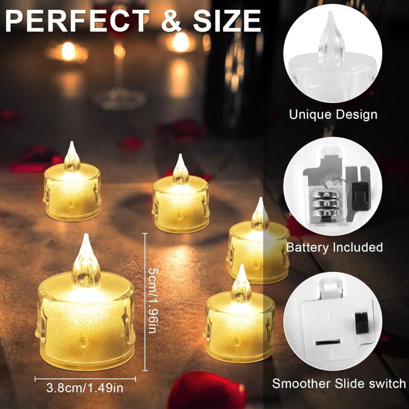 Nombreuses utilisations : les bougies chauffe-plat à piles sont parfaites pour décorer Halloween, Noël, mariages, fêtes, etc. Contenu : 100 bougies chauffe-plat sans flamme (blanc chaud). Poids de la bougie chauffe-plat : 8,5 g. Type de LED: 0,03 W / 3 V-0,03 W Pile : 1 pile CR2032 par lampe (incluse). La base a exactement la même taille qu'une bougie votive. Durée de fonctionnement : 100 heures et plus. Lumière jaune orangée. - Scintille comme une vraie bougie. - Interrupteur On-Off sur le dessous. - Dimensions : 3,5 cm diamètre - 3,7 cm haut. Superbes et... Vous recevrez un total de 16 bougies avec des ampoules LED en forme de flamme en blanc chaud - 8 bougies chauffe-plat et 8 bougies - et 32 piles boutons. Facile à utiliser : interrupteur marche/arrêt sur le fond, facile à allumer. Couleur de la lumière : blanc chaud. 【Scintillante et réaliste】Les bougies chauffe-plat LED ont un aspect réaliste et des lumières clignotantes et chaudes, ce qui peut créer une atmosphère romantique et chaleureuse. Bougies Chauffe Plat Lot De 24 Bougies LED Kemanga - Blanc Froid - Piles Incluses - Autonomie 100h - 3,4x3,6cm Bougie Led Flamme Vacillante La bougie chauffe-plat avec la flamme mesure environ 3,7 et la bougie environ 5,8 centimètres de haut. L'effet de flamme des LED imite le scintillement du vrai feu! Les décorations de bougies ici font danser des ombres intéressantes. Bougies Led Lot De 100 Sans Flamme, Jaune Chaud, 100 Bougies Chauffe-plat Led Une citrouille sculptée pour Halloween brille également et scintille dans la fenêtre d'une manière horrible! Dimensions des bougies chauffe-plat : 3,6 x 3,6 x 3,6 cm. Découvrez le coffret de 100 bougies chauffe-plat LED sans flamme, idéales pour une ambiance chaleureuse dans n'importe quelle pièce. Avec un diamètre de 34 cm... Effet de lumière : vacillante. Matériau : polypropylène. Parce que le scintillement donne à la lumière un aspect réaliste et crée exactement l'ambiance souhaitée.