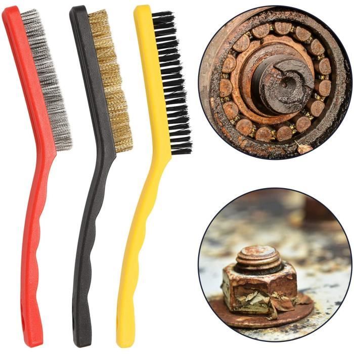 Brosses métalliques - Non spécifié - 6 pcs - Acier inoxydable - Brosses antirouille - Durable et polyvalent - Bricolage Couleur : jaune, noir, rouge., Dimensions : 17,5 x 2 cm., Caractéristiques : 1., Fabriqué en laiton, acier inoxydable et nylon, solide et durable, peut nettoyer complètement la rouille et les détails., 2., Convient pour nettoyer les zones étroites, les coutures, les fils et les joints soudés. Contenu de l'emballage : 2 brosses en acier, 2 brosses en laiton et 2 brosses en nylon. Adoptez la facilité et l'efficacité de cet ensemble complet de brosses métalliques pour tous vos besoins de nettoyage. Brosses Métalliques Lot De 6 Pour Nettoyer La Rouille On Brosse Metalique Ces pinceaux sont indispensables pour tout amateur de bricolage ou professionnel. Le trou pratique dans chaque poignée permet une suspension et un rangement faciles, ce qui rend ces pinceaux aussi pratiques que polyvalents. Parfait pour nettoyer les pièces en acier, les machines et les pièces métalliques non usinées, elles sont également idéales pour les travaux détaillés comme le nettoyage des espaces dans les cadres de portes, les portes coulissantes et les carreaux de sol. Les poignées ergonomiques et incurvées assurent une prise en main confortable et ferme, ce qui rend vos tâches de nettoyage à la fois efficaces et agréables. Chaque pinceau est conçu pour offrir une performance exceptionnelle, que vous vous attaquiez à la rouille, aux taches de peinture ou à la corrosion spéciale. Les brosses métalliques en acier inoxydable nettoient la rouille et les taches tenaces, les brosses en laiton sont efficaces sans rayer les surfaces métalliques, et les brosses en nylon sont parfaites pour nettoyer les surfaces délicates Robuste et durable pour une utilisation à long terme.