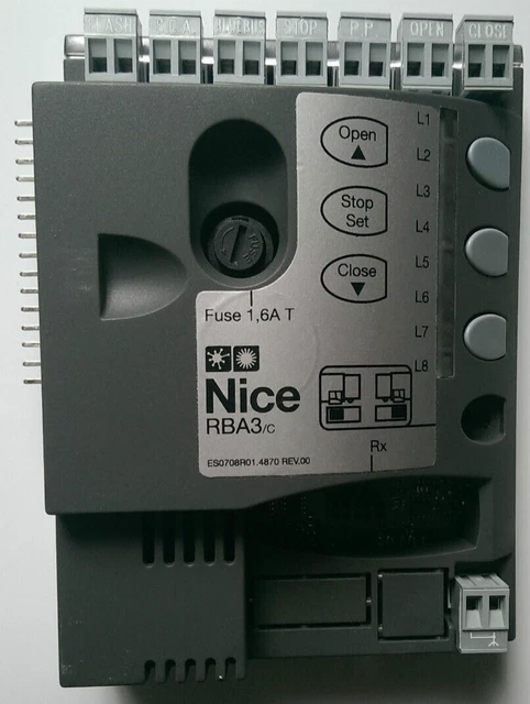La carte est uniquement compatible avec la série ROBUS 400/600. Placa Rb400 Rb600 Placa Repuesto RBA3/C Para Central Eléctrica En savoir plus Pièce détachée NICE : Carte électronique RBA3R10 pour moteur de portail coulissant NICE ROBUS400 / ROBUS600 / ROBUS1000 et RUN1500. La carte NICE RBA3R10 remplace les anciennes électroniques RBA3/C, RBA3/A et RBA3/B. Description des connexions électriques FLASH : sortie pour clignotant type LUCYB ou similaires avec l'ampoule 12 V maximum 21 W. S.C.A. : sortie... Telecommande Nice Nice Nice Centrale Robus Run Rb600 Rb400 Rba3/C Replacement Digicode Nice Micro contact 1617 pour ROBO et ROBUS NICE. En stock. Pièces pour NICE ROBUS 600 RB600. Micro contact 1617 pour ROBO/ROBUS/RUN/THOR. Nice. MICROI.1617. 4,56...