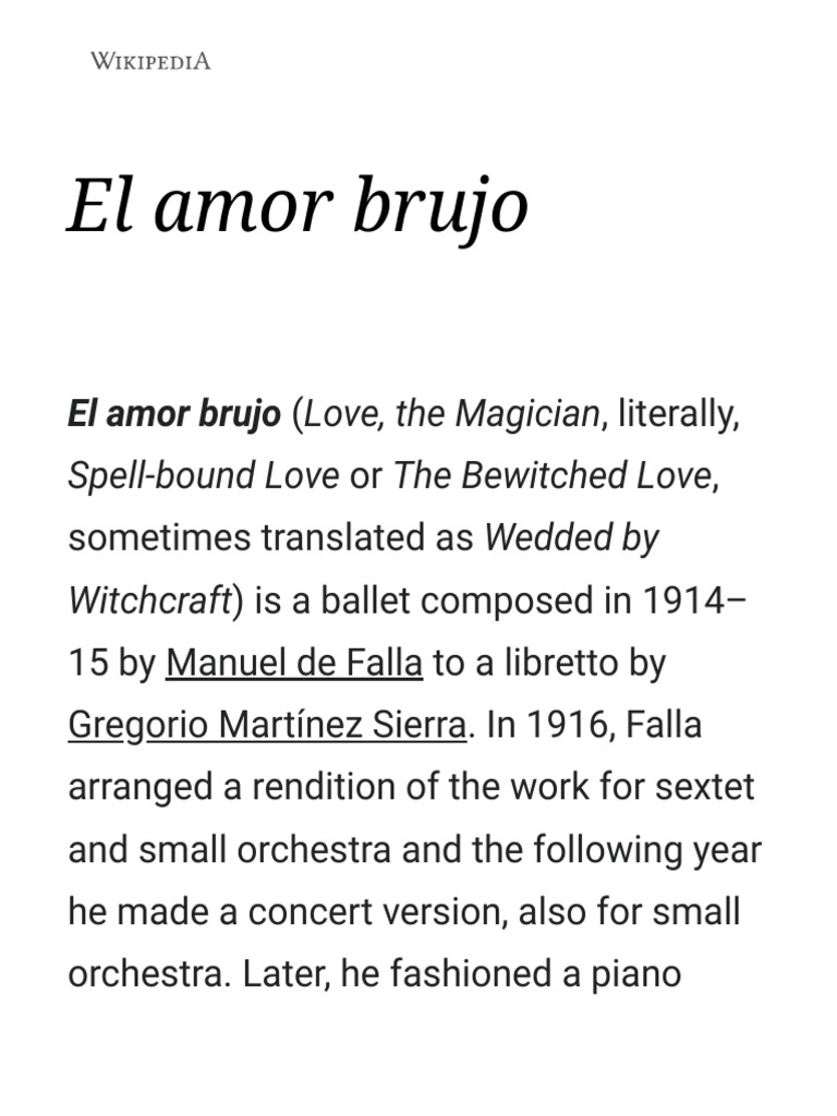 El Amor Brujo, Escencias de la Música de Manuel De Falla - Enrike Solinís, Euskal Barrokensemble Desenho de Amor Fácil para imprimir, colorir e se divertir - Artesanato... Afina Tus Oidos: EL AMOR BRUJO MANUEL DE FALLA Overview Falla's showpiece El Amor Brujo (The Phantom Lover) was first composed as a gitaneria for voice, actors and chamber orchestra in 1914-15. He later prepared a version for voice and orchestra which was premiered the next year. This was in turn transformed into a one-act ballet for voice and orchestra, which is how it is usually performed today. The new vocal score offered here is a...