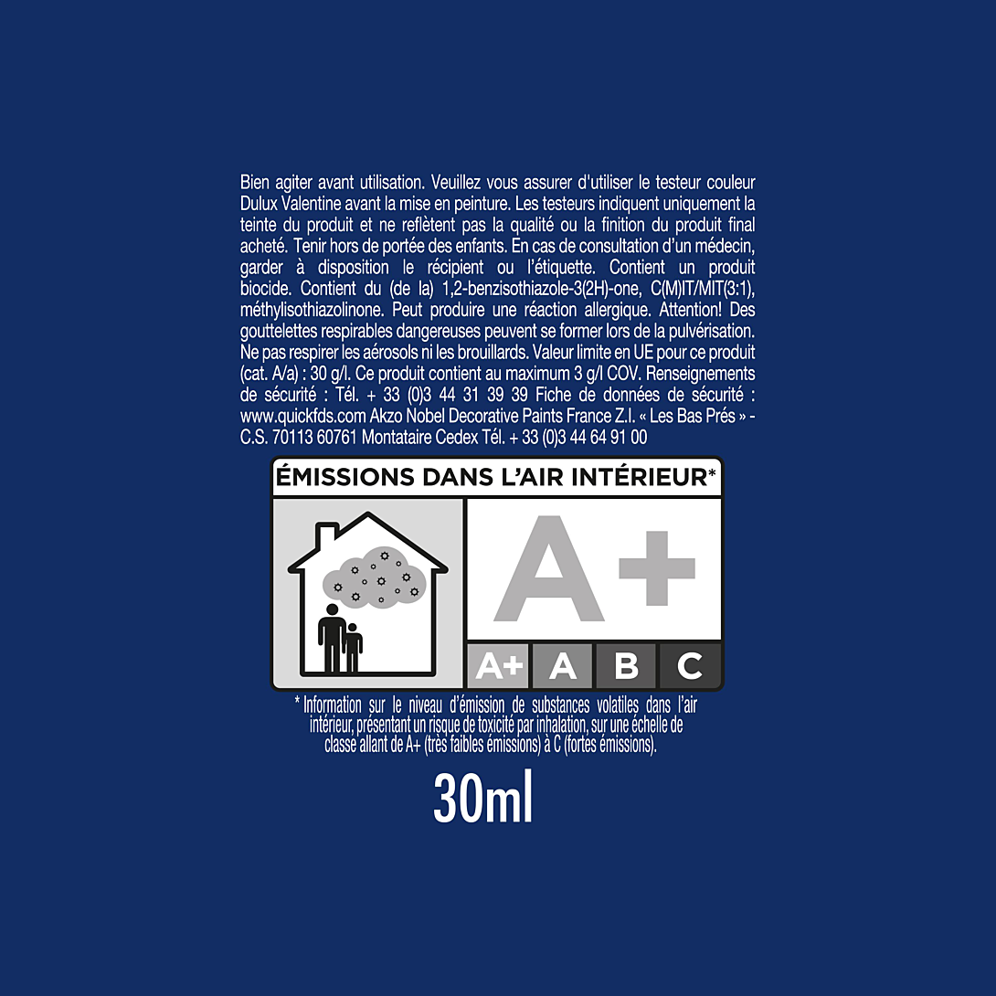 Testez avant d’acheter ! Le testeur de Dulux - vous permet de tester votre couleur ou vos associations de couleur directement chez vous dans votre intérieur. Vous pourrez donc être sûr d'avoir choisi la teinte exacte qui s'accorde le plus avec votre décoration et votre mobilier Vous pourrez donc être sûr d'avoir choisi la teinte exacte qui s'accorde le plus avec votre décoration et votre mobilier. Peinture Blanche Mur Testeur De Peinture Color Resist Cuisine Dulux Valentine Mat écru 30ml Peinture Retouche Mur Blanc Dooitch - Testeur de peinture Color Resist murs et boiseries Dulux Valentine mat gris parfait 30ml Le testeur de Dulux Valentine vous permet de tester votre couleur ou vos associations de couleur directement chez vous dans votre intérieur. Dulux 5268045 Once Testeur de Peinture, Indémodable, 30 ML (Pack of 1) : : BricolagePolitique de retour Politique de retour Si vous n'êtes pas satisfait d'un produit que vous avez commandé auprès d' ou si celui-ci est défectueux ou endommagé, vous pouvez nous le retourner sous 30 jours suivant la date de livraison, et nous vous rembourserons ou remplacerons l... Idéal pour choisir une nouvelle couleur. Quantité : 30 ml, couleur : temps - moins., Une couche , Séchage rapide , Facile à appliquer , À base d'eau