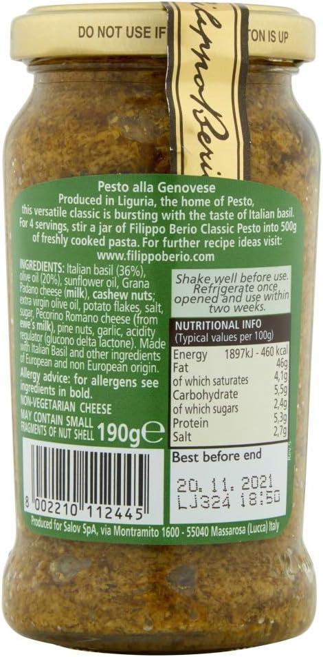 Description du produit Pesto classique : produit en Ligurie, Italie, la maison originale du pesto, ce pesto classique génois regorge de la saveur du basilic italien frais. Recette authentique : fabriqué à partir d'une recette génoise traditionnelle, ce pesto classique regorge de la saveur du basilic fraîchement cueilli Filippo Berio Pesto Classic, 190 Gr (Pack De 2) - - El Supermercado 100% Online De Panamá Produit en Ligurie, en Italie, la patrie d'origine du pesto, seuls les meilleurs ingrédients entrent dans un pot de Filippo Berio Pesto. Notre dévouement aux recettes italiennes authentiques distingue ces saveurs et ferait la fierté de notre illustre fondateur Pesto classique : produit en Ligurie, Italie, la maison originale du pesto, notre dévouement à des recettes authentiques distingue ces saveurs et rendrait notre illustre fondateur fier Filippo Berio Truffle Pesto Filippo Berio Classique Pesto 190g (pack De 6 X 190g Filippo Berio Classic Pesto Sauce Ajouter des huiles d'olive Filippo Berio à la recette pousse la saveur encore plus loin Mode d'emploi Bien agiter avant utilisation. Il peut également être utilisé pour ajouter de la saveur de pommes de terre en cape, sur un buschett ou faire revivre des sandwichs et des soupes. Mélangez 6 à 8 cuillères à café du Pesto classique dans des pâtes ou du riz fraîchement cuits. Salsa Pesto Filippo Berio Tomate Y Ricota De 190G
