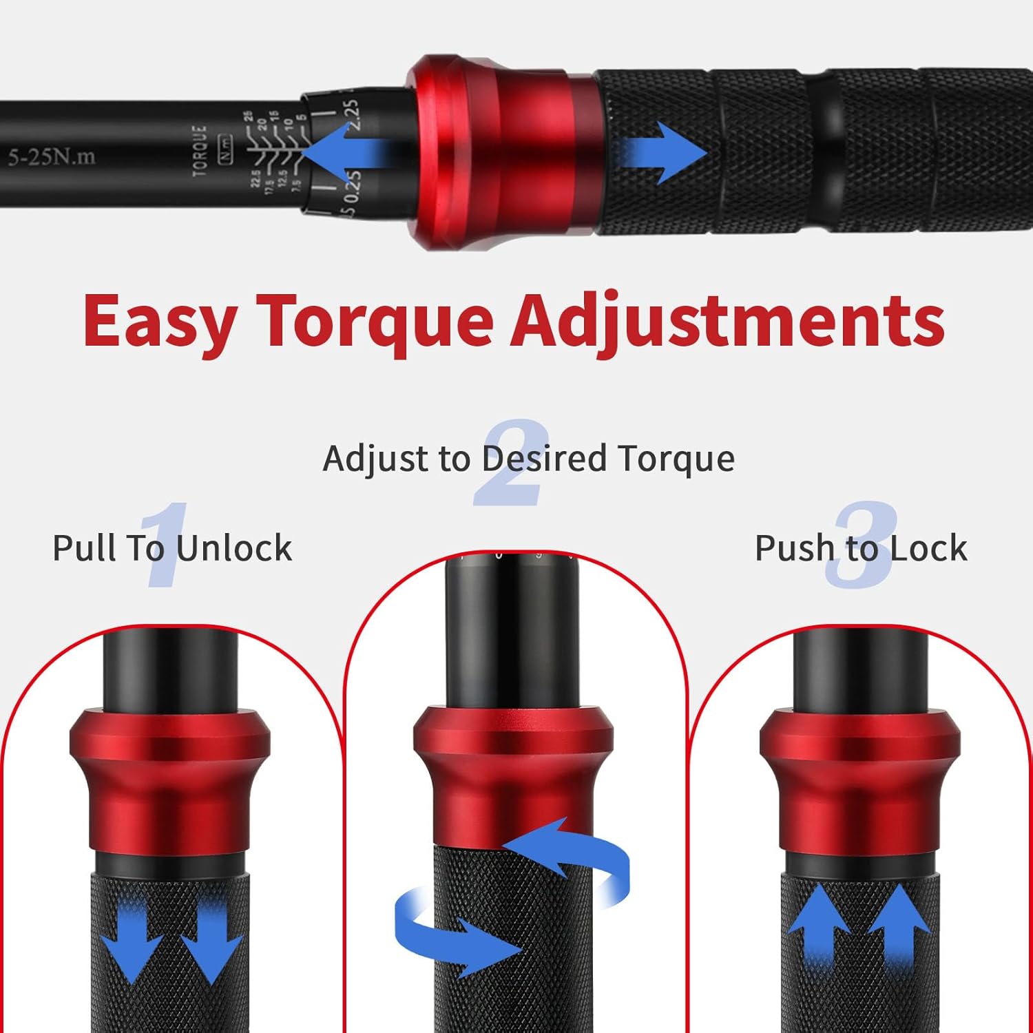Description du produit DIYLAND Jeu de clés dynamométriques 1/4 Lorsque le couple de serrage prédéfini est atteint, la clé déclenche en émettant un clic audible, indiquant à l'utilisateur de cesser le serrage. Elles sont appréciées pour leur précision, mais nécessitent une écoute attentive du clic pour éviter un serrage excessif Passez à l'achat d'une clé dynamométrique de marque et de qualité tout en préservant votre portefeuille. Largement utilisé : la lame sur la tête de la clé dynamométrique bidirectionnelle réglable peut être ajustée à la direction d'utilisation à tout moment, de sorte que la clé peut être utilisée dans le sens des aiguilles d'une montre et dans le sens contraire des aiguilles d'une montre, pour répondre à vos différents besoins opérationnels. Les échelles à double plage à contraste élevé avec une précision pré-calibrée de ± 3 % et des lectures jusqu'à 0,1 aident à garantir que les composants du vélo sont serrés au bon couple et que la force de serrage est uniformément répartie sur chaque surface de serrage. Double échelle de contraste élevé avec une précision pré-calibrée de ± 3 % et des lectures jusqu'à 0,1 Précision du couple : réglage précis du couple de 2,0 Nm à 24,0 Nm pour une large gamme d'applications, avec des composants montés avec précision calibrée - plage de couple de 2,0 Nm à 24,0 Nm par incréments de 1,0 Nm. Lorsque vous ne vous en servez pas, desserrez la bague de verrouillage de la clé et ajustez la clé à la valeur de couple minimale pour prolonger la durée de vie de la clé dynamométrique. Matériau durable : tête à cliquet durable fabriquée à partir d'acier allié au chrome vanadium trempé (Cr-V) ; surface chromée brillante entièrement polie facile à nettoyer et résistante à la rouille et à la corrosion. Accessoires polyvalents : comprend des clés hexagonales : H3, H4, H5, H6, H8, H10 ; clés prune : T10, T25, T30 ; 1 barre d'extension de 120 mm ; 1 clé dynamométrique de haute précision 1/4 (2-24 N. Clef Dynamometrique Clé Dynamométrique 1/4" 3-33 Nm - Noir - Acier Allié - Signal De Clic Cle Dynamometrique Facom Clé Dynamométrique Réglable 3 Types Clé Dynamométrique... Réparation Cycle Clé Dynamométrique 1/4 DIYLAND 2-24Nm - Précision 3% Pour Vélo Moto Coffret Clés Allen