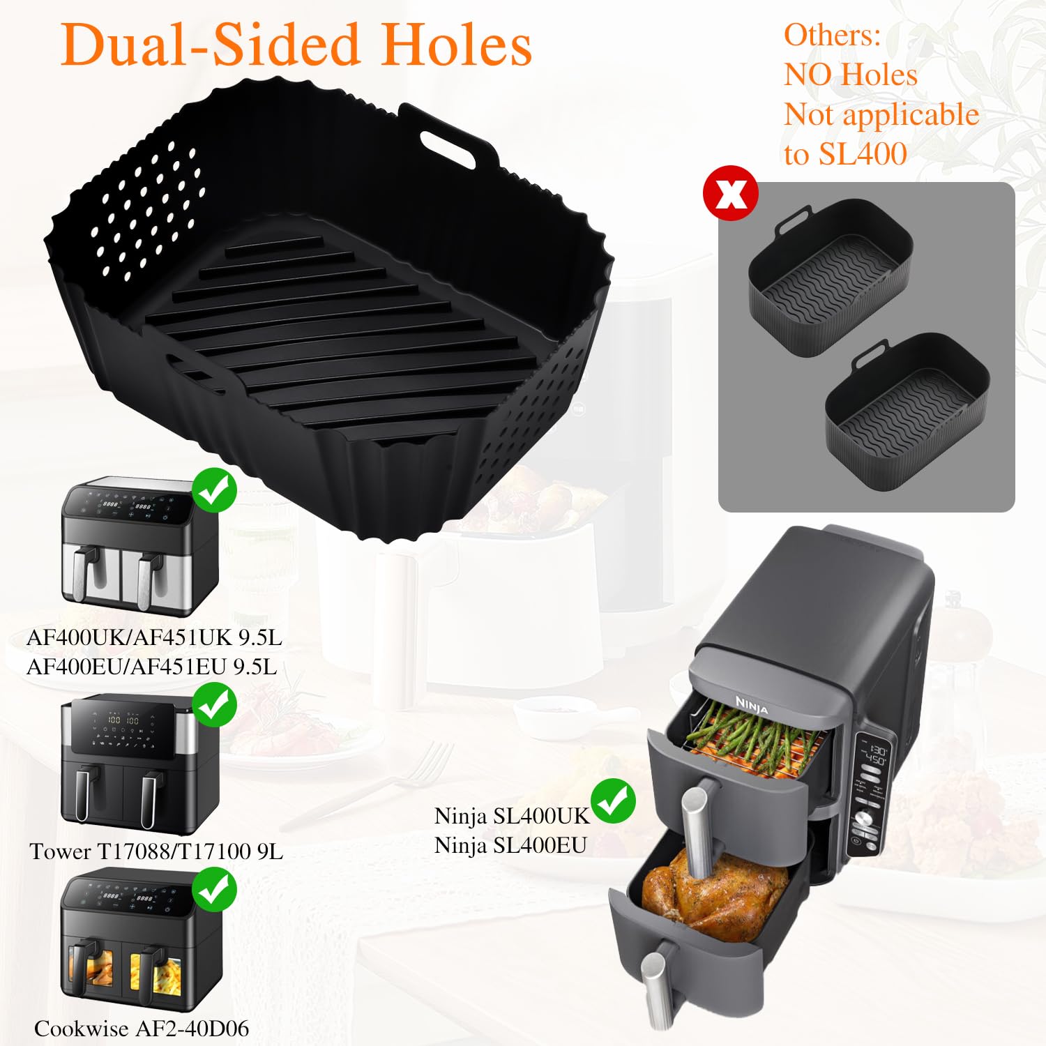 【Ajustement Parfait】 Taille: 2 Pièces chaque:19x15x7 cm (L*P*H). Conçu spécialement pour la Ninja Double Stack XL 9,5L Air Fryer SL400EU. Ils sont antiadhésifs, non toxiques et sans BPA. Cet accessoire pour friteuse à air n'est pas seulement idéal pour les friteuses à air, mais convient également pour les fours, les micro-ondes, les réfrigérateurs et les cuiseurs à vapeur, ce qui les rend très polyvalents Accessoire de friteuse à air chaud Ninja Double Stack XL SL400EU, Airfryer Moule en silicone pour friteuse à air chaud Foodi Max Dual Zone AF400EU, Princess 8L, Innsky 8L, LLIVEKIT 9L, EMERIO 9L 【Conception de Trous Double Face】 Spécialement conçue pour la friteuse à air Ninja Double Stack XL 9,5L SL400UK, vous pouvez la placer sans effort sans vous soucier de l'alignement. 2 Pièces Moule Silicone Air Fryer pour Ninja Double Stack XL SL400EU, Airfryer Accessoires pour Foodi Max Dual Zone, Moule Silicone Airfryer Pot pour... Vous pouvez désormais cuisiner en toute simplicité et apprécier le goût ! Les poignées des deux côtés protègent les mains des brûlures et facilitent le retrait de la friteuse. ❤Conseil : Veuillez mesurer votre friteuse à air avant d'acheter. Ces revêtements peuvent supporter des températures de -51 C à 240 C, assurant une cuisson sûre et saine. 2 Stück Silikonform Heißluftfritteuse für Ninja Double Stack XL SL400EU Moule Air Fryer Ninja Moule Silicone Air Fryer Pour Ninja Double Zone 7.6L-10.4L Accessoires Ninja Friteuse à Air Convient également pour Foodi Max Dual Zone AF400EU AF300, Innsky IS-AF008, CHEFREE 8L AFW20, Cecotec/LLIVEKIT double Air Fryer 9L.