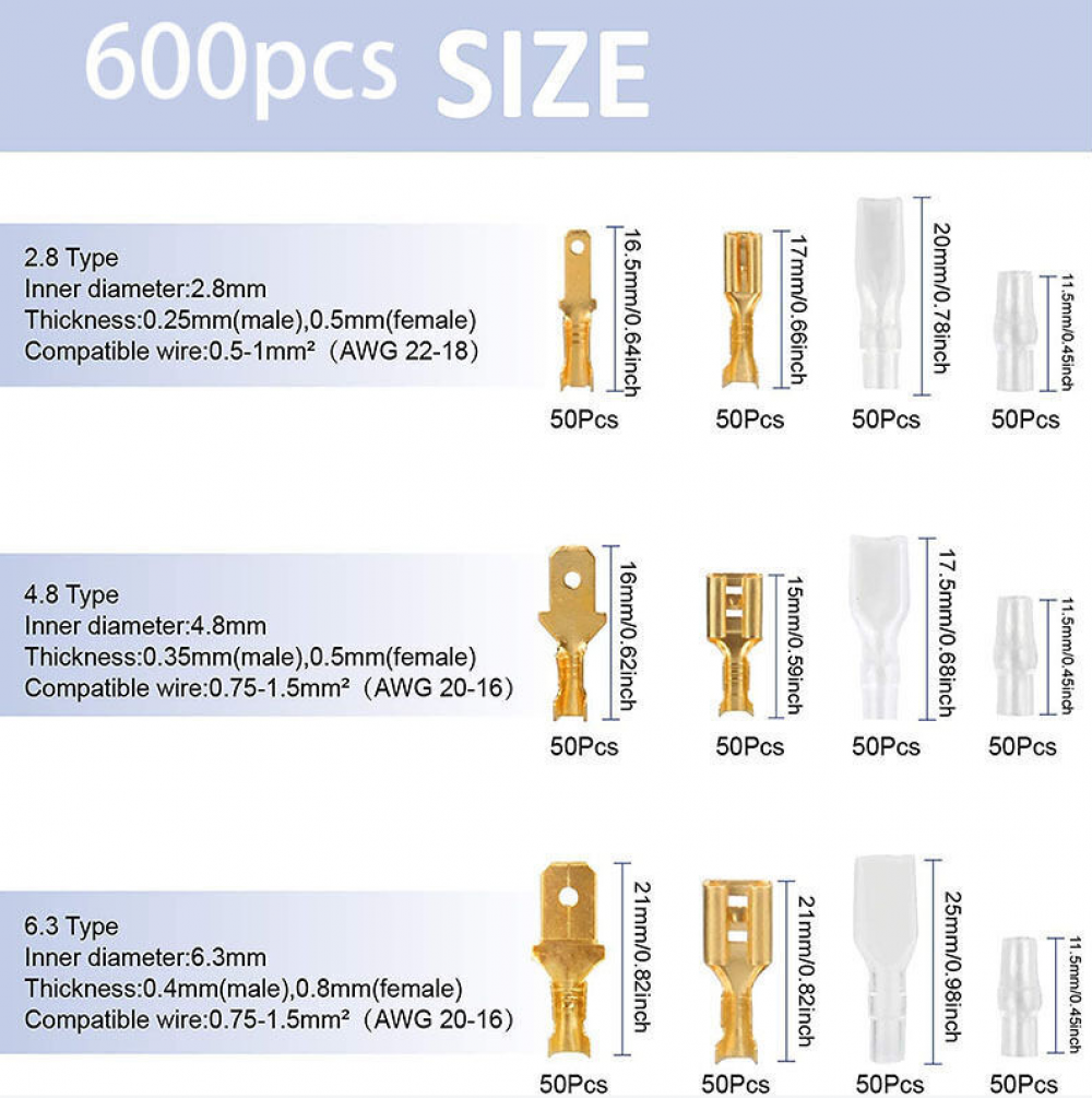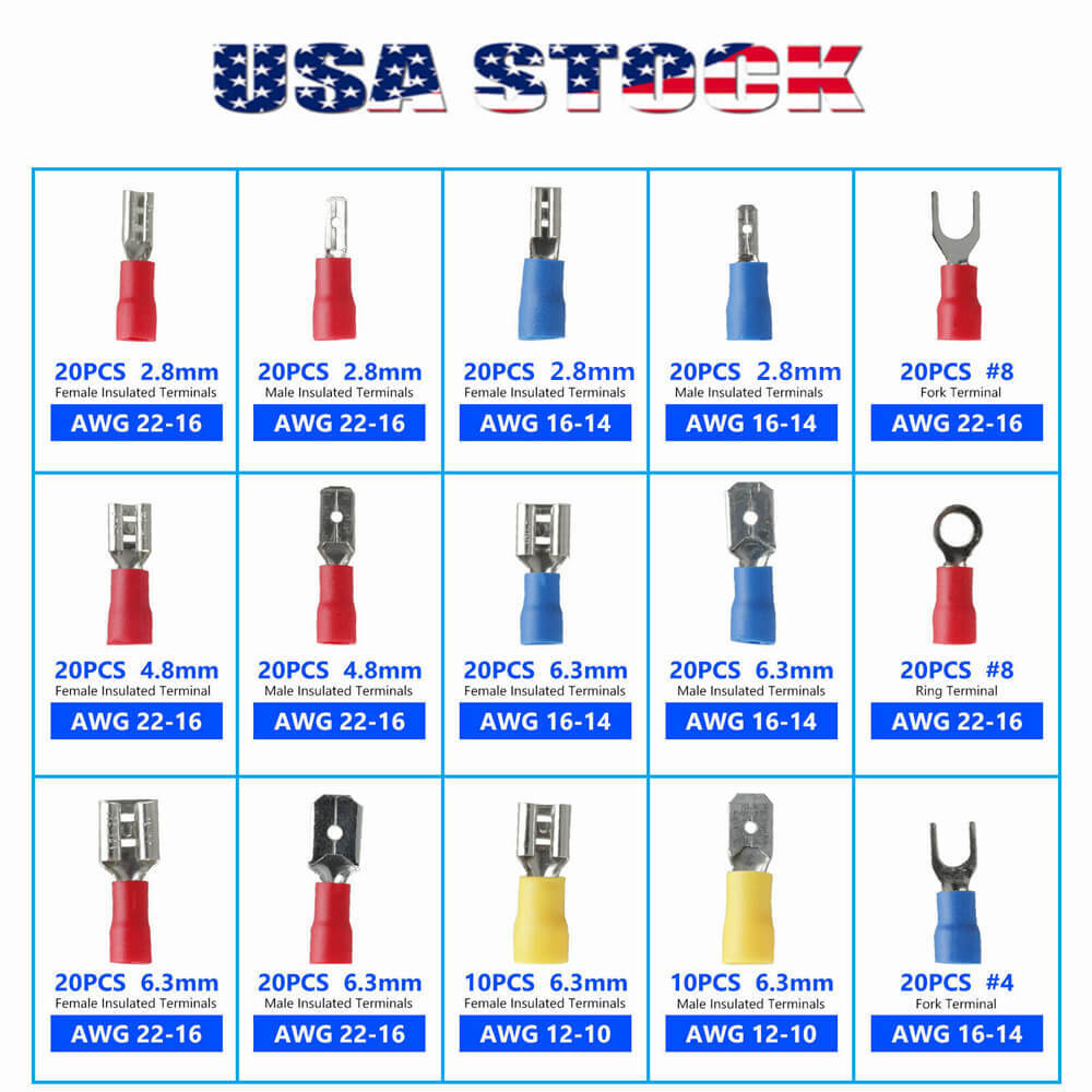 -Boit entier conçu pour bien sertir des fils solides ou des fils toronnés - Convient pour le raccordement dans un câble d'alimentation (AWG 22-14) avec des équipements électriques -Travaille bien avec les machines, voitures, réparation d'appareils ménagers, ordinateur ou autre équipement automatique Le forfait comprend: Connecteur de terminal à sertir Spade mâle 30pcs X 2., 8mmm Connecteur de terminal à sertir 30pcs X 4., 8mm mâle Connecteur de terminal à sertir 30pcs X 6., 3mm mâle Connecteur de terminal à sertir 30pcs X 2., 8mmm femelle Connecteur terminal à sertir 30pcs X 4., 8mm femelle Connecteur de terminal à sertir 30pcs X 6., 3mm femelle Manchon isolant 90pcs X COSSE DE CÂBLE TUBULAIRE KLAUKE 602R6 180 ° M6 10 MM² 1 PC(S Fabriqué en laiton, cuivre, épaisseur 0,25-0,8mm, convient aux fils de calibre 22-14 Cosse Electrique A Sertir 270 Pcs Cosse Electriques,Connecteur De Fil T-Connector Connecteur Electrique Le type à sertir est bon pour les appareils ménagers, les haut-parleurs de voiture / bateau, les systèmes audio et audio pour batterie ou interrupteur à bascule à connexion / déconnexion rapide Images PNUATICM 270 Pcs Cosse Electriques,Connecteur De Fil T-Connector, Mâle Femelle Spade Connecteurs De Fils Crimp Terminal Block Avec Isolant Sleeve 2,8 Mm 4,8 Mm 6,3 Mm Label Voir la présentation du produit Voir le descriptif technique En 1 fois14,02 € En 4 fois3,60 € 26,02 € Prix de comparaisoni 14€02 Payez en 4 fois par carte... KINDPA 450PCS Cosse Electrique Autoobile Plate Cosses à Sertir 2.8 Stockage dans la boîte transparente pour ranger et transporter facilement Modèle de connecteurs à sertir Spade: 2., 8mm 4., 8mm 6., 3mm