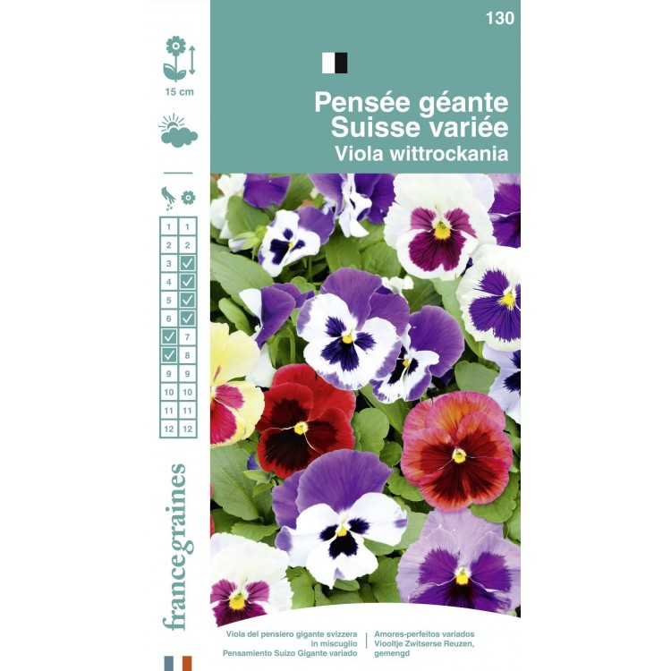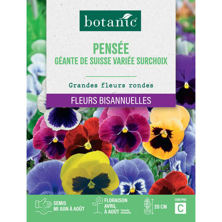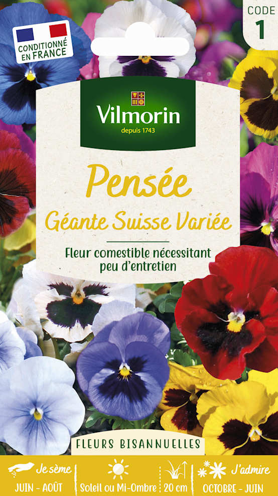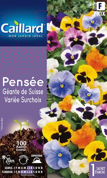 Sachet de 0,3 grammes soit environ 200 graines de Pensée Géante Suisse Variée Race bien connue, à port compact, à fleurs géantes et bien rondes pour massifs, bordures, plates-bandes, potées., ., ., Conseil et utilisation des Pensées Géantes Suisses Variées : Les pensées Suisses sont des fleurs bisannuelles très florifères faciles d'entretien qui égayent les jardins et les balcons au printemps à l'été. Floraison de mars à mai et de septembre à novembre l'année suivant le semis Prix croissant Pertinence Prix croissant Prix décroissant Prix total croissant Prix total décroissant Vendu par Graines Hubert GRAINES HUBERT SEMENCES & ENGRAIS Mairol Graines de Pensée géante Suisse variée 0,3 grammes Produit neuf ★ 1.7 / 5 Plus d'informations 6,60 € Frais de livraison: 3,99 € Délai de livraison: En stock Voir l'offre 0,3 grammes soit environ 200 graines Mettre les pensées géantes Suisses en place à 25 cm de distance en mars-avril. Semis des graines de Pensée Géante Suisse Variée : De juin à septembre : Semer les graines de pensée géante Suisse en pépinière ombragée sur terre fine les graines à peine recouvertes. Repiquer les plants de pensées géantes Suisses en godets individuels lorsqu'il ont quelques feuilles. Fleurs bisannuelles, très florifères, faciles d'entretien , Hauteur : 15 cm D'octobre à décembre : Semer les graines de pensée géante Suisse dans une terrine placée sous serre chauffée. Floraison des Pensées Géantes Suisses Variées : Les pensées géantes Suisses fleurissent de mars à mai et de septembre à novembre l'année suivant le semis. Famille : Violacée · Cycle : plante bisannuelle ou annuelle · Nombre moyen de graines au gramme : 800 · Exposition : Ensoleillée ou mi-ombragée Suisse Blanche Graines De Pensée Géante Suisse Bleue Lac Des Alpes-0,3 Grammes[x1968] - Jardin Mots Fléchés Culture possible en pots, bacs, ou jardinières sur terrasse