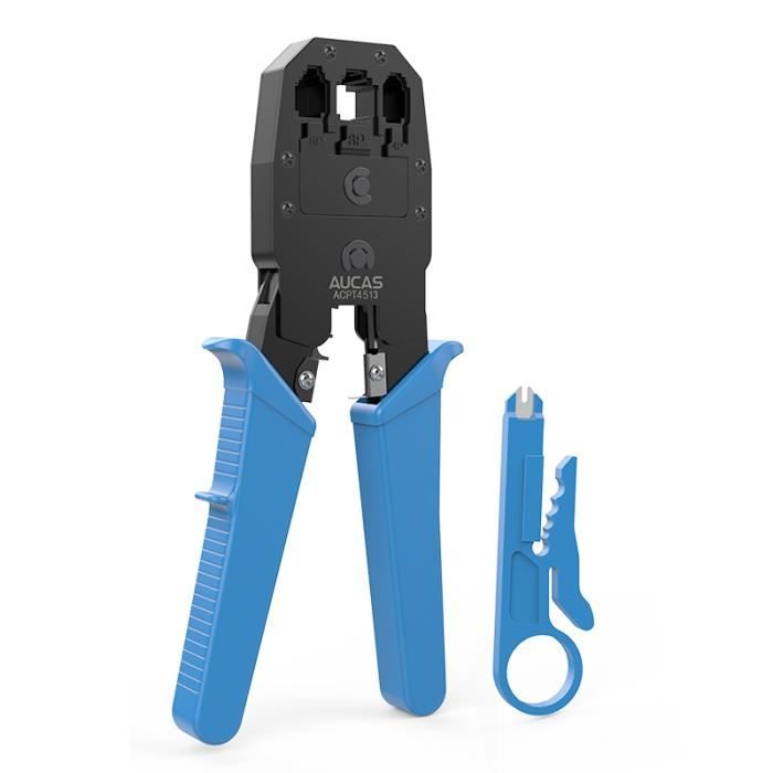 【Ensemble d'outils de sertissage RJ45】L'ensemble comprend un outil de sertissage RJ45 avec lames de rechange, un testeur de câble réseau RJ45, un coupe-fil, une pince à dénuder pour câble réseau, une mini pince à dénuder, 50 connecteurs traversants CAT6 et 50 manchons de décharge de traction. Solsop Testeur de câble réseau RJ45 - Outil à sertir Cat5 Cat5e Cette pince à dénuder polyvalente permet de dénuder les câbles ronds et plats sans endommager les fils internes. Pince Rj45 VCELINK Professionnel Network D'installation Kits Sertissage Pince Sertir 【Précision et fiabilité】Offre une prise en main confortable et un effet de levier optimal pour un sertissage précis et une connexion sécurisée des câbles Ethernet à chaque fois sans connexions inégales et performances réseau instables. Large compatibilité]Deux types de connecteur RJ45 peuvent être utilisés pour réseauter des câbles, notamment: CAT5 / CAT5e / CAT6 / CAT6a / CAT7, RJ11 / RJ12... 【Application polyvalente】Cette pince à sertir traversante de troisième génération est conçue pour les connecteurs RJ45 8P Cat5/5e Cat6/6a traversants/non traversants/non blindés, ainsi que pour les connecteurs téléphoniques 6P/6C, 6P/4C et 6P/6C. Facile à utiliser, elle permet de dénuder le câble réseau grâce à l'écrou de réglage de la profondeur de la lame. 【Pince à sertir RJ45 compacte 】 cette pince à sertir RJ45 est environ deux fois plus petite qu'une pince à sertir classique.