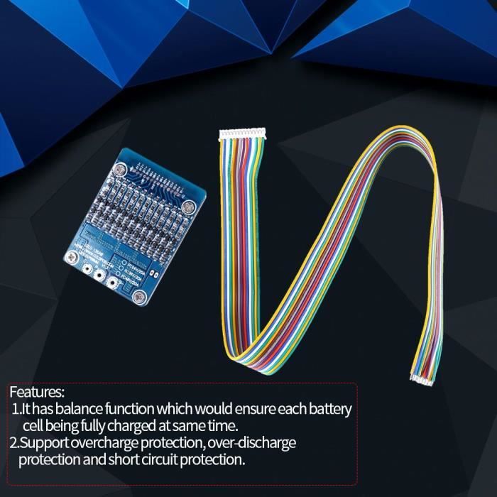 Fiable: le circuit imprimé est fabriqué avec des composants électroniques de haute qualité, stables et fiables 3A 3.7V 18650 Li-ion Lithium LiPo Batterie BMS PCB Chargeur Carte de... Carte de Protection BMS PCB, chargeur 18650 pour batterie au Lithium 3S Fonction: prend en charge la protection contre les surcharges, la protection contre les décharges excessives, la protection contre les surintensités et la protection contre les courts-circuits Chargeur Pile Lr14 Carte De Protection De Carte - PCB De Batterie Au Lithium 3S 12V 40A Li Protection Batterie Lithium Ion Cette carte BMS (Battery Management System) en 6S est faite pour gérer et protéger un pack de 6 batteries Li-Ion 18650 en série (donc environ 24V). Courant max... Spécification : Courant de décharge max : 15A Courant de décharge instantané : 25A Tension de charge : 25,5 V Courant de charge : 15 A (maximum) Tension de détection de surcharge : 4,28 ± 0,05 V Tension de détection de décharge excessive : 2,55 ± 0,08 V Tension de détection de surintensité : 150 mV Courant de protection contre les surintensités : 30 ± 3 A Courant de travail: ≤30uA Courant de veille (en cas de décharge excessive): ≤10uA Température de fonctionnement : -30 ~ 80 Taille : 50 * 32 mm/1,97 * 1,26 in Poids du colis : env. Produit : Panneau de protection pour batterie au lithium 18650 ; Courant de décharge maximum : 15A ; Tension de charge : 25,5 V ; Courant de décharge instantané : 25A