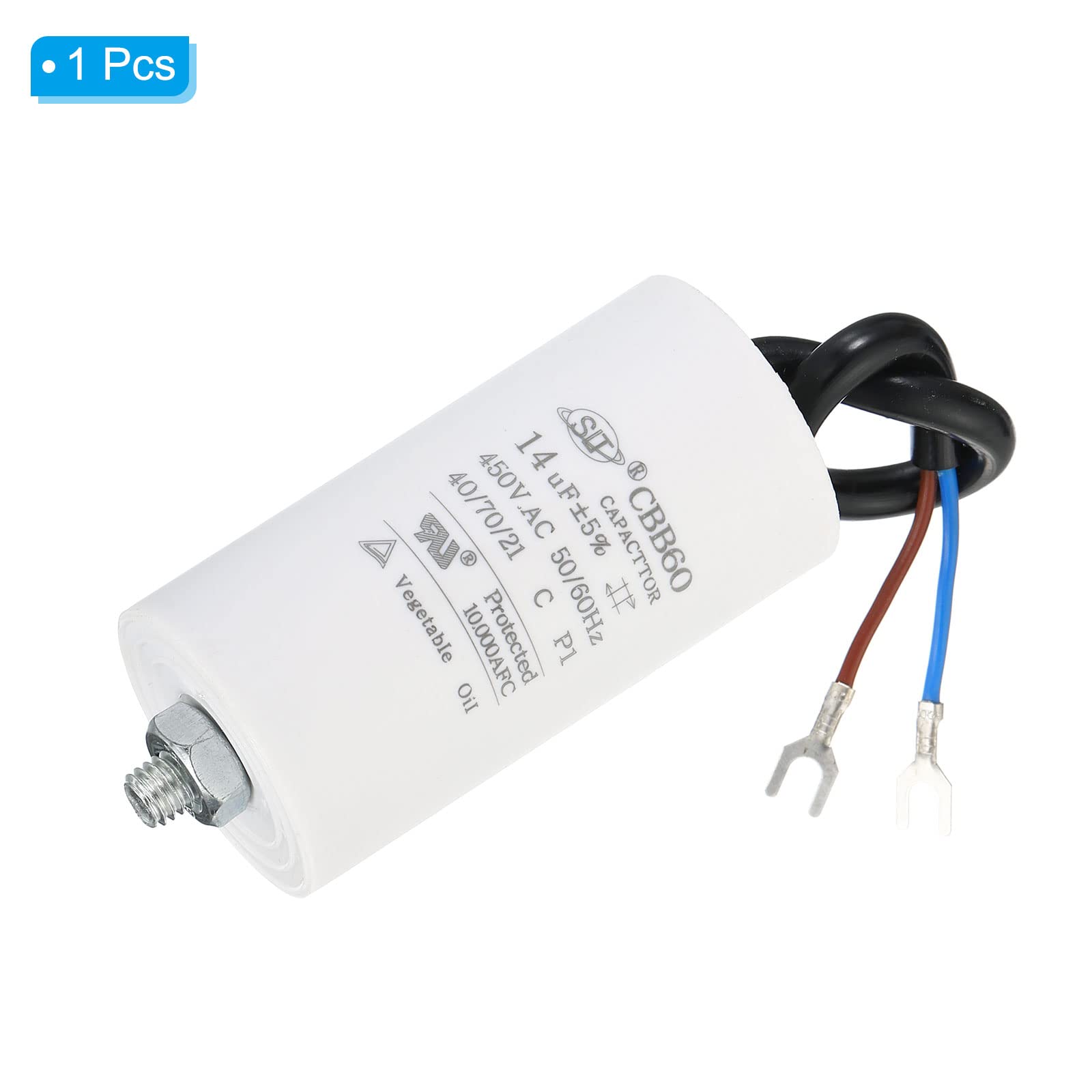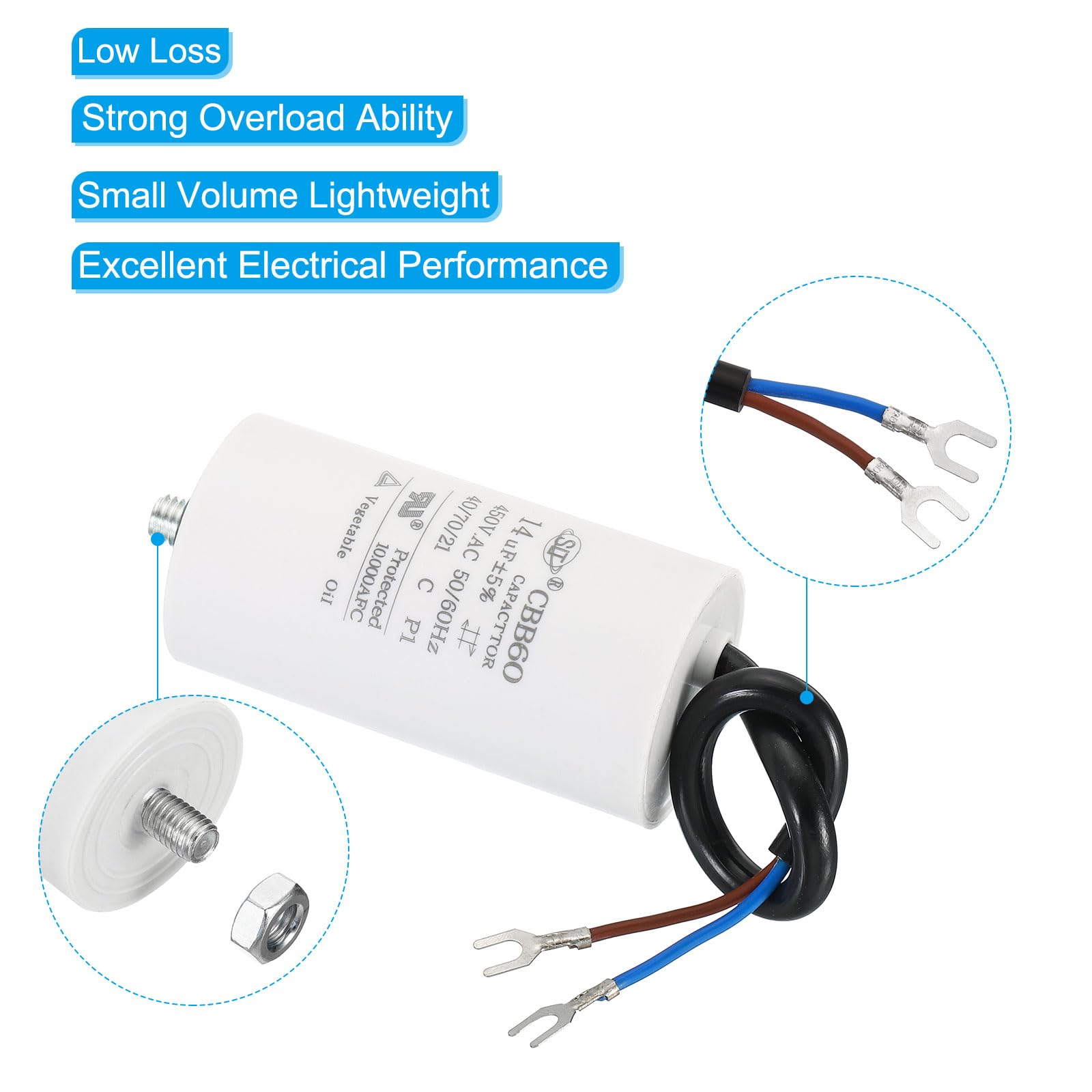 Grande stabilité, bonne dissipation de la chaleur à haute température. NOTE : Veuillez faire attention à ne pas faire de surintensité ou de surtension lors de l'utilisation Avantage: Ce condensateur de marche CBB60 présente les caractéristiques suivantes : petit volume, poids léger, faible perte, forte capacité de surcharge, excellente performance électrique, performance d'isolation fiable, et courant avec une bonne résistance aux impacts. PATIKIL Condensateur de fonctionnement CBB60 14 uf, 2 fils Facile à monter grâce aux 2 fils et la vis M8. Convient pour lampes et moteurs 50/60Hz. Condensateur 14 µF (14 mF) 450V à câble pour démarrage moteur électrique... Cbb60 14uF Condensateur De Démarrage, AC 450V 4 Broches 50 Condensateur Cbb60 La capacitance n'est pas divisée en stades positifs et négatifs elle peut être connectée à volonté.