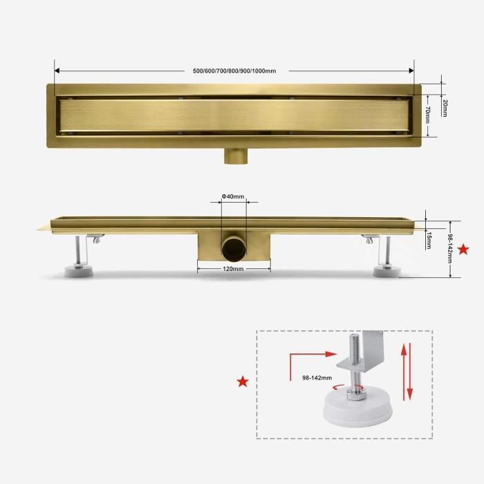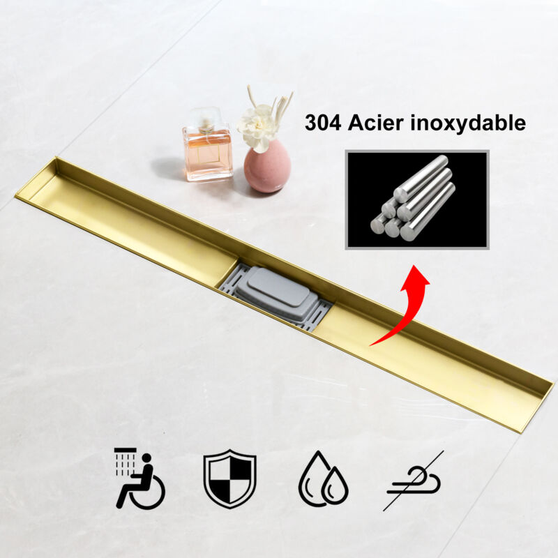 Siphon autonettoyant 1 voie peu encombrant avec double att. lave-vaisselle Siphon et tamis à cheveux Siphon Le siphon est 100 % plastique et résiste aux hautes températures. Passoire à cheveux La passoire à cheveux et le couvercle sont retirés avec le crochet. La consommation d'eau des pommeaux de douche (douche standard) varie de 10 à 30 litres par minute - Notre caniveau de douche recueille l'eau à la vitesse d'écoulement de 55 litres par minute Accès facile Avec son écoulement en V profond, l'eau part vite - jusqu'à 30L/min, donc pas de flaques qui trainent. Le noyau anti-odeur empêche les mauvaises odeurs de... Passoire à cheveux Tout comme sur l'image, la passoire à cheveux est tirée à la main pour enlever les poils. Le corps monolithique en acier inoxydable de haute qualité, l'absence de joints en plasti Pieds Montage facile - Les pieds assurent un ajustement précis du caniveau de douche. Le processus de nettoyage ne prend qu'un instant car l'accès est très simple. La brillance dorée a une teinte unique et intéressante qui reflète magnifiquement la lumière, créant un intérieur confortable. Caniveau Pour Douche VBChome Caniveau De Douche 90 Cm Ultra Fin Très Plat En Acier Caniveau De Douche Extérieur Contenu du kit : corps, jambes réglables, plaque double face, siphon, tapis d'étanchéité, piège à boue, crochet pour enlever la plaque, réduction 40/50. <br/Un montage sans obstacle ainsi qu'une utilisation flexible grâce au réglage de la hauteur et aux différentes longueurs proposées offrent la possibilité d'adapter les caniveaux de douche aux circonstances. Grande vitesse d'écoulement , Montage rapide L'or s'harmonise merveilleusement avec la pierre, en particulier le marbre, dans des intérieurs classiques et glamour. Vitesse d'écoulement : 55 l/min GE Profile Four mural électrique double autonettoyant de 30 pouces avec... Accessoires Tapis d'étanchéité, adaptateur d'écoulement DN 40/50