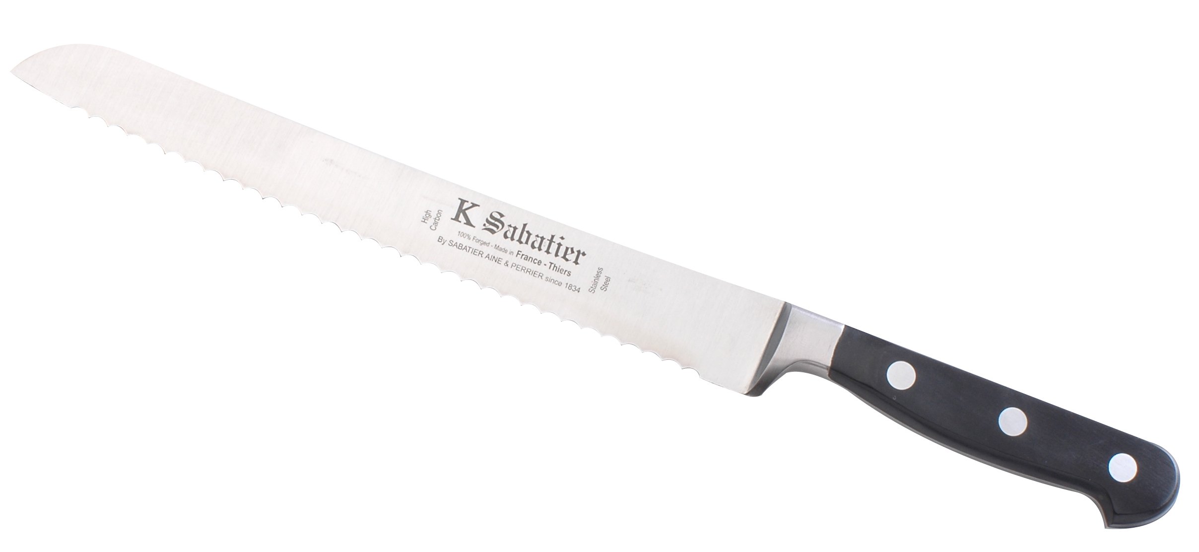 Pain 23 cm. L'ensemble du couteau de Cuisine Professionnel est forgé dans la masse en une seule pièce avec de l'acier inoxydable. L'acier Z50C13, d'une dureté Rockwell de 54 à 56 HRC, est trempé, émout et poli en travers pour avoir un outil de haute qualité, un grand pouvoir coupant, une dureté de coupe, un équilibre. Couteau Cuisine Sabatier Louche Goa En Acier Inoxydable Brossé & Manche Noir - GO.13 - CUTIPOL Sabatier Couteau K SABATIER - Pain 23 Cm Gamme Elegance - Acier Inoxydable - Manche Bois - 100% Forge - Entièrement Fabrique en France Achetez K SABATIER - Pain 23 Cm Gamme Elegance - Acier Inoxydable - Manche Bois - 100% Forge - Entièrement Fabrique en France Décapsuleur entièrement forgé à tête de taureau de Camargue