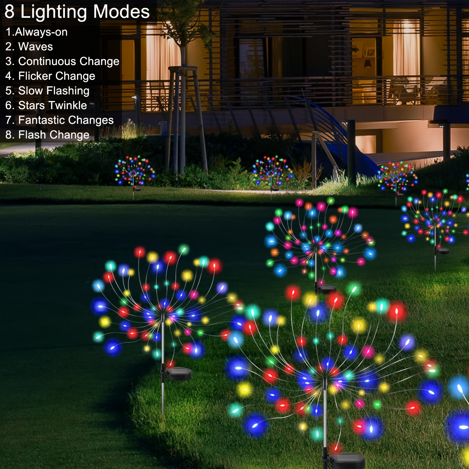 Joycome Lampe Solaire Exterieur Jardin 4 x 120 LED Feu d'artifice Solaire avec Télécommande, 8 Modes Étanche Éclairage Extérieur Solaire de Pissenlit Lumière continue pendant 8 à 12 heures. Il peut créer des atmosphères dynamiques vives. Nous offrons des produits de qualité et une garantie d'équipe technique qui rendent votre achat absolument sans risque. Lot De 4 Lampes Solaires Pour Décoration De Jardin, 480 LED Les ampoules et la guirlande lumineuse sont étanches IP67., Le boîtier de batterie est étanche IP65., Utilisation parfaite même les jours de pluie. Cadeaux et décorations parfaits : pour Noël, la Saint-Valentin, un anniversaire, un mariage et une fête, la fête des mères, etc. Appuyez sur le bouton de l'interrupteur et la lumière continuera à fonctionner jusqu'à 8 heures et s'éteindra pendant 16 heures (temps d'éclairage en fonction du mode d'éclairage et du niveau de batterie). 【Étanchéité IP65 et économe en énergie】Le chargeur solaire est chargé pendant la journée et s'allume automatiquement la nuit. Parfait pour les spectacles, terrasses, jardins, mariages et autres décorations extérieures. Lot de 4 lampes solaires d'extérieur pour décoration de jardin - 480 LED au total - Feux d'artifice solaires étanches pour cour, allée, jardin, terrasse... La lumière de feu d'artifice 120 LED peut se charger automatiquement pendant la journée et fonctionner automatiquement la nuit, peut également fournir 8 à 12 heures d'éclairage continu après une charge complète.