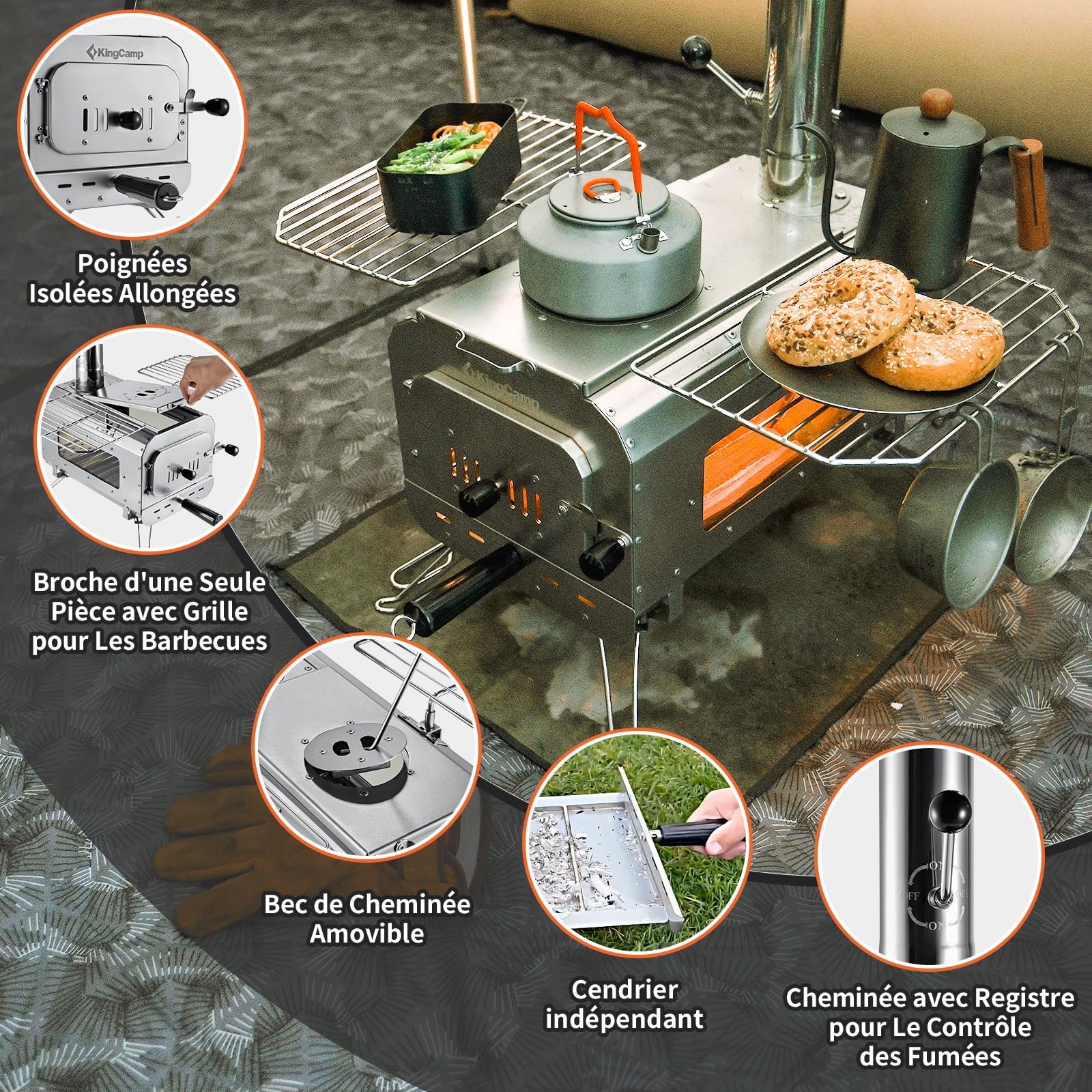 【USAGES POLYVALENTS】Le couvercle amovible du réchaud de camping peut servir à la cuisson. 【MATÉRIAU INOXYDABLE 201】Poêle à bois de camping de haute qualité en acier inoxydable, sans odeur, résistant à la corrosion et à haute conductivité thermique. Cheminee Portable Chauffage Tente Acier Inoxydable Poêle à Bois Portable KingCamp - Acier Cheminée Portable Indoor & Outdoor Ne rouille pas en milieu humide, utilisable sous la pluie et la neige. 【DÉTAILS AMÉLIORÉS】Grande fenêtre panoramique bilatérale permettant d’observer clairement les bûches et de recharger le combustible à temps. Une housse de transport est également fournie pour un transport compact. Assure une bonne étanchéité pour éviter toute fuite de fumée, idéal pour une utilisation en tente. Poêle à bois portable pour tente de camping, chauffage intérieur et 【FACILE À TRANSPORTER】Comprend 1 poêle de tente pliable, 6 sections de cheminée de 7 cm de diamètre, 1 paire de gants, 1 crochet à cendres et d’autres accessoires. Tous les éléments peuvent être rangés dans le poêle. Bac à cendres coulissant facilitant le nettoyage. VEVOR Poêle de camping pour tente VEVOR, poêle à bois de tente, poêle à... Transformez votre expérience de camping avec cet accessoire ingénieux. Les étagères pliantes de chaque côté augmentent la fonctionnalité du poêle, permettant de ranger couverts, gants secs, chaussettes et petits objets humides. Verre trempé très résistant à la chaleur, supportant jusqu’à 1000 °C.