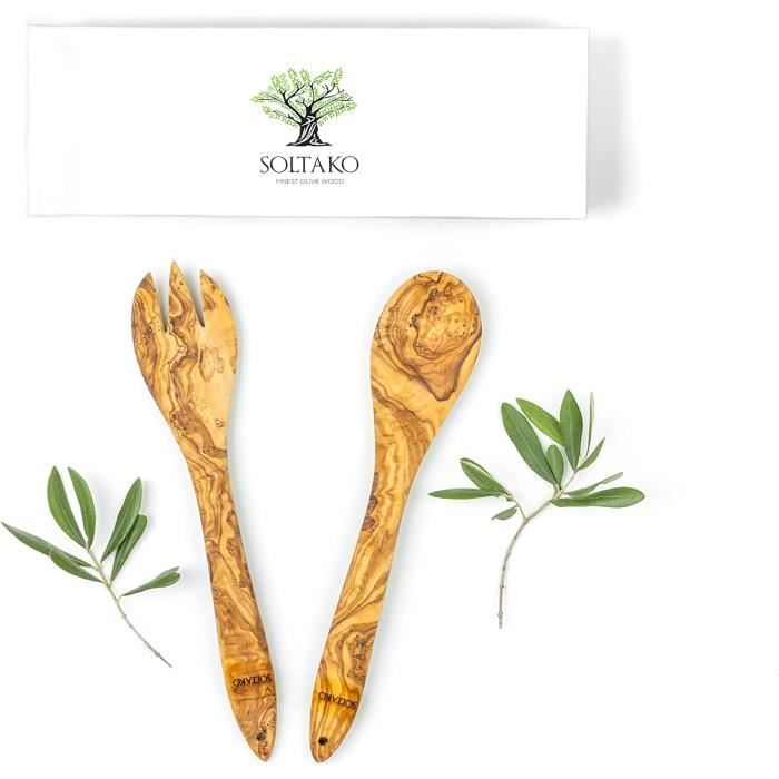 Ensemble de couverts en bois d'olivier faits main, ustensiles de table antibactériens - un lot de 3 couverts en bois d'olivier ; une cuillère, une fourchette et un couteau. - Le tout fabriqué à la main à partir de bois d'olivier célèbre, poli très finement et lisse et fini avec de l'huile d'olive naturelle et sans danger pour les aliments Le bois d'olivier possède des propriétés antibactériennes intrinsèques grâce à sa teneur en huile et ne retient pas les odeurs ni les bactéries. Cuillère à soupe En bois d'olivier méditerranéen. Un beau grain unique dans chaque pièce qui a été vieilli et traité avec de l'huile d'olive. Idéal pour les revêtements antiadhésifs, il ne raye ni le téflon, ni les poêles en inox ou en céramique. Parmi les nombreux avantages des ces ustensiles, en voici une liste non exhaustive: Une résistance d'exception ! Vaisselle faite à la main à partir de bois d'olivier, couteau à beurre, fourchette de table, cuillère Dimensions : environ 31 cm de longueur et 1 cm de diamètre (manche) Ne passe pas au lave-vaisselle. L'ensemble de couverts en bois d'olivier n'est jamais fabriqué avec de l'eau de Javel, des colorants ou des produits chimiques. Le bois d'olivier est un matériau dense qui résiste aux chocs, à la chaleur et à l'usure. Remarque : en raison de la fabrication artisanale du produit en bois d'olivier grainé, tous les articles peuvent être légèrement différents, chaque article est une œuvre d'art unique. Dimensions approximatives : 20,3 cm de long Lavage à la main uniquement. Cuillère-fourchette en Olivier - Bouliwood Créations Bois 100 X 3 Couverts Bois Fourchettes, Cuillères Et Couteaux, Couverts