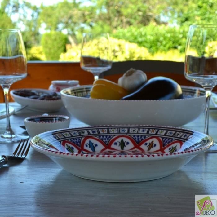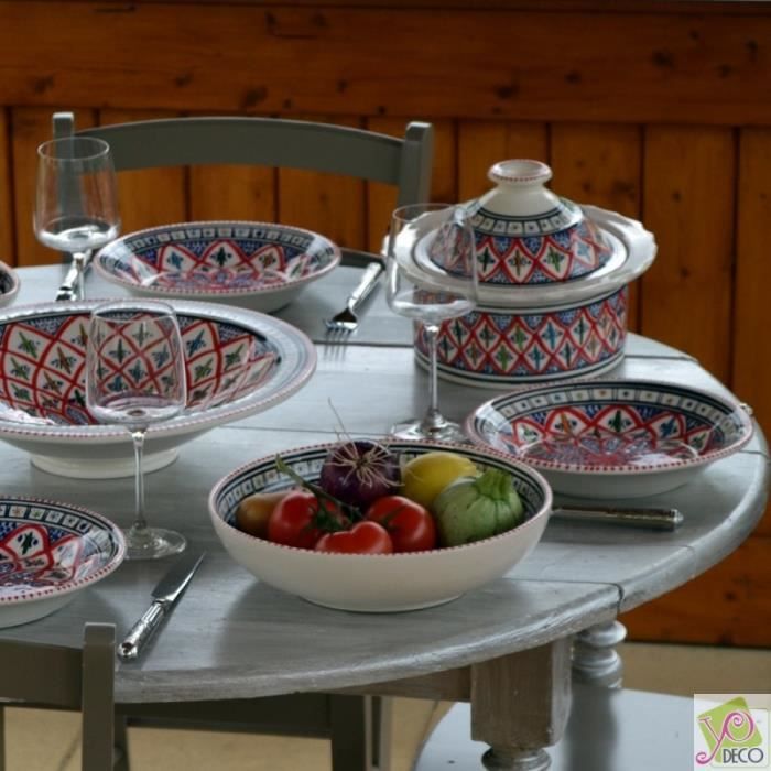 Service à couscous composé : - assiettes (6, 8 ou 12) - 1 cocotte avec son couvercle pour le bouillon et les légumes par exemple - 1 grand plat creux tebsi spécialement étudié pour accueillir la semoule en pyramide, peut également servir de coupe à fruits Ce service couscous traditionnel nouvelle tendance, avec des couleurs apaisantes et modernes, permet de recevoir ses amis ou sa famille pour partager de bon repas comme un couscous, des spaghetti, une choucroute ou d'autres plats uniques. Ne rangez pas votre grand plat, il pourra vous servir de coupe uit... Contenu du service à couscous12 assiettes traditionnelles Tebsis diamètre : 23 cm1 querouana (plat avec couvercle) diamètre : 25 cm1 plat tebsi diamètre : 33 cm - Produit al , Fabrication artisanale , Décoré à la main Assiette Marocaine Service à Couscous Assiettes Creuses Bakir Vert - 12 Pers Plat Pour Couscous Articles coordonnés et autres coloris disponibles Service à couscous assiettes Tebsi Bakir Royal - 12 pers · 12 assiettes, 1 querouana, 1 plat tebsi · Traditionnel · Compatibilité lave-vaisselle : Oui · Dimensions... Cadeau Cuisine Marocaine Service à Couscous Tebsis Bakir Gris - 6 Assiettes, 1 Plat Et 1 Querouana - Artisanal, Décoré à La Main Fabrication Artisanale Idéal pour un cadeau Ce service à couscous traditionnel, aux décors finement peints à la main, permet de recevoir ses amis ou de partager de bons moments en famille autour de la table.