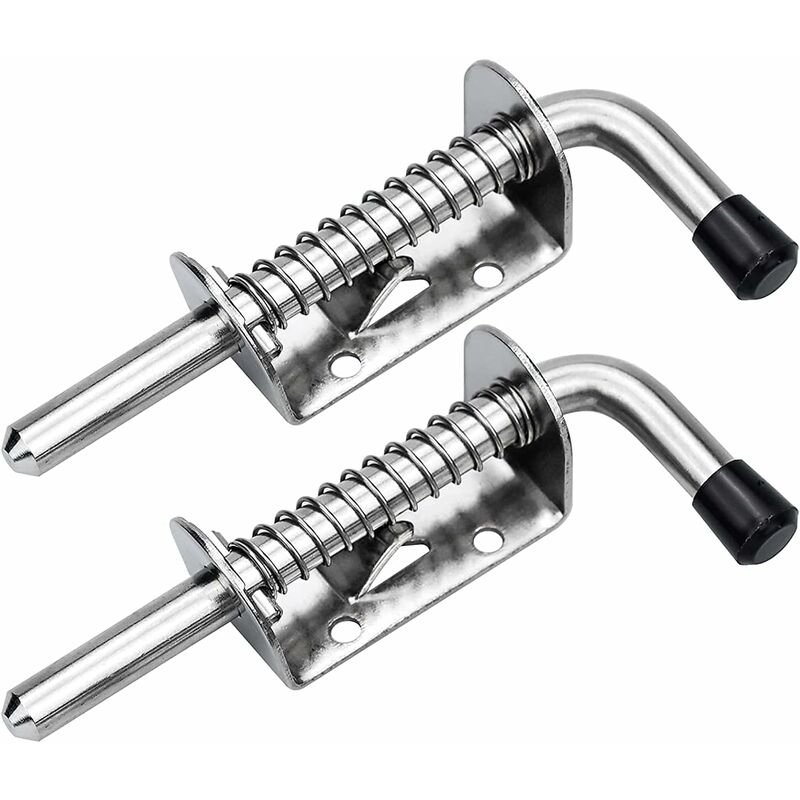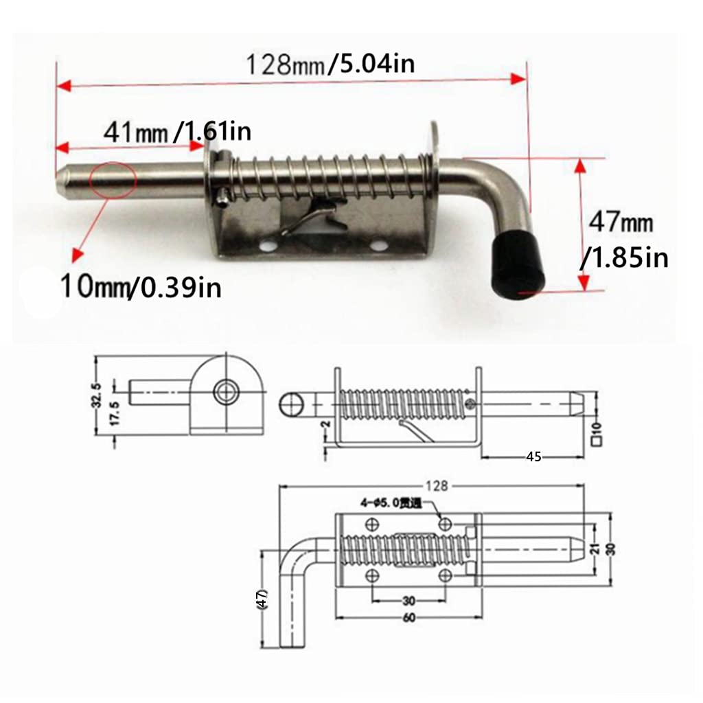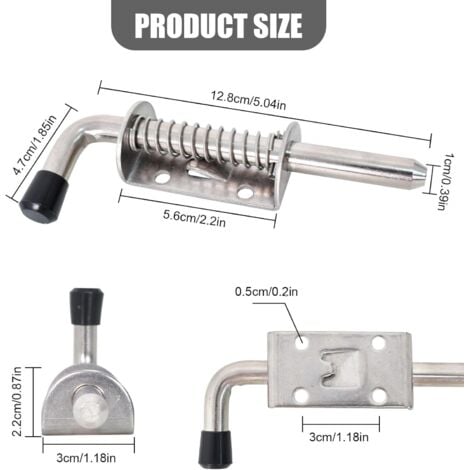 Description de Lot de 2 loquets à ressort en acier inoxydable 304 pour porte coulissante, pour garage, jardin, placard Matériau durable : le verrou à ressort est fabriqué en acier inoxydable 304, très solide, difficile à déformer et à rouiller, offrant une protection sûre et fiable. Installation facile : il suffit d'aligner le loquet à ressort au centre des deux ouvertures de porte... Utilisé pour verrouiller, fermer et protéger les portails et les portails, mais également utilisé comme serrure supplémentaire de sécurité. Facile à utiliser : verrou à ressort pour porte est facile à visser ou peut être appliqué sur la surface des portes ou portails en bois. Serrure Portail Exterieur 2Pcs Verrou Porte De Garage Targette Verrou De Pontet Lot De 2 Loquet À Ressort, Loquet Ressort Inox, Verrou Porte Verrou Porte Interieure Le matériau résistant aux intempéries garantit une résistance aux influences extérieures. Pour que les boucles soient fixées et fermées si nécessaire. Utilisé pour protéger les portails, clôtures, camions, rampes de remorque, meubles, etc. Design d'utilisation: design de poignée en caoutchouc noir, facile à tirer et à tourner, évite le glissement des mains, simplifie l'utilisation quotidienne. Vous n'avez besoin que d'un peu de temps et d'effort, et vous avez juste besoin d'utiliser des outils ménagers standard. Utilisé pour verrouiller, fermer et protéger les portails et les portails, mais également utilisé comme serrure supplémentaire de sécurité.Caractéristiques... Caractéristiques techniques : la longueur totale du boulon coulissant chargé à ressort est de 128 mm, le diamètre est de 10 mm et la hauteur est de 47 mm, sans vis.