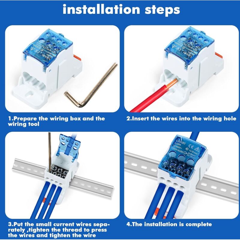 Boîte de jonction électrique montée sur rail DIN avec bornier 80A à SPECIFICATION : Modèle : UKK-80A, Courant nominal : 80A Borne de sortie : 2X16mm²/4X10mm² Installation Facile : Le couvercle transparent permet de voir si le câble est correctement connecté, et le boîtier est facile et rapide à installer sur les rails. Disjoncteur 2a Boîte De Distribution De Bornes, UKK-80A Boîte De Distribution Universelle Pour Rail DIN Connecteur De Fil électrique Résistant à La Température Isolation Performance Boîte De Jonction D'alimentation Ukk 80a CONVIVIALITÉ La boîte de jonction est simple et rapide pour diviser le câble, pour répondre à une variété de nombre de branches de câble, pour améliorer l'efficacité. Performance : coque ignifuge, résistance aux hautes températures, durable, bonne performance d'isolation, durable. COUVERCLE VISIBLE Le couvercle transparent permet de voir si la connexion est correcte et fiable. Matériau du support : Nylon ignifugé Matériau des bornes : Cuivre Boîte de distribution pour rail DIN 3 pièces, bornier UKK-80A, connecteur de fil électrique, boîte de jonction d'alimentation ; Livraison gratuite. i ; i. Livré... Borne d'entrée : 1X16mm²