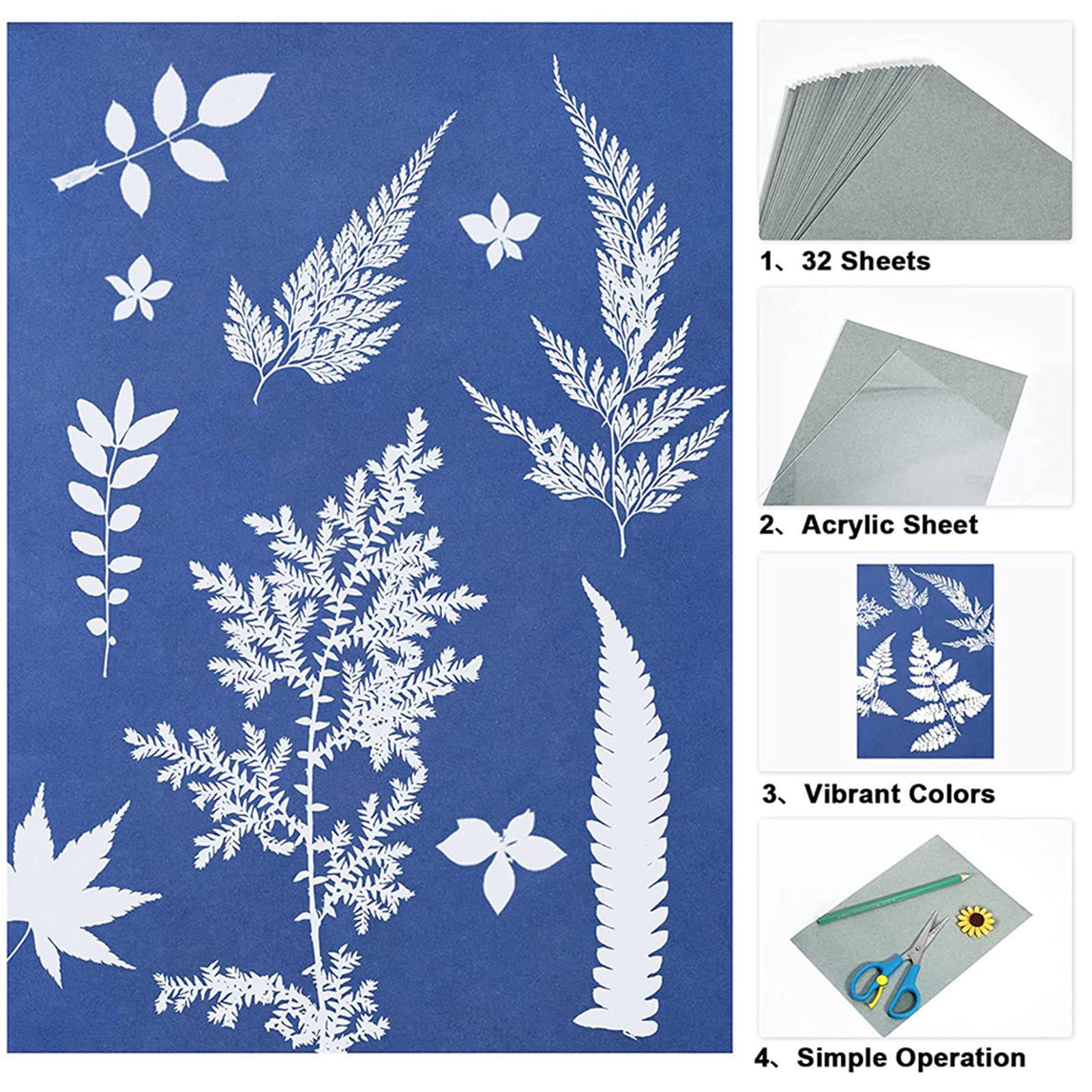 Vous pouvez les utiliser et les partager avec vos amis pour profiter d'un bon moment de bricolage, il suffit de choisir votre motif préféré et de créer de beaux motifs par simple opération. Kit de papier d'art solaire : vous recevrez 32 feuilles de papier cyanotype A5 et 1 panneau en PVC. Chaque papier d'exposition au soleil mesure environ 21 x... Contenu : 32 feuilles de papier d'impression et 1 feuille de presse en PVC transparent Caractéristiques : Papier imprimé soleil. Kit De Papier D'impression Solaire Pour Enfants Et Adultes OCCOUMR Lot de 32 feuilles de papier cyanotype A5 haute Remarque : Lorsque vous ne vous en servez pas, faites attention à l'étanchéité et à la conservation de la lumière ; plus l'effet de stockage est long, plus le meilleur et le meilleur effet dans les 6 mois. Des chaussures aux vêtements, des tenues de sport aux accessoires. Profitez du plaisir du bricolage Mode d'emploi : Mettez les feuilles de plantes ou les découpes en papier sur le papier de bronzage bleu. Plaque de presse Matériau : PVC , Couleur : Bleu Tote bag cyanotype, pochette cyanotype Dimensions du papier : 15 x 21 cm Placez le papier au soleil pendant environ 10 minutes (plus il y a de soleil, plus le résultat est meilleur. Utilisez notre plaque en PVC transparent pour appuyer et fixer. Design unique : le papier à dessin imprimé soleil est basé sur le processus de cyanotype, le papier d'impression nature sensible est fabriqué en papier de plan, robuste et stable, pas facile à casser/déchirer, léger et facile à ranger, économise de l'espace, adapté pour une utilisation prolongée. Facile à utiliser : il suffit de mettre les plantes/découpes de papier/autres choses sur le papier d'impression solaire, et de les presser avec du verre transparent ou une plaque acrylique.