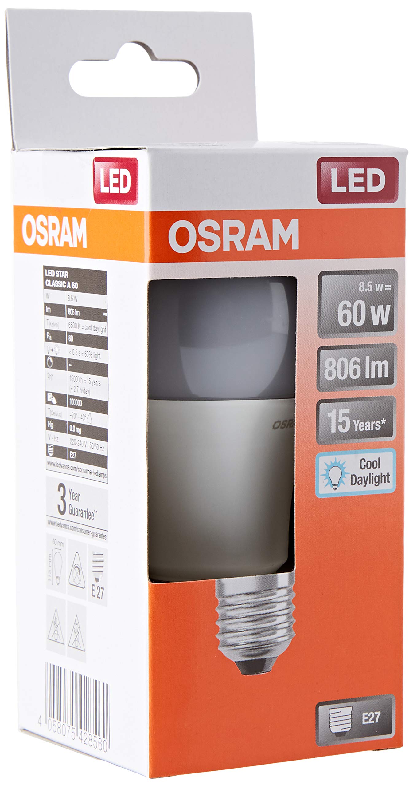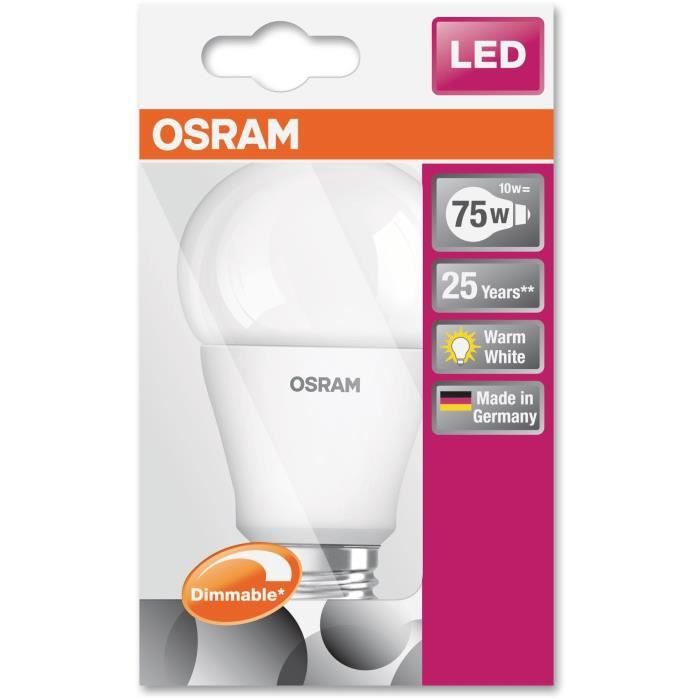 faible émission de chaleur (comparé aux produits standards de référence). Durée de vie : jusqu'à 15000 h. Ampoule Led E27 Blanc Froid OSRAM Ampoule Led E27 Dépolie Variable Blanc Chaud 11W équivalent 75W Ampoule Colorée Ouverture du faisceau: jusqu'à 300., Avantages produits: Ampoules avec technologie de filament LED innovante. consommation d'énergie 7 kwh/1000h à 806 lm OSRAM Vintage 1906® LED E27 7 Watt 2200 Kelvin 600 Lumen Conception, dimensions, flux lumineux comparables à une Ampoule à incandescence classique ou halogène. OSRAM DECOR LED FLAT GLOBE est une ronde plate de 3,5W, 300lm/2700K, en blanc chaud 827, dépolie, en plastique noir, avec pas de vis E27, non longue durée de vie jusquà 15000 heures et 100000 cycles de commutation. lumière blanc froid idéale pour améliorer la concentration et optimiser les performances visuelles dans la cuisine, la salle de bain et le bureau succède aux ampoules classiques, se substitue à une ampoule de 60 w (utilisation en extérieur uniquement avec des luminaires appropriés) OSRAM Ampoule LED | Culot: E27 | Lumière du jour froide | 6500 K | 7 W | équivalent à 60 W | LED Retrofit CLASSIC A. 4,70 €. sur . Aller sur la... Ampoules de haute qualité sur – Commander OSRAM Vintage 1906® LED E27 7 Watt 2200 Kelvin 600 Lumen contenu de la livraison: 1 x ampoule led e27, 7 w, 220240 v, lumière du jour froide, 6500 k, 100% sans mercure - le meilleur de la qualité osram. allumage instantané, pas de temps de préchauffage.