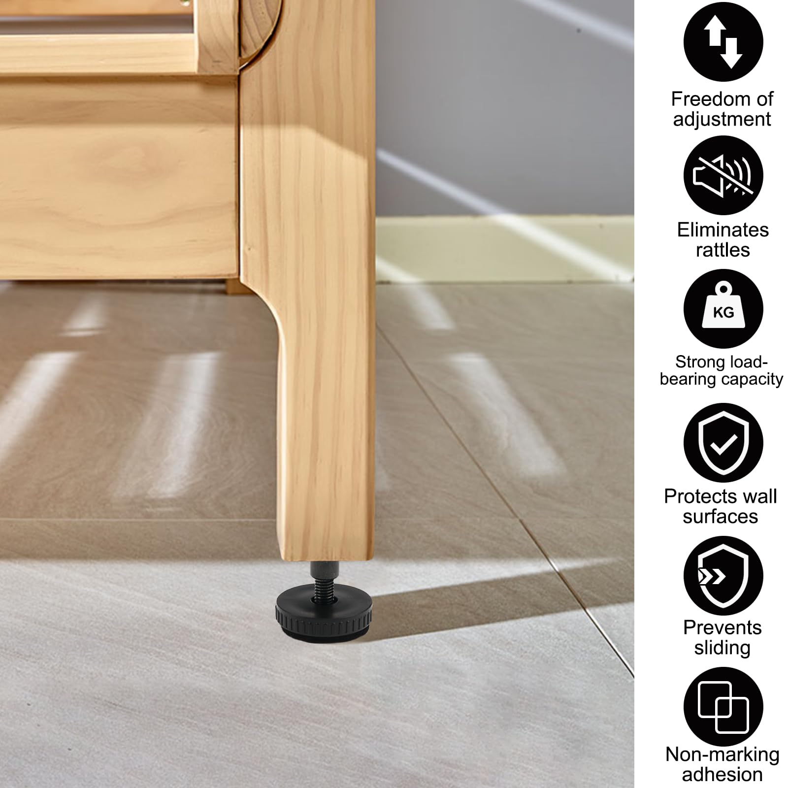 【Large application】Chaque paquet contient 8 jeux de pied de table reglable, répondant aux besoins de plusieurs lits dans votre maison. Pied Réglable Pour Canapé Pied Reglable Pour Meuble 27-64mm, 4 Pièces Pieds De Meubles Réglables, Pied De Meuble Reglable Avec Patin Anti-Rayures, Percés Ou Auto Adhésifs Pied De Table Reglable, Pour Tables Et Armoires Pied De Lit Reglable Installation facile et pratique : Équipé d'un film auto-adhésif pour une installation facile sans perçage ni outils professionnels, ce qui permet d'économiser du temps et des efforts. Description du produit EXIN DECHEN Pied de Meuble Reglable- Conçus pour améliorer la sécurité, la durabilité, l'ajustabilité et la facilité d'installation, ces pieds améliorent considérablement la qualité du sommeil en assurant la stabilité et la réduction du bruit. Équipé d'écrous solides qui sont robustes et ne vacillent pas facilement, et de patins en feutre antidérapants pour éviter d'endommager le sol. Pied de meuble... Les pied meuble salle de bain réglables conviennent à divers meubles, y compris les pieds de canapé, les tables de chevet, les armoires, les tables basses, les pieds de bureau, les pieds de meubles et les meubles de bureau, ce qui les rend simples et pratiques. Aucun perçage n'est nécessaire et ils n'endommagent pas les meubles ou les murs. Conception pratique : nos pieds réglables peuvent vous aider à amener les meubles à la même hauteur, à résoudre le problème de l'oscillation des meubles, à... Veillez à respecter la capacité de charge maximale et à vérifier régulièrement l'état des pieds pour éviter tout risque de basculement ou de dommages. Matériaux de haute qualité pour la durabilité et la sécurité : Fabriqués en plastique ABS très résistant combiné à de l'acier au carbone, ils garantissent une structure robuste et durable qui reste inchangée après une utilisation à long terme. Piuluvor® Lot de 8 Pieds Pied de Meuble Reglable, Pied Reglable 27-40 mm, Pied Bureau en Métal avec Coussinet en Feutre pour Espaceur de Lit, Mur, Canapé, Table (Noir Ajustement précis et réglable : Réglable de 27 à 40 mm, il s'adapte parfaitement aux différents espaces entre la tête de lit et le mur. 【Installation facile, prêt à l'emploi】Le film autocollant et les tampons en éponge fournis avec les pieds de meuble rendent l'installation simple et rapide. Qu'il s'agisse d'un style minimaliste moderne ou d'un cadre de lit de luxe classique, l'installation est facile. Il suffit de le coller délicatement pour le fixer. 【Robuste et silencieux, il améliore la qualité du sommeil】Nos pieds de meuble reglable sont axés sur la fonctionnalité, l'esthétique et la sécurité.