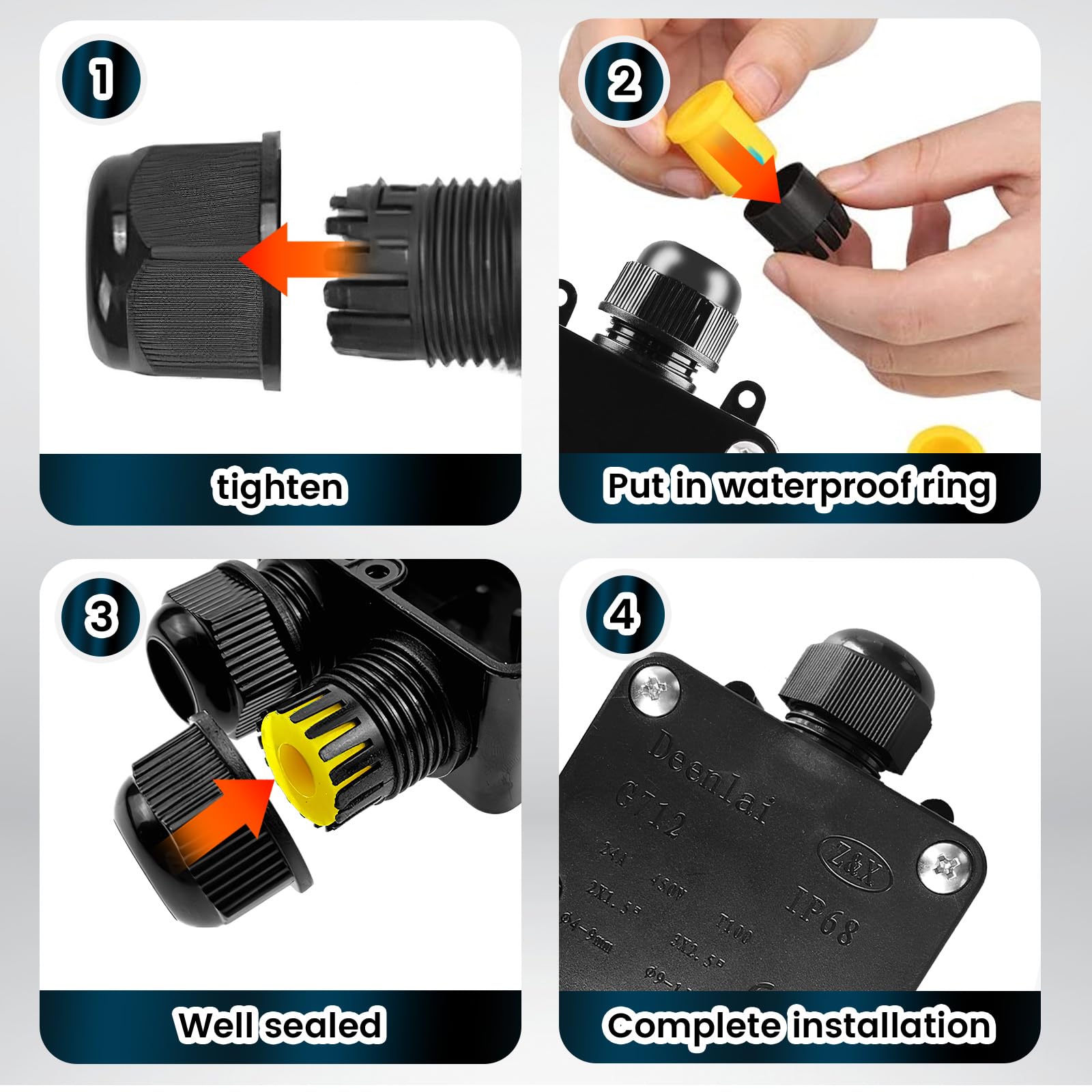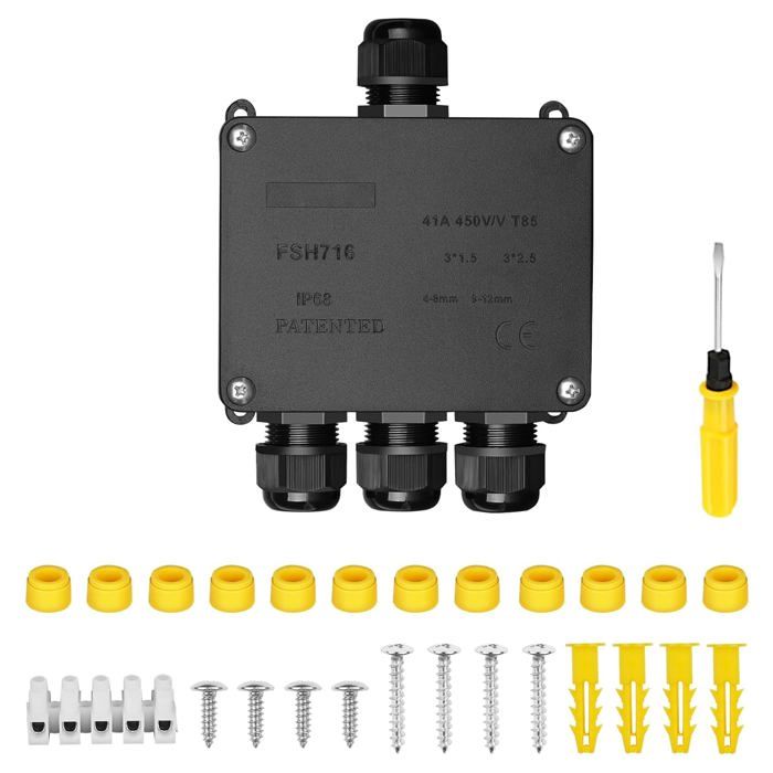 Diamètre du câble disponible : 5-9 mm, 9-12 mm, 12-15 mm, idéal pour réparer et prolonger les câbles d'alimentation. Équipé de vis murales et d'un tournevis pour une installation facile. Matériau de qualité supérieure] Notre boîte de jonction à montage en surface est composée d'une excellente coque en plastique et d'un anneau en silicone, qui est anti-UV, ne se fissurera pas et ne se décolorera pas au soleil, anti-corrosion, résistant aux hautes températures, robuste et durable. [Grade étanche IP68] La qualité étanche professionnelle de la boîte de... La boîte de jonction à 3 voies est votre meilleur choix pour connecter des lampes extérieures et des lanternes. Bague d'étanchéité : 5-9 mm, 9-12 mm, 12-15 mm. Boîte de jonction étanche avec cercle d'étanchéité en caoutchouc étanche et vis d'étanchéité pour une étanchéité complète. Convient pour différents câbles pour empêcher l'eau de pénétrer., 4., Largement utilisé : boîte de jonction étanche adaptée à l'électricité intérieure et extérieure, aux communications, aux pompiers, à l'acier fondu, à la pétrochimie, à l'électronique, à l'électricité, aux chemins de fer, aux mines, aux chantiers de construction, aux aéroports, aux hôtels, aux navires, aux terminaux de décharge, aux stations d'épuration, aux usines, etc. Matériaux de qualité supérieure - Boîte de jonction étanche IP68 - Fonction étanche à la poussière - Matériau PC ignifuge de qualité supérieure - Résistant au feu - Fonction résistante aux chocs - Joint en silicone étanche - Protection solaire UV et protection contre la pluie - Ces fonctions vous permettent de l'utiliser sous le soleil ou les jours de pluie. Merci de votre compréhension. Lot de 3 Connecteur électrique etanche IP68 - Connecteur étanche à 5... Tout problème se produit avec une boîte de jonction étanche, n'hésitez pas à nous contacter pour résoudre le problème jusqu'à la satisfaction Boite De Derivation Ip68 Lot De 4 Boîtes De Dérivation étanches - Connecteur De Câble Boite De Jonction Etanche La couleur peut être légèrement différente de l'image en ligne en raison des paramètres de couleur de votre moniteur. Matériau : ABS et PC. Elle est utilisée pour la maison, le jardin ou la ferme, les routes, les pelouses, les lampes extérieures, les piscines, les lampes extérieures LED, les lampadaires, les lampes de tunnel, etc. Tension nominale de la boîte à bornes : 24 A 450 V Contenu : 4 boîtes de jonction étanches., 4 bornes de raccordement., 12 boulons muraux., 12 joints de 5 à 9 mm., 12 joints de 9 à 12 mm., 12 joints de 12 à 15 mm., 1 tournevis. PEBA Lot de 4 boîtes de jonction étanches IP68