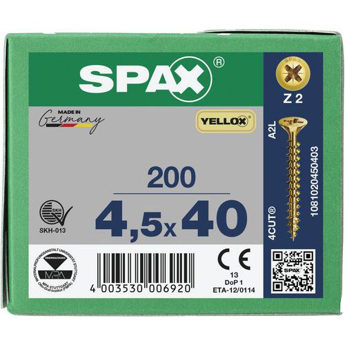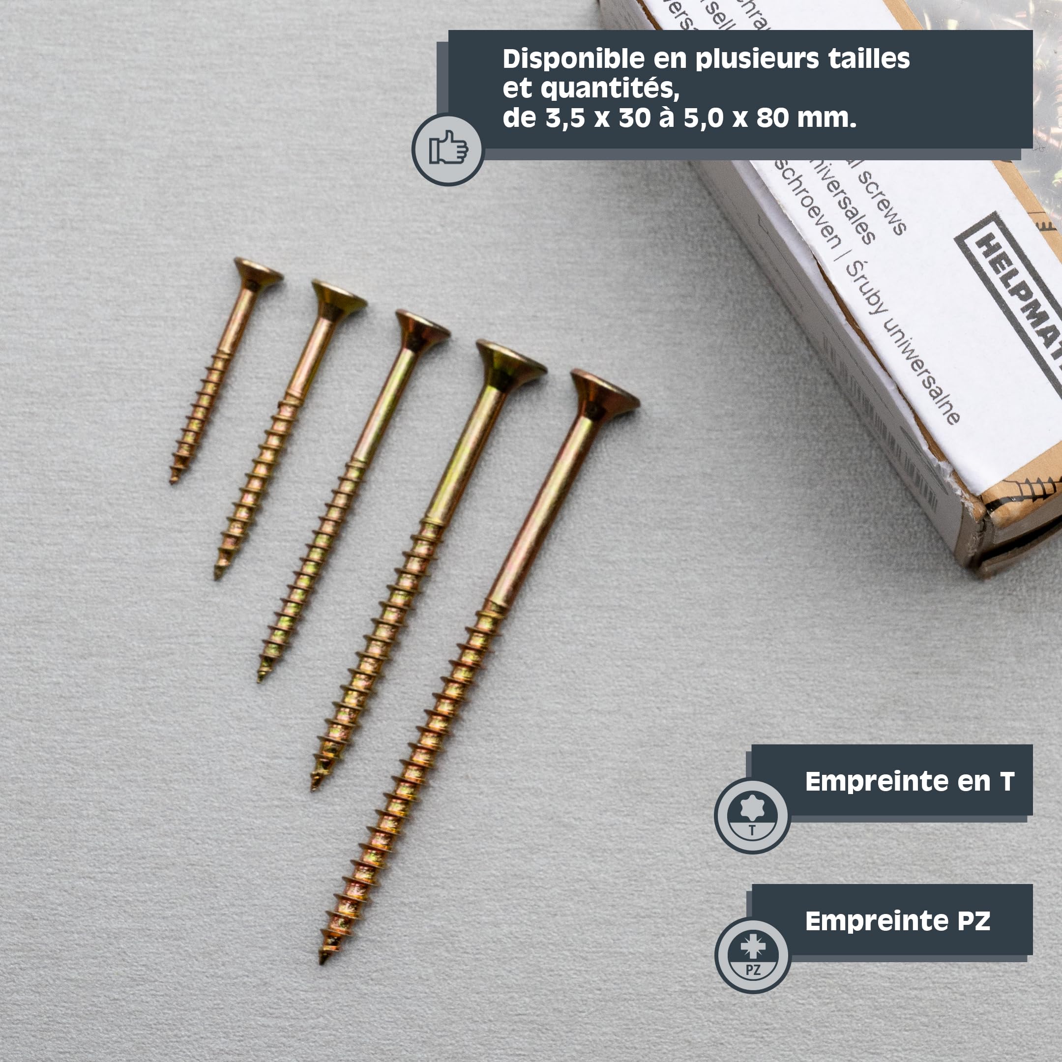 Les vis universelles HELPMATE sont multifonctionnelles et conviennent à de nombreux domaines d'application. Vis bois et agglomeré savis vba Inox A2 Noir Tête fraisée TF Pozi 4X35... Nous vous proposons un choix varié d FILETAGE PARTIEL : Le filetage partiel permet de serrer rapidement la pièce supérieure sans laisser de fente. REMPLACEMENT EN FONCTIONNEMENT : La tête fraisée permet un enfoncement affleurant et lisse de la vis et préserve en outre la surface De préférence à l'intérieur, ces vis résistent également aux environnements extérieurs protégés. UTILISATIONS POLYVALENTES : Les vis universelles HELPMATE sont idéales pour assembler deux éléments en bois, que ce soit à l'intérieur ou à l'extérieur sous abri Ne laisse pas d'espaces inesthétiques dans 2 éléments à assembler Elles conviennent particulièrement bien au bois, au plastique ou encore à la maçonnerie avec une cheville. PAS DE PRÉ-PERCAGE : Travailler sans éclater ou fendre le bois de construction grâce à la pointe conique. Vis A Bois Helpmate Vis Universelles Mix Pack, Passivées Jaune, Entraînement PZ Cheville Beton VBA Vis bois agglo Inox A2 Tête fraisée TF 4X35 Filetée sur 30 TORX T20... VBA Vis bois agglo Premium Tête fraisée TF Pozi N°2 4X35 Acier zingué