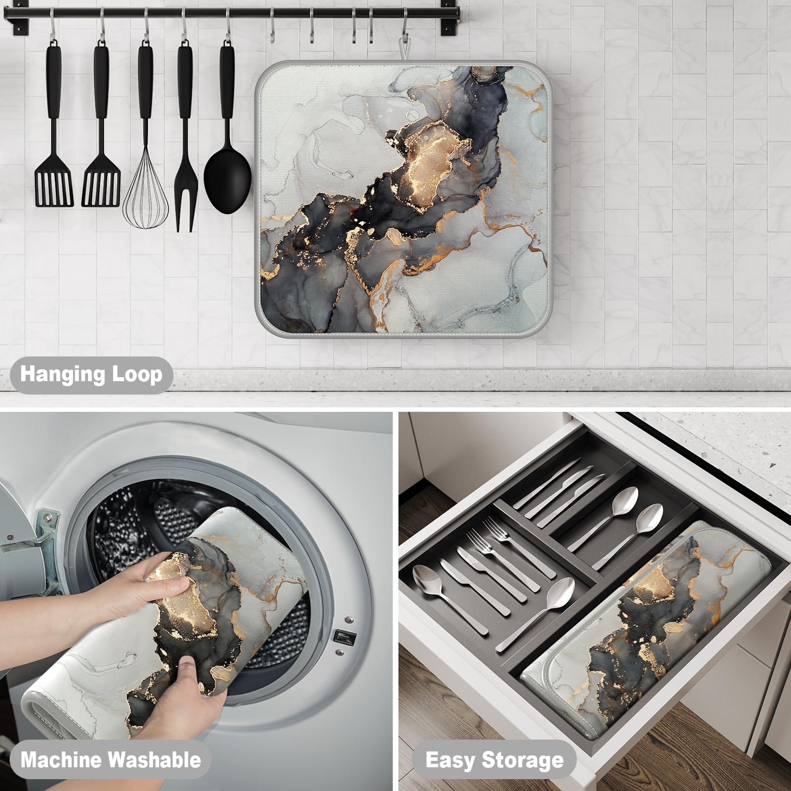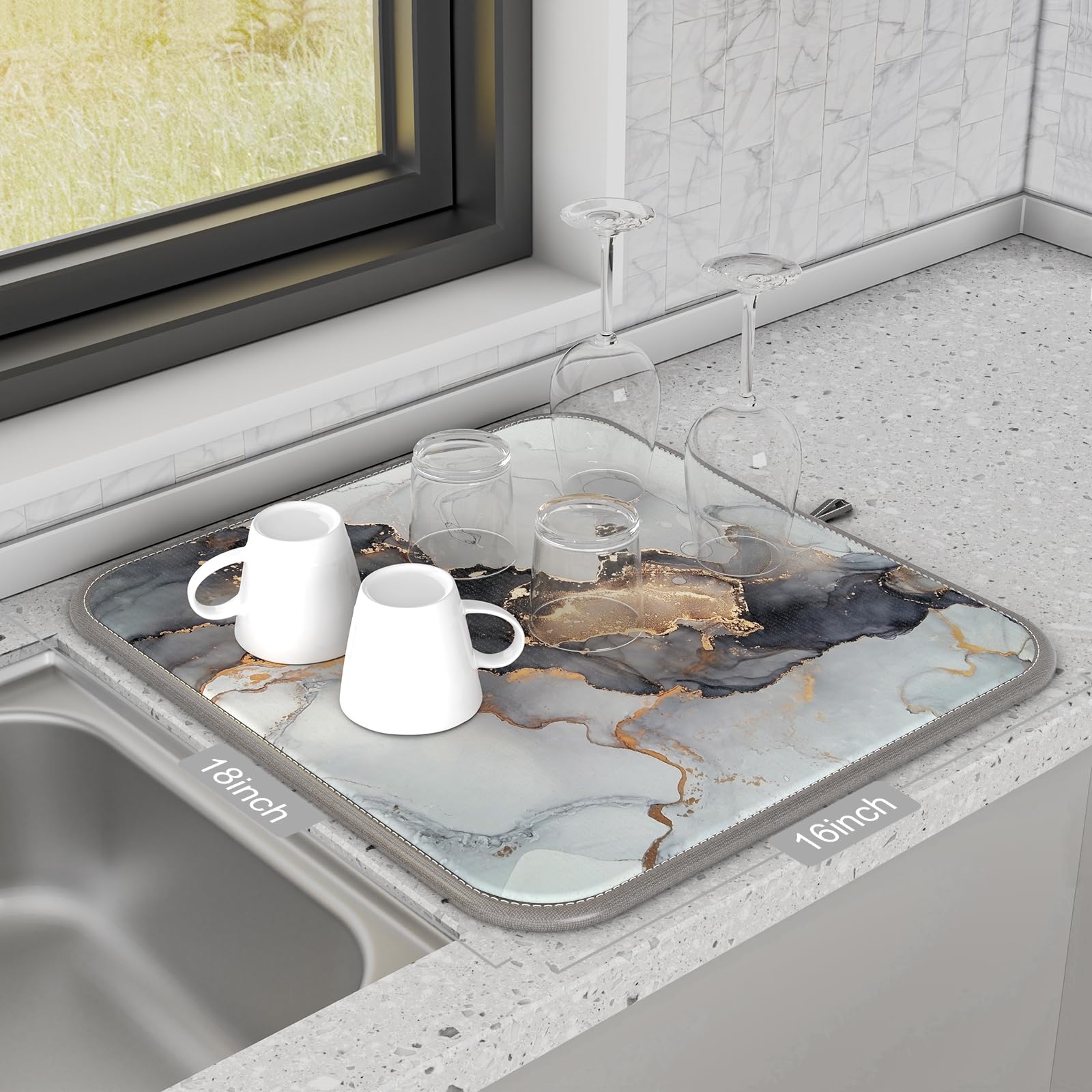 Dimensions : 40,6 x 45,7 cm ; 45,7 x 60,9 cm. Nettoyage : lavable en machine ou à la main, séchage à l'air libre à l'ombre. Tapis égouttoir Vaisselle Microfibre S&T - 40,6x45,7cm Très absorbant l'eau : fabriqué à partir de terre de diatomées naturelle et sûre, il a une excellente capacité d'absorption et une capacité de séchage rapide. Il peut absorber la majeure partie de l'humidité en quelques secondes et évaporer rapidement l'humidité de la surface Occasion : tapis de drainage et de séchage multifonctionnel pour comptoir de cuisine, tapis de machine à café, absorbe rapidement l'eau, peut protéger le comptoir et la vaisselle, et peut également être isolé et repassé Tapis égouttoir Pas Cher Rnivvi Tapis De Séchage à Vaisselle, 40,6 X 45,7 Cm, Tapis De Séchage En Microfibre De Style Marbre Pour Comptoir De Cuisine, Tapis De Séchage Absorbant Pour Laver La Vaisselle, Tapis De Tapis Pour égouttoir Veuillez utiliser un détergent neutre doux Matériau : fabriqué en polyester, éponge composite et satin de coton, réversible, absorbant, séchage rapide, garde la table de cuisine sèche et bien rangée Dimensions : 40,6 x 45,7 cm ; 45,7 x 60,9 cm Dimensions : 40,6 x 45,7 cm ; 45,7 x 60,9 cm Matériau : fabriqué en polyester, éponge composite et satin de coton, réversible, absorbant, séchage rapide, garde la table de cuisine sèche et bien rangée Caractéristiques : la surface est fabriquée en polyester absorbant et en éponge composite intermédiaire, elle peut absorber l'eau...