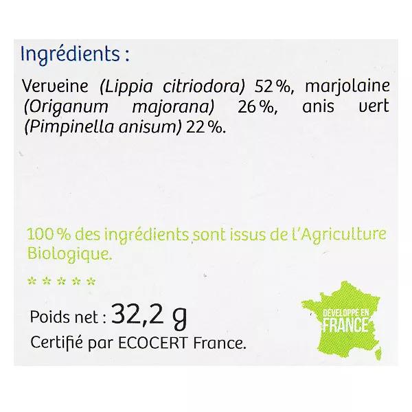CONSEILS DE PRÉPARATION : Savourez une tasse de notre infusion bio à la verveine après le repas du soir ou au coucher. Pour une dégustation idéale, laissez infuser entre 3 et 5 minutes pour permettre aux plantes de libérer pleinement leurs saveurs. La verveine facilite la relaxation en aidant à diminuer les tensions et l’agitation. Nos emballages sont 100% recyclables, composés de 80% de fibres recyclés et imprimés avec des encres végétales. VITAVEA BioNutrisanté Infusion Froide Jambes Légères saveur Cerise en Inspirées par l'herboristerie et d'origine naturelle, nos infusions sont développées en France, et mêlent des plantes complémentaires qui répondront à tous vos besoins. Conformément à la charte agriculture biologique, nos infusions sont formulées sans arômes, ni colorants ni conservateurs. Nos formules bien-être sont développées par nos experts dans nos laboratoires en Vendée, dans le respect des processus de fabrication et de qualité. L'anis vert ( pimpinella asinsum) vient compléter le mélange en ajoutant son goût unique et agréable. L’anis vert complète la formule en y apportant une touche de fraîcheur. Laissez-vous emporter par les arômes et offrez-vous un instant de sérénité. Panda Tea Vitavea BioNutrisanté - Infusion Sommeil BIO 100% Naturelle | WhichOne Tisane Sommeil Laisser infuser 3 minutes pour permettre aux plantes de libérer pleinement leurs saveurs, et jusqu'à 5 minutes selon l'intensité désirée., 3 tasses par jour. Infusion Sommeil BioNutrisanté : Retrouvez des Nuits Tranquilles et Régénératrices Notre infusion réunit des ingrédients naturels méticuleusement choisis pour leurs vertus apaisantes et relaxantes : La verveine, une plante renommée pour ses bienfaits, prépare votre corps au repos en favorisant la relaxation et en réduisant les tensions et l'agitation. Elle vous aide à vous... Pharmacie du Centre Albert, médicaments et parapharmacie en ligne INFUSION SOMMEIL BIO : Rythmes de vie intenses, stress passager, difficultés d’endormissement, réveils nocturnes … Différents facteurs peuvent perturber le sommeil, ce qui impacte la qualité de vie. FABRICATION RESPONSABLE : BioNutrisanté s'engage à réduire son empreinte écologique. Les informations ci-dessous s'appliquent à chaque unité du pack Laboratoires Nutrisanté, 85612 Montaigu - France Ingrédients Verveine* (Lippia citriodora) ; marjolaine* (Origanum majorana) ; anis vert* (Pimpinella anisum) * ingrédient issu de l’agriculture biologique Mode d'emploi Mettre 1 sachet dans une tasse et verser de l'eau frémissante. Nos ingrédients sont cultivés sans l'utilisation de pesticides, garantissant une infusion naturelle, sans additif, conservateur ou arôme artificiel.