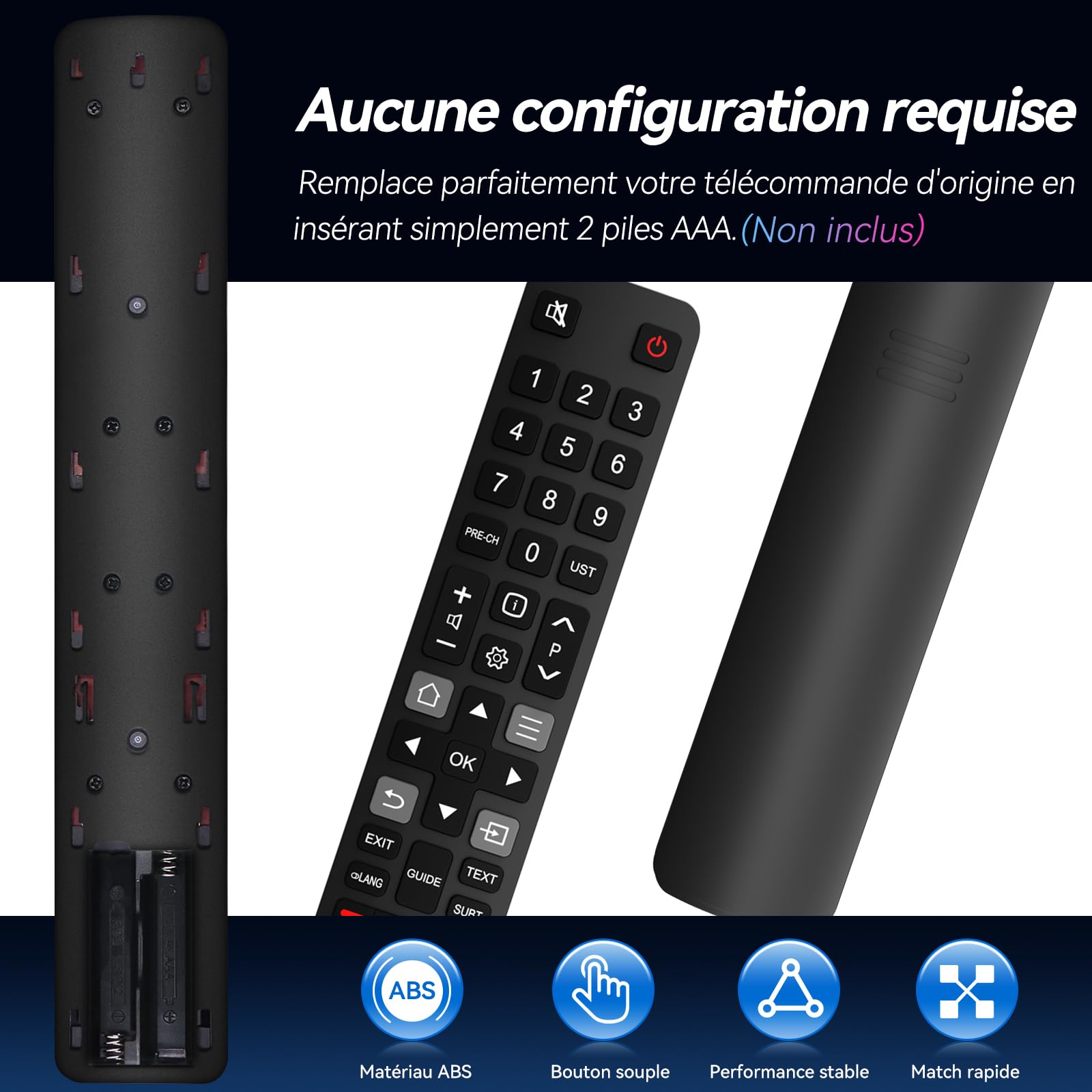 Télécommande de rechange TCL Thomson 4K UHD LCD LED Smart TV ARC802N RC802N YUI1 32HD5506 43UC6406 49UC6306 49UC6406 55UC6406 65UC6406 55EP660 55EP680 60EP60 65DC7., 60 U4 9P6046 U49S7096 65DC766 65EP640 65EP660 65EC780 75EP660 U43P6046 U49C7026 Telecommande Thomson Télécommande De Remplacement - FIDELIO TCL Et Thomson | Télécommandes De Remplacement Télécommande Thomson Tv ), idéale si votre télécommande d'origine Thomas doit être remplacée. Parfaite pour tous (enfants, adultes, personnes âgées, etc. La télécommande TCL Thomson RC802N est parfaite pour remplacer une télécommande Thomson TV ancienne ou endommagée. C'est idéal si votre télécommande d'origine TCL Thomson doit être remplacée. Télécommande Thomson : Télécommande infrarouge , Correspondance exacte , Connexion rapide , Performance stable Plan de garantie à vie - Une télécommande de haute qualité répond à vos besoins et offre une garantie à vie. Télécommande TCL : 1., Remplacement parfait : Télécommande de rechange TCL Thomson, mais la fonction est 100 % identique à la télécommande d'origine et couvre toutes les fonctions de la télécommande d'origine., 2., 100 % compatible : Compatible avec la plupart des modèles de téléviseurs TCL Thomson., 3., Matériau ABS : Le design léger et ergonomique le rend très confortable., Convient à tous., 4., Aucune configuration requise : Branchez la batterie et utilisez-la immédiatement., 5., Envoi rapide : entrepôt local Amazon livraison directe. Cette fonction correspond à 100 % à la fonction d'origine. Rc802N Universal Fernbedienung Pour Tcl 4K Uhd Lcd Led Smart Tv[J789... Prise en main facile - Le design léger et ergonomique le rend très confortable. Remplacement Telecommande TCL ARC802N RC802N pour Thomson TCL Smart TV