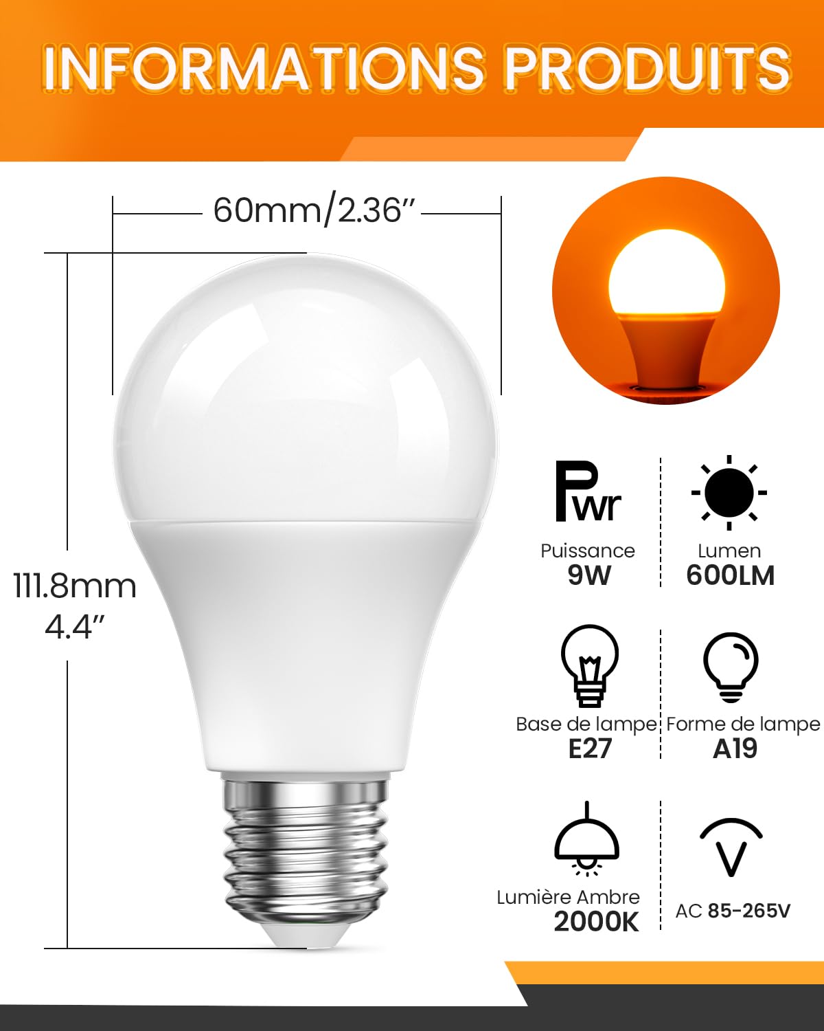 Ces douces ampoules à l'éclat ambré conviennent parfaitement aux lampes de chevet, éclairages de lecture, chambres d'enfants ou de bébé, etc. Ampoule LED A60 9W E27 6500K lumère blanche - NGELEC | Offce... Crée un environnement confortable et relaxant pour votre famille. Ampoule LED 9W peut remplacer ampoule à incandescence 60W, permettant d'économiser jusqu'à 90% d'énergie et d'électricité et de réduire la fréquence de remplacement, offrant ainsi de grandes économies sur la consommation d'énergie que l'on peut utiliser pour les lampes de chevet ou les veilleuses. Ampoule Led E27 60w Wivety Ampoule De Sommeil Avec Télécommande, LED Ampoule Ambre E27 Blocage De La Lumière Bleue 1600K A60, 9W Pour La Chambre De Bébé, La Chambre à Coucher (paquet De 4 Ampoule E27 60w LXSINO Lampe de livre ambre, blocage de la lumière bleue, lampe 【Ampoule LED 2200K】Émet 600 lumens douce et chaleureuse pour réduire la fatigue oculaire, sans éblouissement, sans scintillement, protégeant efficacement votre vue et garantissant une expérience d'éclairage confortable. Livré chez vous au meilleur prix : Aurahome Ampoule LED E27 2000K, Ambre Chaud Blocage de la Lumière Bleue Veilleuse LED 9W (60W Équivalent Lumière Chaude Doux 【Ampoule Sans Lumière Bleue】Ampoule LED 2000K ambre chaud aide à réduire la lumière bleue pour stimuler la production de mélatonine le soir et réduire la fatigue oculaire. Ampoule Sans Lumière Bleue Ampoule décorative cabossée 5W 2000K E27 ambre Ampoule LED 2000K ambre chaud aide à réduire la lumière bleue pour stimuler la production de mélatonine le soir et réduire la fatigue oculaire. Elle peut être utilisée sur les lampes de chevet ou les veilleuses et crée une ambiance apaisante lorsqu'elle est utilisée dans une chambre à coucher, une chambre d'enfant ou n'importe quel autre espace. 【Améliorer Qualité du Sommeil】Elle émet lumière douillette 2000K, créant une atmosphère confortable pour votre chambre à coucher. Fournit suffisamment de lumière pour permettre à vos yeux de lire et de travailler dans un environnement plus confortable, peut être utilisé pour les lampes de lecture. 【Économie d'énergie 】Ampoule LED 9W peut remplacer ampoule à incandescence 60W, permettant d'économiser jusqu'à 90% d'énergie et d'électricité et de réduire la fréquence de remplacement, offrant ainsi de grandes économies sur la consommation d'énergie que l'on peut utiliser pour les lampes de chevet ou les veilleuses.