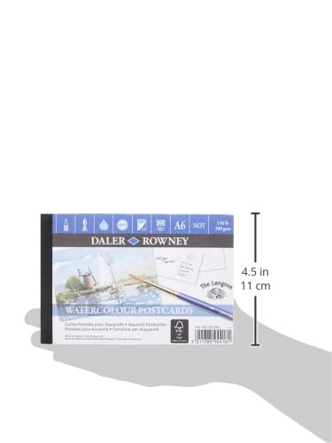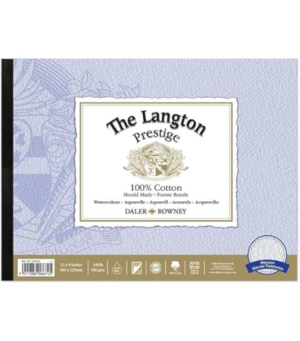 Daler-Rowney Langton Bloc de papier aquarelle pressé à froid 14,8 x 10 cm 12 feuilles 300 g/m² Idéal pour une utilisation avec de l'aquarelle et de la gouache. Parfaitement dimensionné à l'intérieur et à l'extérieur avec une taille synthétique, les lavages sont magnifiquement rendus et conservent une répartition uniforme sur toute la surface. Chaque feuille est imprimée au verso avec des lignes pour une adresse et un espace pour un message, idéal pour poster des œuvres à vos amis et à votre famille. Daler-Rowney The Langton Prestige Bloc de papier aquarelle et Daler-Rowney Aquafine Bloc de papier texturé pressé à froid pour... Papier Coton Aquarelle Daler-Rowney The Langton Prestige - Blocco Di Carta Pressato A Caldo Per Acquerelli E Guazzo, 300 G/m², 30,5 X 22,9 Cm, Incollato Su Un Lato, 12 Fogli Bianchi Naturali, Ideale Per Artisti Papier Aquarelle A3 Ce bloc-notes Langton 12 feuilles, 300 g/m², pressé à froid, tout en offrant une performance supérieure pour l'aquarelle et la gouache, est également excellent pour les acryliques, les encres et une variété de supports secs. Papier polyvalent offrant une performance supérieure pour l'aquarelle et la gouache mais également excellent avec l'acrylique, les encres et une variété de supports secs Le travail du stylo, de l'encre et du crayon fonctionne également parfaitement grâce à la grande stabilité du papier Langton et à sa résistance à la déchirure. Le papier certifié FSC est sans acide, couleur stable et dispose d'un traitement fongicide pour des propriétés d'archivage supplémentaires. Moule fabriqué sans acide, blanc naturel, papier fabriqué de manière durable