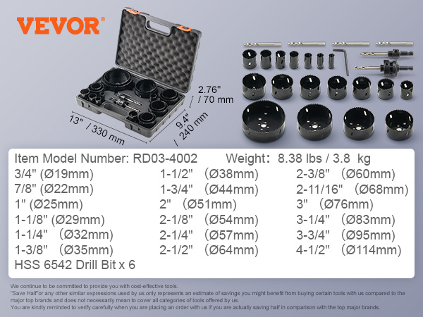 La corona para madera con un adaptador y un taladro central para facilitar el montaje y desmontaje. Scie Cloche Bois VEVOR Scie Cloche Bi-métal Coffret De Scie Trépan Avec 18PCS Lames De Scie Cloche 100mm • Domaines d'application: plomberie (carreaux de céramique - fonte), travail des métaux (acier inoxydable, aciers à haute densité, aluminium) matériaux composites (plastiques, matériaux sandwichs, bureau, fibre de verre, panneaux de bois revêtus de plastique). 【Diseño antideslizante】Nuestro perforador adopta un diseño de mango triangular, lo que hace que el producto sea más estable y firme, y puede prevenir eficazmente el deslizamiento durante el uso, lo que lo hace más cómodo de operar y más seguro de usar. La profundidad máxima de corte es de 25 mm. Especificaciones Material: acero al carbono Diámetro del cortador de agujeros: 19 mm-127 mm en diferentes tamaños Peso: 915 g Profundidad de corte: 25 mm Información de embalaje 11 *Hoja de sierra perforadora 2 * mandril 3* perforar 1 * llave Allen 1 * caja de almacenamiento 1 * Manual de usuario Nota: 1., Inserte el husillo desde abajo en la punta de la hoja de sierra., 2., Recuerde agregar refrigerante al cortar materiales metálicos., 3., El material a cortar debe ser sólido y libre de vibraciones., 4., Si encuentra alguna anomalía durante el trabajo, deje de trabajar inmediatamente., 5., Adecuado solo para adultos, asegúrese de usar el equipo de protección adecuado cuando lo use., ❀ Recordatorio cálido ❀ 1., El producto contiene piezas pequeñas, no permita que los niños jueguen con él para evitar que se lo coman accidentalmente., 2., Permita un error de 0,1-0,3 cm debido a la medición manual. 【Material de alta calidad】 La sierras de corona taladro de está hecha de material de acero al carbono de alta calidad. Se puede utilizar para taladros de banco, taladros manuales, taladros eléctricos de litio y otros adaptadores. Su satisfacción es nuestro mayor objetivo, si tiene alguna pregunta, no dude en contactarnos., (^_^) 【Corte rápido】Nuestra corona para madera tiene un diseño de orificio alargado en el costado, que puede descargar rápidamente virutas de corte durante el corte, acelerando en gran medida la velocidad de corte, mejorando efectivamente la eficiencia del trabajo, y los orificios cortados son limpios y lisos con una superficie lisa. La gamme de nos scies cloches en acier est adaptée pour percer des trous dans le bois, le stratifié, la tôle et le plastique. Kit complet Coffret 12 scies... • Géomètrie agressive des dents (4 TPI) avec ouvertures Plug Jack pour une éjection rapide des matériaux. Coffret scie cloche - kwb - 599000 - 7 pièces - Acier inoxydable - 6,3 cm de diamètre - Bricolage