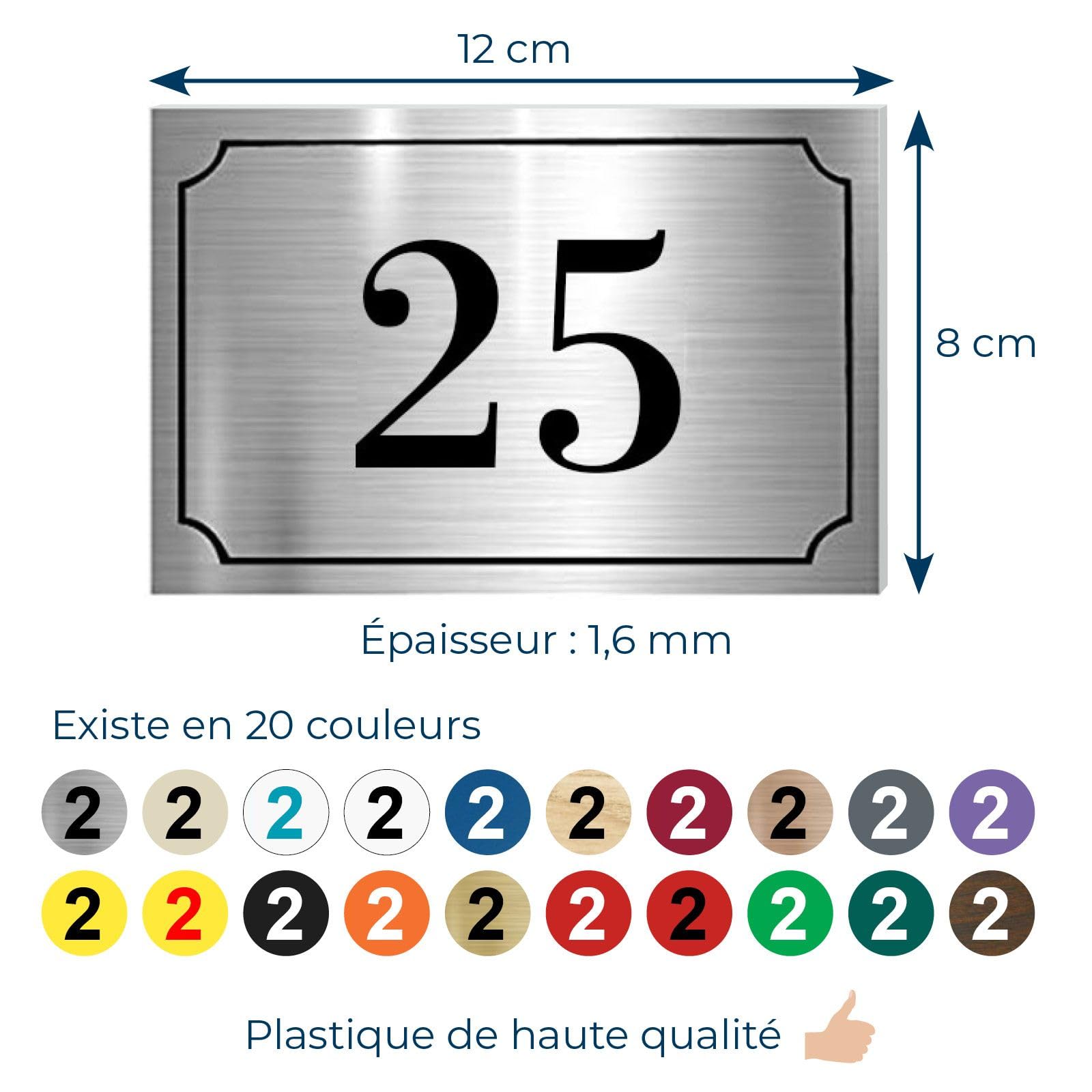 Plaque de boites aux lettres SYMBOLE personnalisée Nos experts de la gravure se chargeront de la fabriquer., Choisissez l'emplacement, Nettoyer Plaque format rond au diamètre de 60 mm à personnalr avec votre numéro de rue de couleur noire chiffres blancs. Plaque en plastique de 1,6 mm d'épaisseur, résistante aux intempéries et UV. Grâce à son adhésif, le numéro de rue pour boite aux lettres est très simple et rapide à installer Numéro Boite Aux Lettres Personnalisé Numéro Boîte Aux Lettres Personnalisable Rond 60 Mm Couleur Jaune Chiffres Noirs 3700923013206 Numéro Boite Aux Lettres Plastique Gravure laser inaltérable, résistante à l’eau, aux UV et au temps. Contrairement aux impressions, elle ne se décolore pas et résiste à l’usure, à l’eau et au soleil. Nous fabriquons vos numéros et plaques de boite aux lettres dans notre atelier de gravure et découpe laser en France. Choisissez les personnages et les noms à graver sur la plaque en plastique argent résistante aux intempéries. Plaque professionnelle personnalisée en PVC pour psychologue, sophrologue - 1 à 5 lignes de texte - Format 30 x 20 cm Il suffit de nettoyer la surface et de coller la plaque sans outil. Découvrez nos plaques de boite aux lettres personnalisables, 20 couleurs de plaques et de 1 à 3 lignes de texte. Choisissez le coloris de votre choix. Elles conservent leur aspect neuf de longues années. Personnalisez vos plaques et numéros de boîte aux lettres ! Plaque de boite aux lettres Family De 3 à 6 personnages y compris vos animaux de compagnie., 20 couleurs différentes. Découvrez nos numéros de boite aux lettres personnalisables, 20 couleurs et 5 formats différents. Créez facilement une plaque personnalisée pour votre boîte aux lettres avec les membres de votre famille. Description du produit Plaques et numéros de boite aux lettres personnalisables Cadrans de montre blanc chiffres noirs steampunk rétro 27 mm x2 - Un... Pourquoi choisir une plaque de boîte aux lettres gravée plutôt qu’une simple étiquette papier? Parce qu’une plaque gravée vous évite de perdre vos courriers ou colis. Collez fermement et c'est parfait !, ! Une fois votre personnalisation en ligne finalisée, nos équipes se chargent de graver votre texte avec précision pour un rendu premium. Ensuite, sélectionnez votre style d'écriture préféré. Découvrez nos plaques de boite aux lettres personnalisables avec plus de 30 symboles différents, 20 couleurs de plaques et de 1 à 3 lignes de texte. Quelles matières utilisez-vous pour les plaques ? Nos plaques sont fabriquées en PVC gravé au laser, résistant aux intempéries, aux UV et aux variations de température. Ajoutez une touche unique à votre boîte aux lettres avec nos numéros personnalisables de haute qualité. ✅ Matériaux Durables Plastique 1,6 mm d'épaisseur résistant aux UV et intempéries pour une longue durée de vie extérieure Personnalisez votre plaque de boîte aux lettres Family Personnalisez votre numéro de boîte aux lettres avec style Découvrez nos plaques de boite aux lettres personnalisables avec votre numéro de rue indiqué, 20 couleurs de plaques et de 1 à 3 lignes de texte. Peut-on choisir la couleur et la police ? Oui, vous disposez d’un large choix de coloris et de polices d’écriture pour un rendu parfaitement adapté à votre style et à votre boîte aux lettres. ✅ Gravure Laser Précise Fabrication française avec technologie laser pour un rendu net et durable