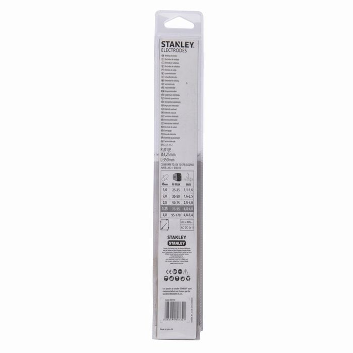 Electrodes Acier 3.2 x 350mm Boite de 3Kg / 102 PZ Baguettes MMA E6013 Stanley Black & Decker est un fabricant d'outillages de bricolage et de jardinage. Stanley 460932 Electrode acier 70 pièces. Stanley Black et Decker est un fabricant d'outillages de bricolage et de jardinage. Son souci quotidien est d... Electrode Acier ø3.5 Mm X L.350 Mm Stanley, 50 Pièces Electrodes type rutiles pour soudage Acier : épaisseur de toles a souder de 4 a 4,8mm, intensité de soudure recommandé entre 105 et 135 A, multi positions, branchement - Cliquez ici pour consulter notre catalogue de Stanley 460932 lot de 70 électrodes rutiles acier - ø 3,25 mm - l 350 mm - baguettes de soudure de marque STANLEY Souder des pièces en acier entre 4., 0 et 4., 8 mm d'épaisseur, tous les postes à souder à l'arc
