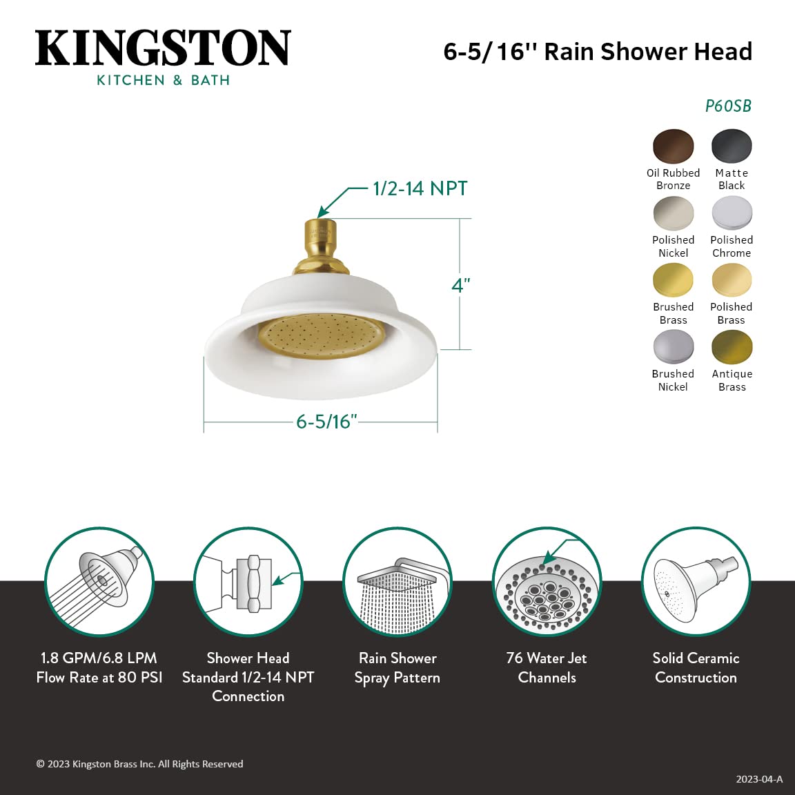 Construction en laiton massif et céramique ; pommeau de douche de 15,9 cm de diamètre ; 76 buses de pulvérisation individuelles ; le bras de douche mesure 30,5 cm de long et est fabriqué en laiton massif ; débit d'eau max 2,0 GPM/7,6 LPM à 80 PSI sur la pomme de douche ; conforme au titre 20 de la California Energy Commission Pommeau de douche en céramique et laiton Pomme de douche de 16,5 cm de diamètre VATOS Jouets de Bain avec poeau de Douche pour Enfants - Jouet de Tête de 20,3 cm de; 91 buses de pulvérisation ; motif gouttes de pluie; Bras de douche non inclus; Débit d'eau maximal de 7,6 l/min à 80 PSI sur le pommeau... Kingston Brass P60CK Pommeau De Douche Tournesol Victorien Avec Bras De Douche 30,5 Cm, Chrome Poli 76 canaux de jet d'eau