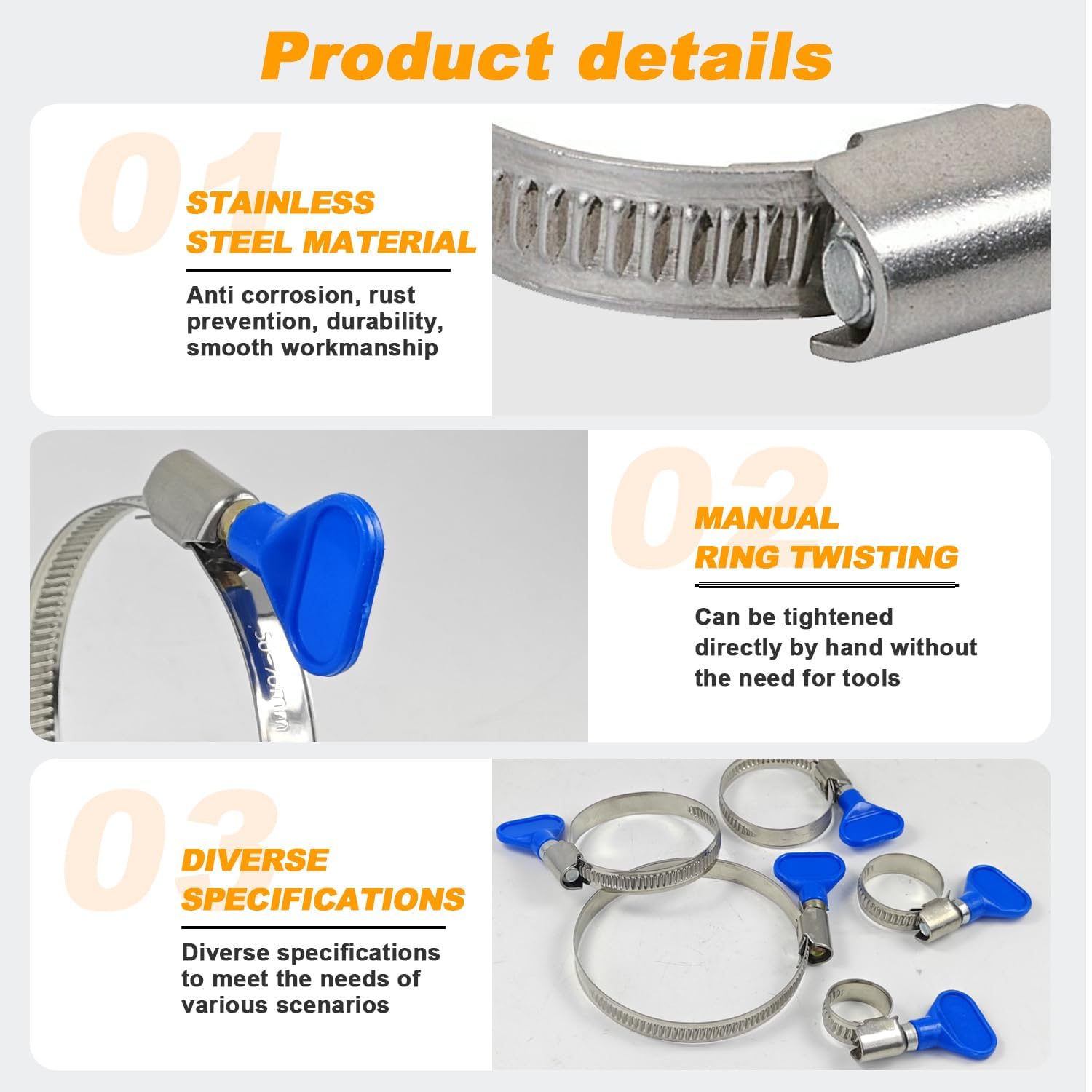 Idéal pour l'automobile, l'industrie, la marine, la signalisation, la maison et plus encore. Connectez sans effort des tuyaux et des flexibles de différentes... Tournez simplement la clé dans le sens des aiguilles d'une montre pour serrer et dans le sens inverse des aiguilles d'une montre pour desserrer., 3., Ces colliers de serrage uniques sont souvent utilisés pour sécuriser les conduits, les évents de sécheuse, les tuyaux de dépoussiérage, les tuyaux, les gros câbles, les tuyaux en PVC, etc. Emballer:25 × collier de serrageChoses à noter :Avant d'installer des colliers de serrage en acier inoxydable, veuillez vous assurer que la surface du tuyau est propre, exempte d'huile et de rouille pour garantir l'effet de serrage du collier de serrage et la stabilité du tuyau. AZISHA Collier De Serrage Inox - 15 Pièces 5 Tailles Mixtes 10-70 Mm Collier De Serrage Diamètre 70 Collier De Serrage Inox 25-40mm - 10 Pièces Collier Serrage - Réglable Collier Tubage 150 Ils assurent un maintien sûr, évitent les fuites et assurent une étanchéité parfaite. Le réglage est facile et sûr, ce qui le rend idéal pour les applications professionnelles et de bricolage. Idéal pour les applications haute tension dans divers domaines. Cinq tailles : Collier de serrage métallique réglable, avec cinq tailles différentes 10-16/16-25/25-40/32-50/50-70 mm, adaptées à différentes tailles et types de tuyaux. Ces pinces sont résistantes à la rouille et à la corrosion, garantissant des performances durables. 12 Pièces Collier De Serrage Inox Réglable Collier De Serrage Tuyau... Spécification:Matériau : acier inoxydableCouleur: argentCouleur du bouton : bleuPoids : 430gTaille : 10-16/16-25/25-40/32-50/50-70 mm.