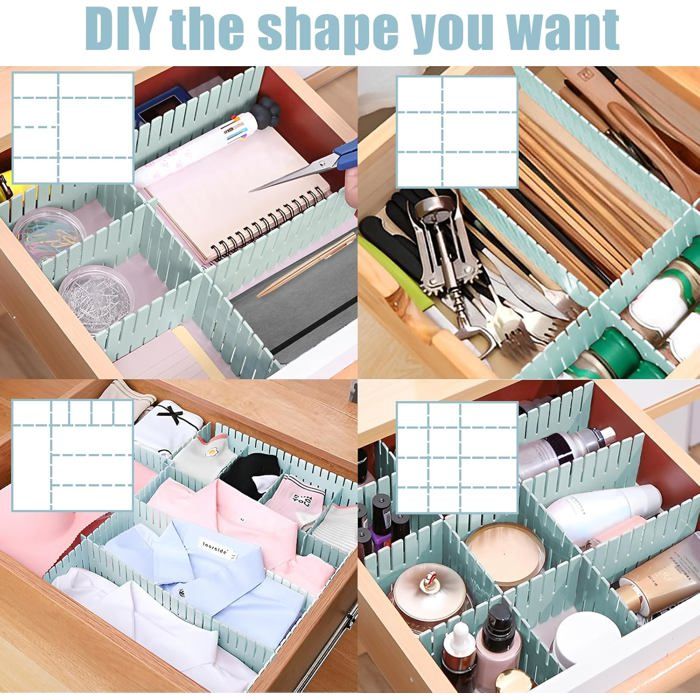 Glissière réglable et installation simple en un clic sans outils ni colle, les coussinets en mousse de caoutchouc adhèrent fermement sans laisser de traces ou de résidus. Ensemble de 8 pièces. Peut également être utilisé pour organiser des tiroirs, des placards, des vêtements, des sous-vêtements, des chaussettes. Ces grands organiseurs de tiroirs emboîtables peuvent être installés dans n'importe quel tiroir de votre maison. S’adapte parfaitement à vos tiroirs pour répondre à vos besoins de rangement. Rangez les tiroirs et les tables de chevet dans les chambres d'enfants, d’adolescents et d’adultes ; parfait pour ranger les tiroirs pleins à craquer, les ustensiles de cuisine, les fournitures de bureau, les outils de bricolage et d'artisanat, le désordre dans la salle de bain, etc. Le design extensible et rétractable s'adapte à la plupart des tiroirs et armoires de l'avant vers l'arrière et de bord à bord. Idéal pour votre commode ou un tiroir pour vêtements de bébé. Maintien sûr et solide, se fixe et reste bien en place, extrémités en mousse. Les séparateurs s'étendent à la longueur désirée et se fixent. Couleur légèrement crème. Séparateur De Tiroir Acrylique Lot De 8 Séparateurs De Tiroir Séparateurs de tiroirs profonds réglables pour ranger instantanément la cuisine, la salle de bain, la chambre ou un bureau. Diviseur De Tiroir Organiseur De Tiroir De Bureau, 8 Pièces En Plastique Séparateurs De Séparateur De Tiroirs Gardez vos espaces de rangement bien rangés et ordonnés 7,9 cm de hauteur, extensible de 27,9 cm à 49,8 cm. Facile à nettoyer : avec le design amovible... Rapide et facile à installer – Pas de matériel ou d'outils nécessaires. Dimensions : 9,9 cm de haut et réglable en longueur et en largeur de 26 à 43,4 cm. La tension forte exercée par les ressors fixe le séparateur et le garde bien droit. Utilisable à la maison, en appartement, copropriété, dortoirs, cabines, dans un camping-car et en camping. S’adapte parfaitement à vos tiroirs pour répondre à vos besoins de rangement., Matériau : plastique.