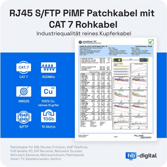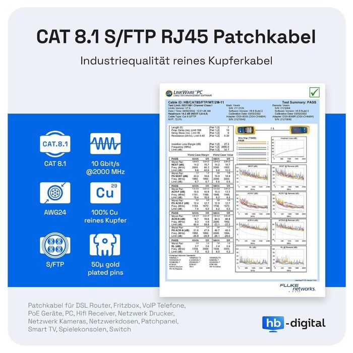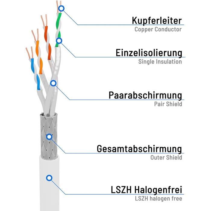 Le câble LAN est conçu pour le câblage sur le lieu de travail pour le raccordement des appareils ou comme câble de commutation dans les champs de manœuvre. Faites une excellente impression de la vitesse de transfert ultra-rapide jusqu'à 40 Gbit/s. Le blindage F/FTP (PIMF) et la gaine LSZH permettent de poser le câble comme vous le souhaitez. Le câble patch CAT 8.1 de qualité supérieure est équipé d'un transfert de données allant jusqu'à 40 Gigabit par seconde, ce qui permet un transfert de données jusqu'à 40 fois plus rapide que le câble CAT 5e précédent Câble patch de qualité supérieure de HB-Digital avec plage de fréquence de données de max. 2000 MHz. Le blindage F/FTP de qualité supérieure (PIMF) et la gaine... 1X 30M Câble Patch Cat6 S-Ftp Pimf Blindage Cat.6 Câble Réseau Rj45 Câble Ethernet Dsl Lan Gain de place grâce au manchon anti-pliage étroit et au type de connecteur flexible avec protection par ergot d'arrêt, Câble réseau CAT., 8., 1 noir – 3 mètres – Câble patch de catégorie 8 avec la meilleure qualité de la maison de HB-Digital. Câble réseau RJ45 1m Cat 8.1 F/FTP PIMF et LSZH Noir 2000Mhz La fréquence de transmission est jusqu'à 2000 MHz Le câble LAN Cat 8 (norme 8., 1, classe 1) avec 2 connecteurs RJ45 avec protection anti-torsion et levier de verrouillage s'adapte parfaitement aux différentes prises RJ45 ainsi que les câbles Cat., 5/5e Cat., 6/6a Cat., 7/7a Cat., 8., Le câble est donc la solution la plus flexible et la plus sûre pour le partage de données Contenu de la livraison : 1 câble réseau / câble Ethernet / câble LAN