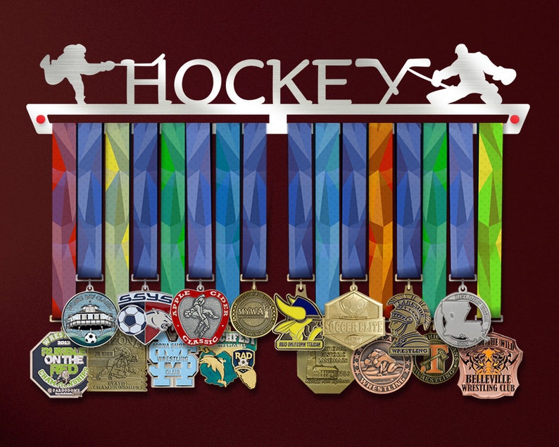 Le design unique de la barre de suspension vous permet d'espacer vos médailles en fonction du nombre que vous avez et non limité à un certain nombre de crochets. Les Allied Medal Hangers sont coupés dans de l'acier inoxydable brossé de la meilleure qualité à l'aide d'un laser extrêmement précis à haute puissance, ce qui nous permet d'obtenir des détails époustouflants dans nos designs., Fabriqué aux États-Unis. Tout le matériel de montage et les instructions d'installation simples sont inclus avec votre commande, y compris des entretoises de 6,35 mm qui offrent le décalage parfait par rapport à votre mur. Nous vendons nos porte-médailles depuis plus de 10 ans et avons reçu des milliers d'avis de clients comme vous qui sont ravis que leur cintre ait résisté à l'épreuve du temps et au poids de nombreuses médailles ce Hockey Medal Hangers Personalzed Medal Hanger Medal Hockey Gfts... Medal Hangers For Sale Wooden Medal Hanger Shelf With 19 Hooks Trophy Display Wooden Cintre De Medaille Affichez vos magnifiques réalisations avec fierté en utilisant ce magnifique porte-médailles alliées , Installation facile. Create a Custom Steel Hanger | Allied Medal Hangers | The Original Nous sommes une entreprise familiale depuis plus de 30 ans Pour une utilisation facile et un superbe attrait visuel , Qualité supérieure. Peut contenir 12 à 36 médailles – Cette taille est livrée avec des pinces à ruban pour raccourcir ou décaler la longueur de votre ruban