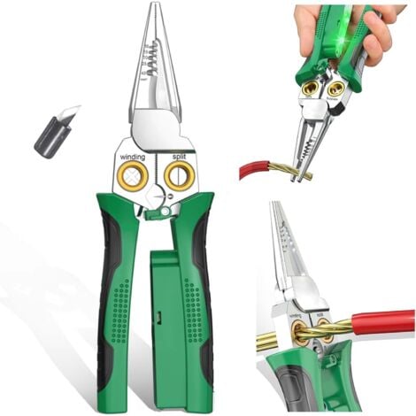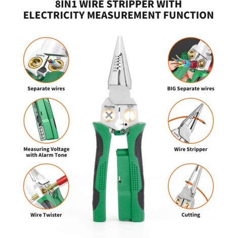 Pince à dénuder de précision : ces pinces à dénuder disposent de mâchoires de dénudage réglables pour un dénudage précis et propre, s'adaptant à différentes tailles de fils pour une utilisation polyvalente dans une large gamme de tâches électriques. Affûté avec précision avec différentes spécifications de diamètre de fil, ce qui peut contrôler avec précision la profondeur de dénudage... Design d'enroulement à quatre trous élargi : la pince est livrée avec un design d'enroulement à quatre trous élargi, facilitant l'alimentation des fils et un enroulement serré pour des connexions de fils précises et sécurisées, assurant un travail électrique propre et fort. Denudeur Fil Electrique Pince à Dénuder Avec Fonction De Mesure De L Construction robuste : fabriquée en acier vanadium, ces pinces à dénuder offrent une performance durable. Pince à dénuder 8 en 1 avec fonction de mesure de l'électricité - Pince à dénuder pour couper et... Pince à dénuder Portable SK5, câble Coaxial à lame RG59 RG6, pince à dénuder multifonctionnelle Fonction de fractionnement de fil tranchant : avec des capacités tranchantes de fractionnement de fils, ces pinces peuvent gérer des fils de différentes épaisseurs sans endommager le noyau, assurant des coupes propres pour divers projets électriques. Mesure de courant intégrée : combinant le dénudage de fil et les tests électriques en un seul outil, ces pinces sont équipées de compteurs de courant intégrés pour des mesures en temps réel, ce qui permet d'économiser du temps et d'améliorer la précision lors des travaux électriques.